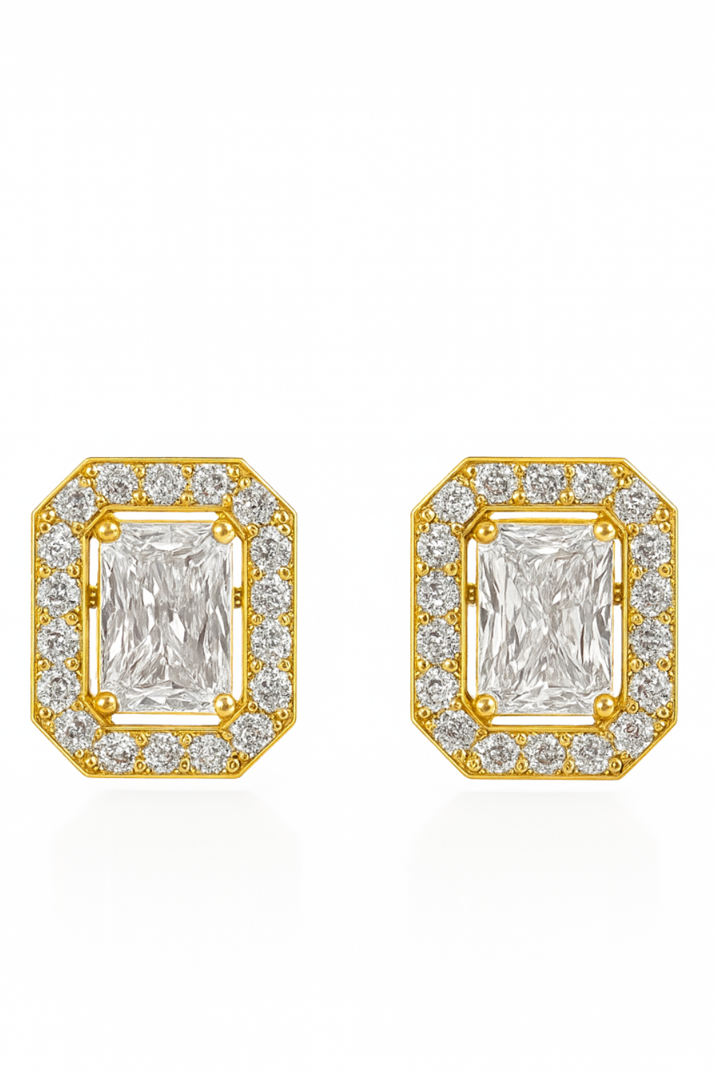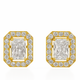 These are emerald-cut illusion diamond halo stud earrings in yellow gold, featuring a bold geometric double-halo of baguette and round-cut lab-grown diamonds.