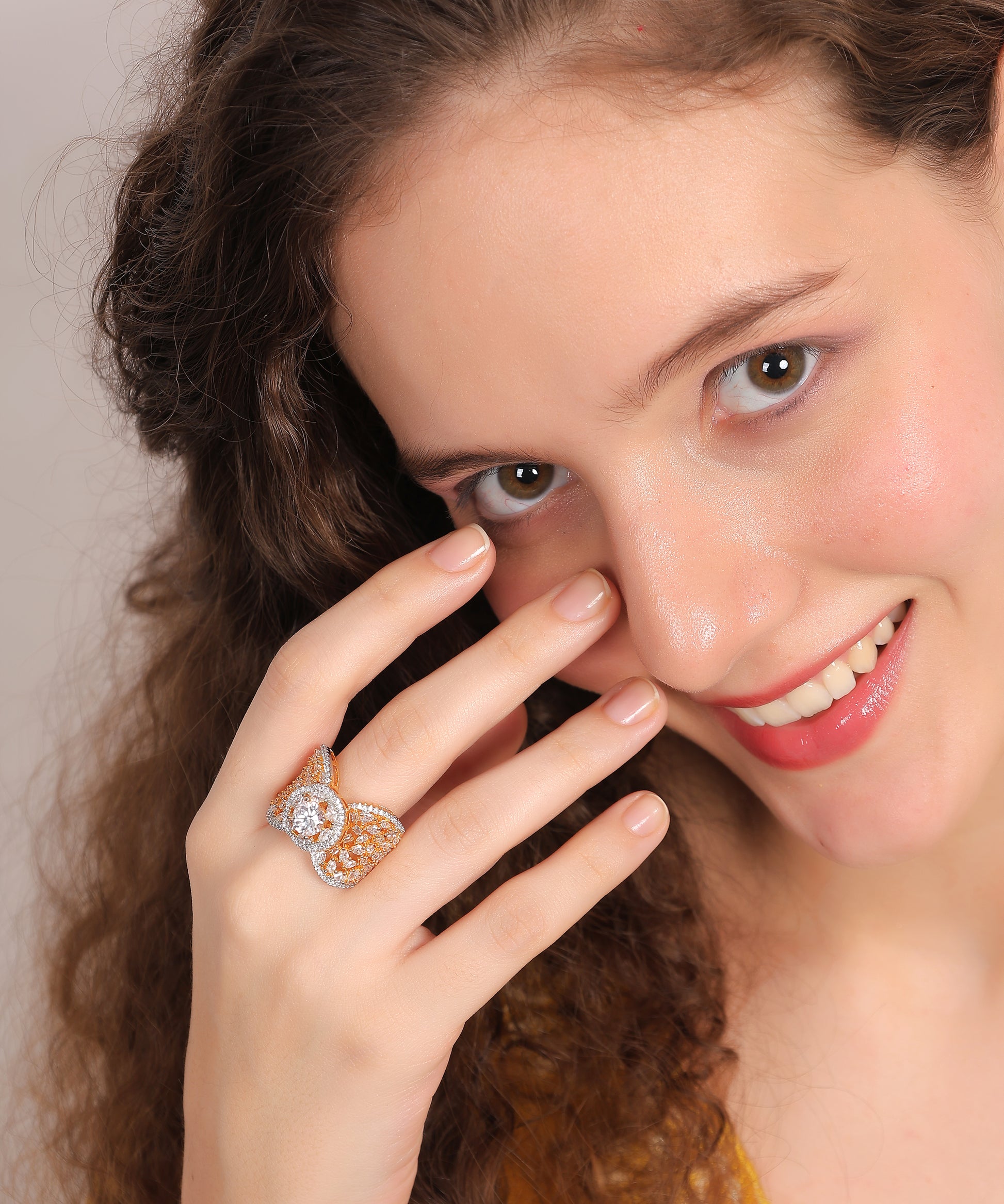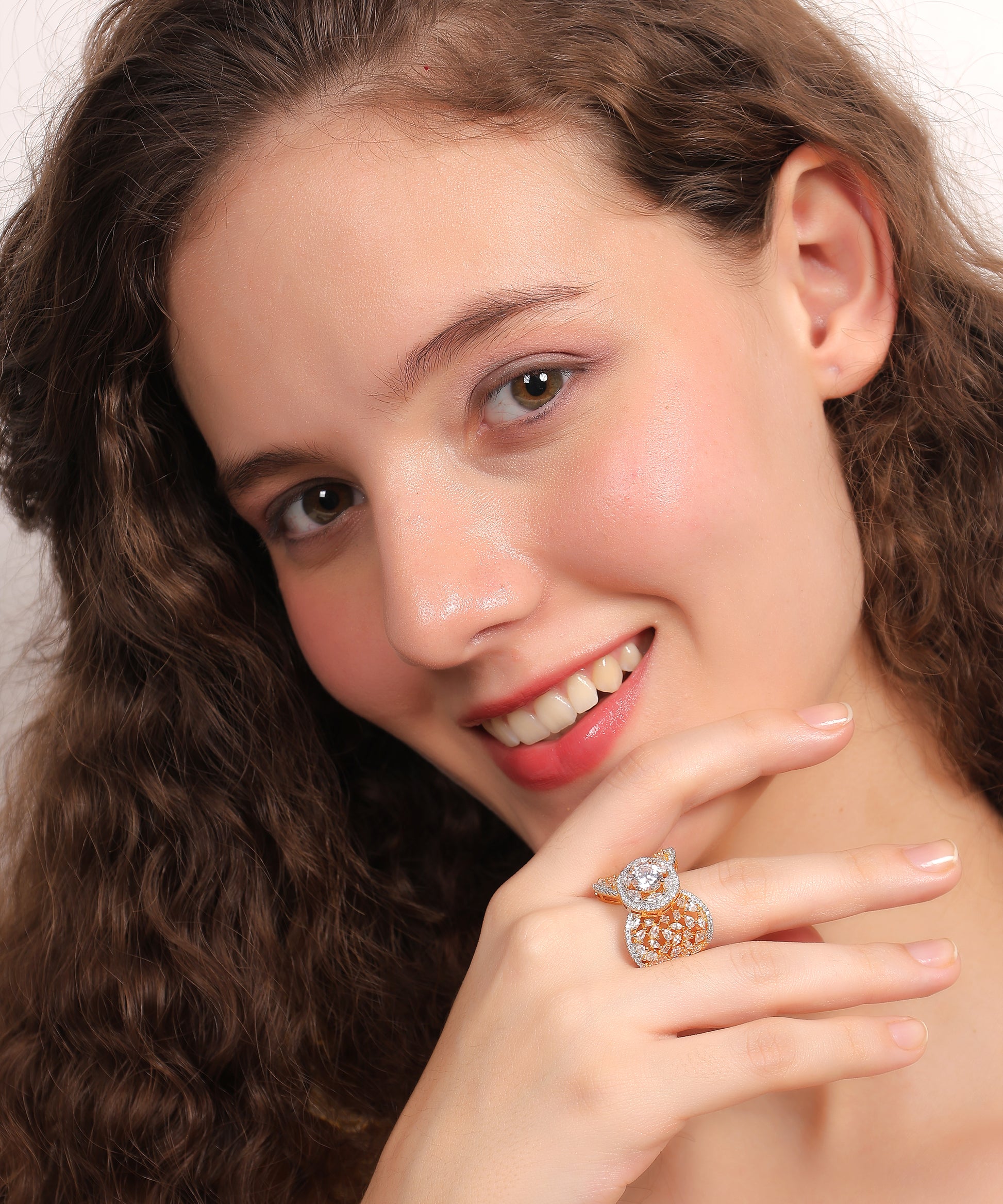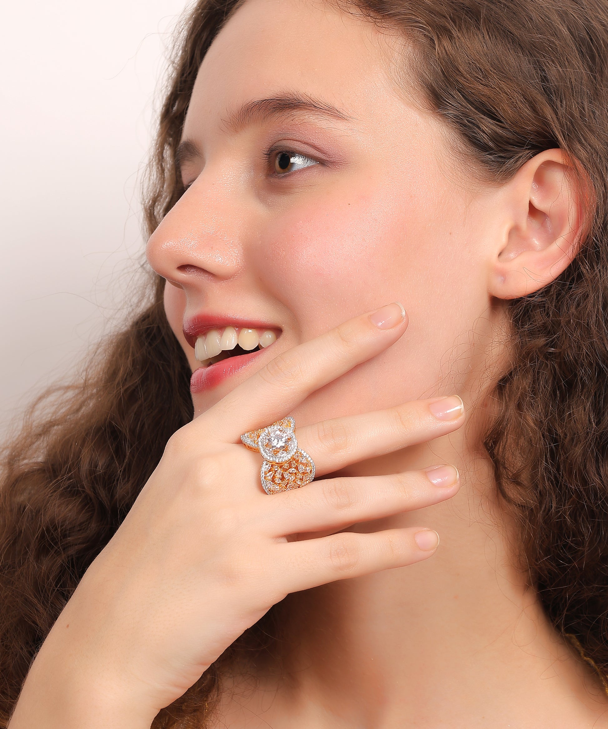 Auric Shine Ring exudes refined elegance with a graceful contemporary edge. Crafted in a luxurious dual-tone finish, this standout piece features a sculptural design accented with shimmering cubic zirconia stones. Its intricate form creates a captivating play of light and texture, making it the perfect statement accessory. Bold yet sophisticated, the ring seamlessly blends classic glamour with modern artistry—ideal for elevating both everyday and evening looks.