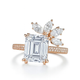 A striking emerald-cut diamond takes center stage in this rose gold ring, accented by a graceful cluster of marquise-cut diamonds arranged like blooming petals. The band, adorned with delicate pavé-set diamonds, adds extra brilliance, creating a perfect blend of modern elegance and floral-inspired charm.