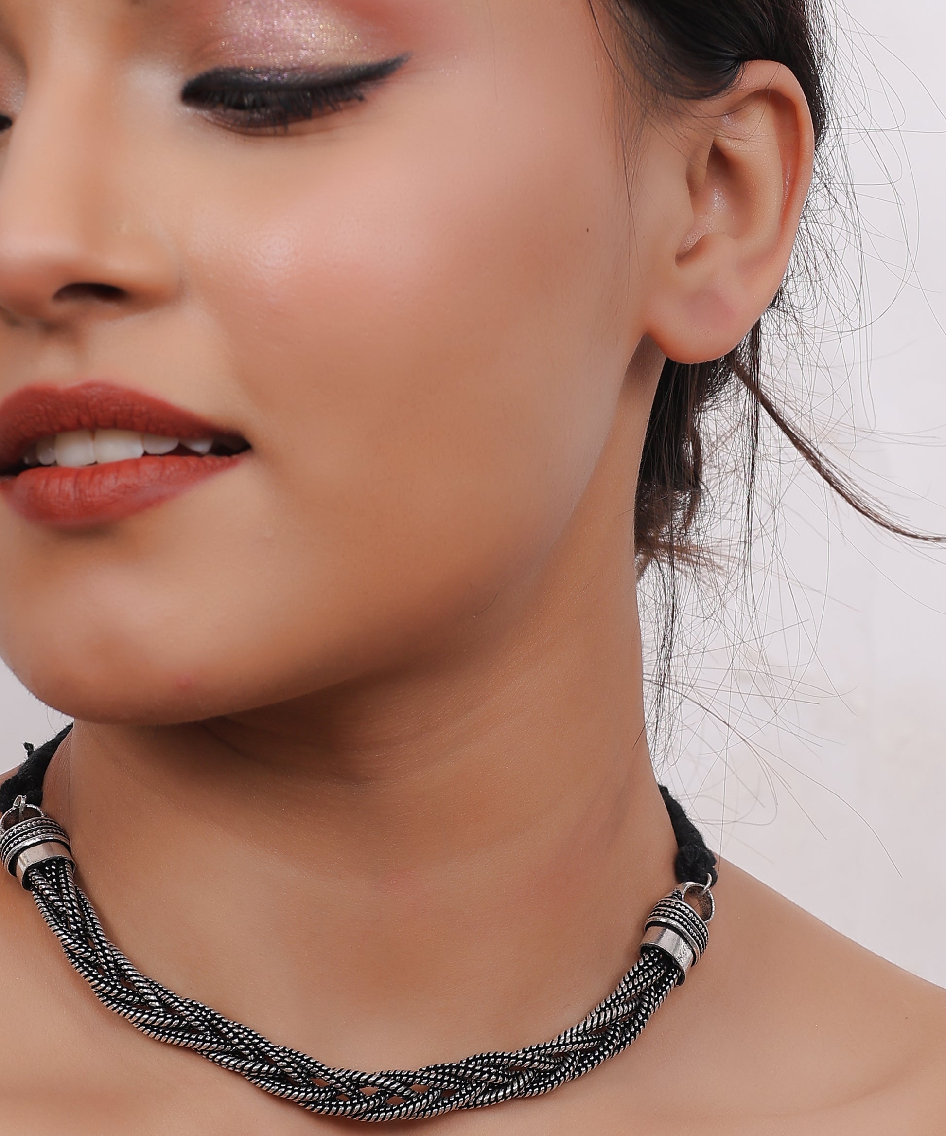 The Kalliski Oxidized Braided Twilight Choker a bold statement of elegance, this choker features intricately woven oxidized silver strands, blending antique charm with modern sophistication. The braided design exudes timeless allure, while the detailed craftsmanship ensures a striking yet refined look. Perfect for those who embrace distinctive style, this choker adds an edgy yet elegant touch to any outfit.