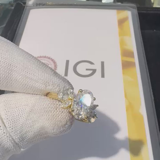 The Celeste Oval Bloom Diamond Ring is a masterpiece of radiance and grace. Centered with a dazzling oval-cut lab-grown diamond, this ring is beautifully framed by a floral-inspired cluster of marquise and round diamonds that bloom around the centerpiece. Set in luminous yellow gold, it captures both timeless romance and modern elegance — perfect for engagements or special celebrations.
