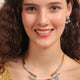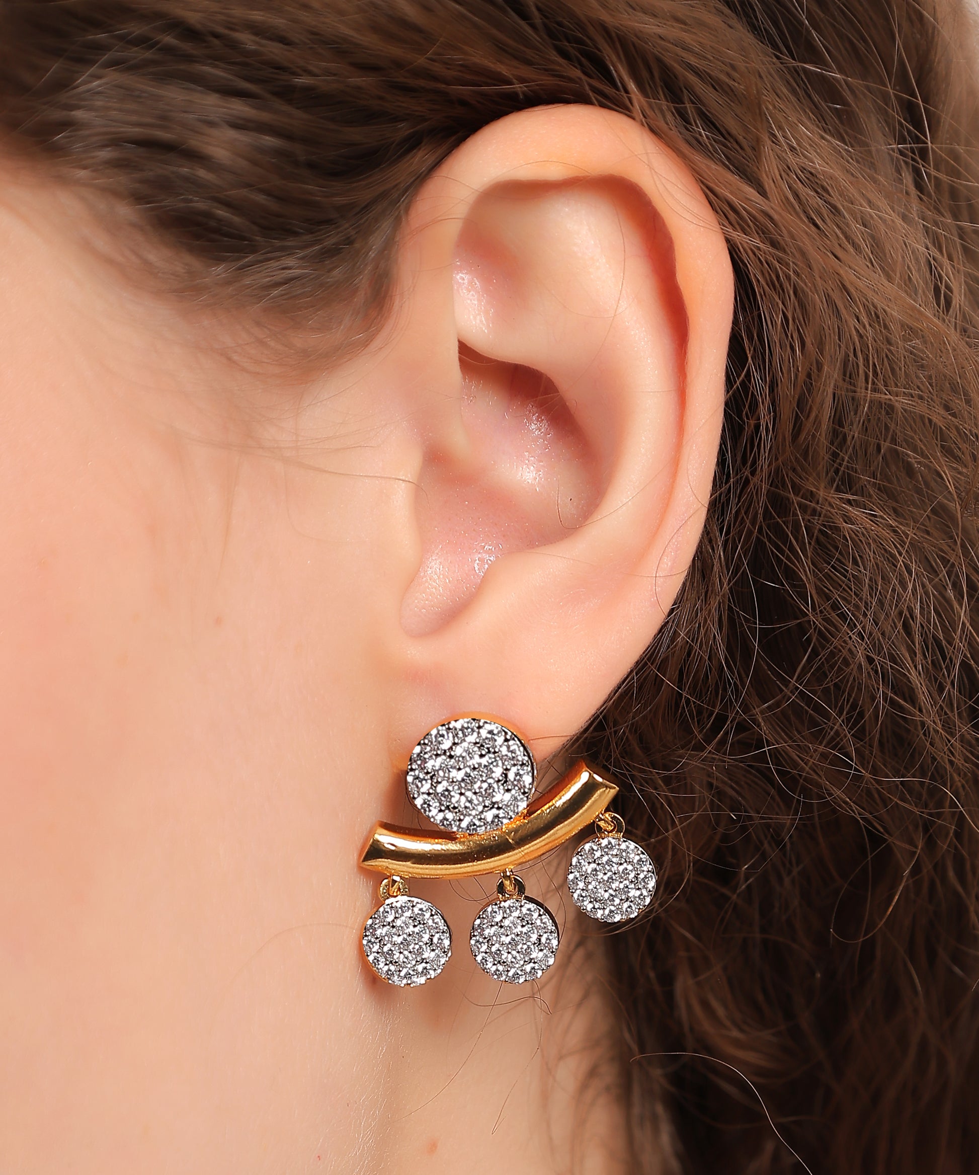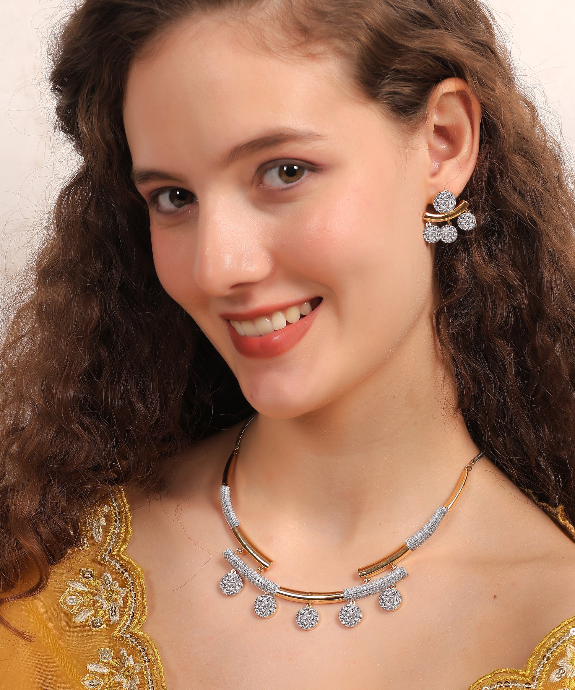 Celestial Grace Sparkling Set radiates modern elegance with a touch of timeless charm. Featuring a distinctive blend of sleek gold-toned bars and shimmering cubic zirconia-encrusted segments, the set is highlighted by five dazzling circular pendants that add a statement of sophistication. The matching earrings mirror this exquisite design, creating a harmonious and refined look.