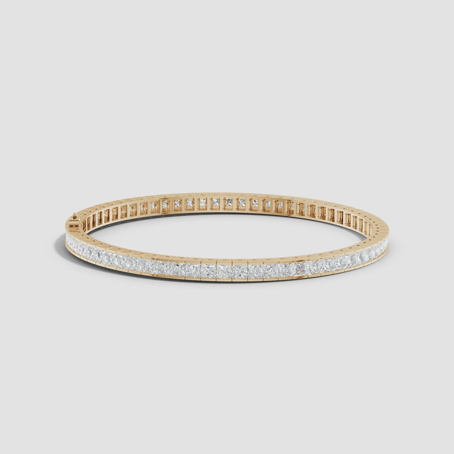 This stunning bracelet features a continuous row of princess-cut lab-grown diamonds set in rich yellow gold. Each diamond is precisely aligned in a sleek channel setting, creating a seamless band of brilliance and symmetry. The sharp, geometric facets of the princess cuts reflect light beautifully, offering a modern sparkle that complements the timeless appeal of gold. Elegant and refined, this bracelet is a perfect balance of contemporary sophistication and classic luxury — ideal for both everyday elegance and special occasions.