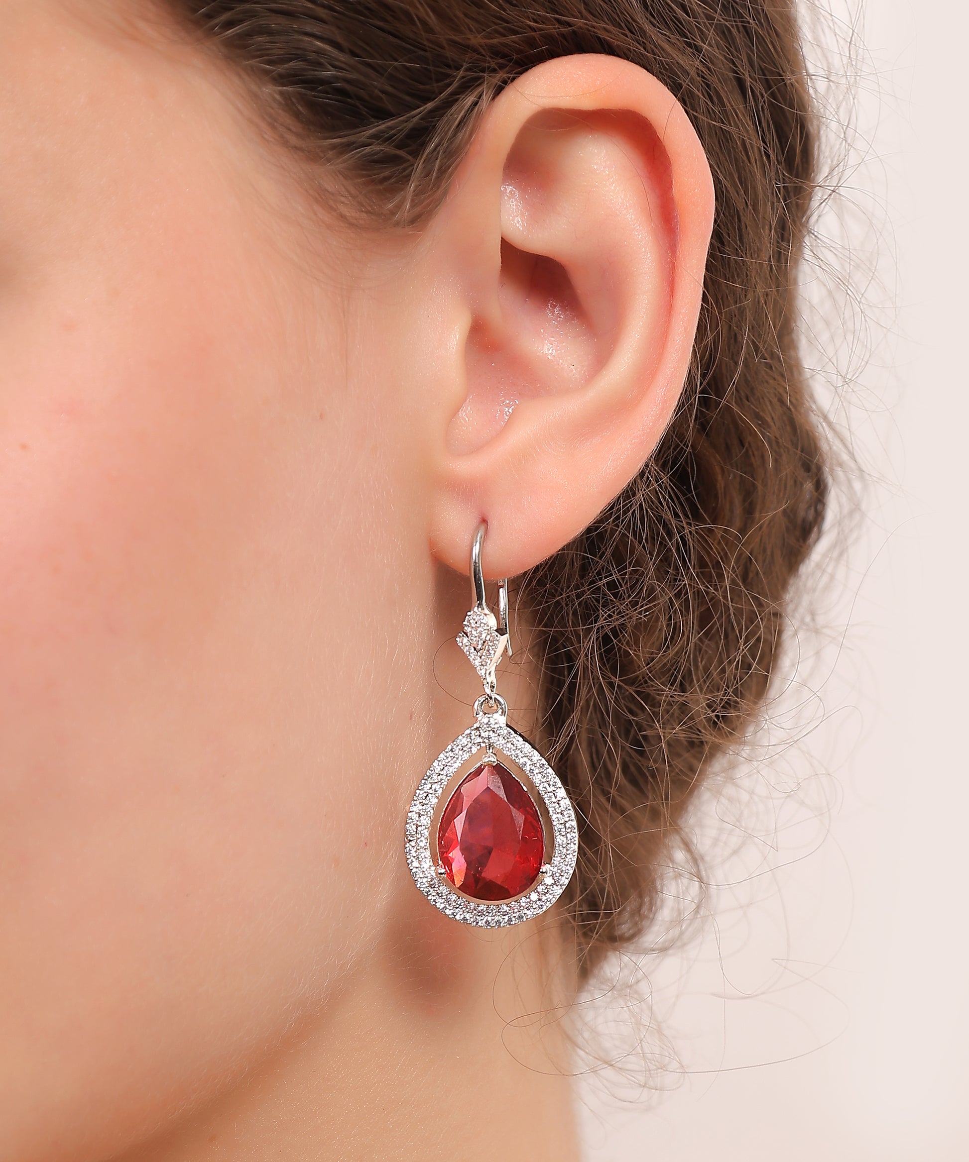 Crimson Teardrop Spark Earrings is elegant and captivating, these earrings feature a radiant teardrop-shaped crimson crystal encased in a delicate halo of shimmering cubic zirconia. Suspended from a diamond-shaped stud with intricate detailing, the design offers timeless glamour with a modern touch. Perfect for romantic evenings, festive occasions, or adding a pop of sophistication to any outfit.