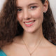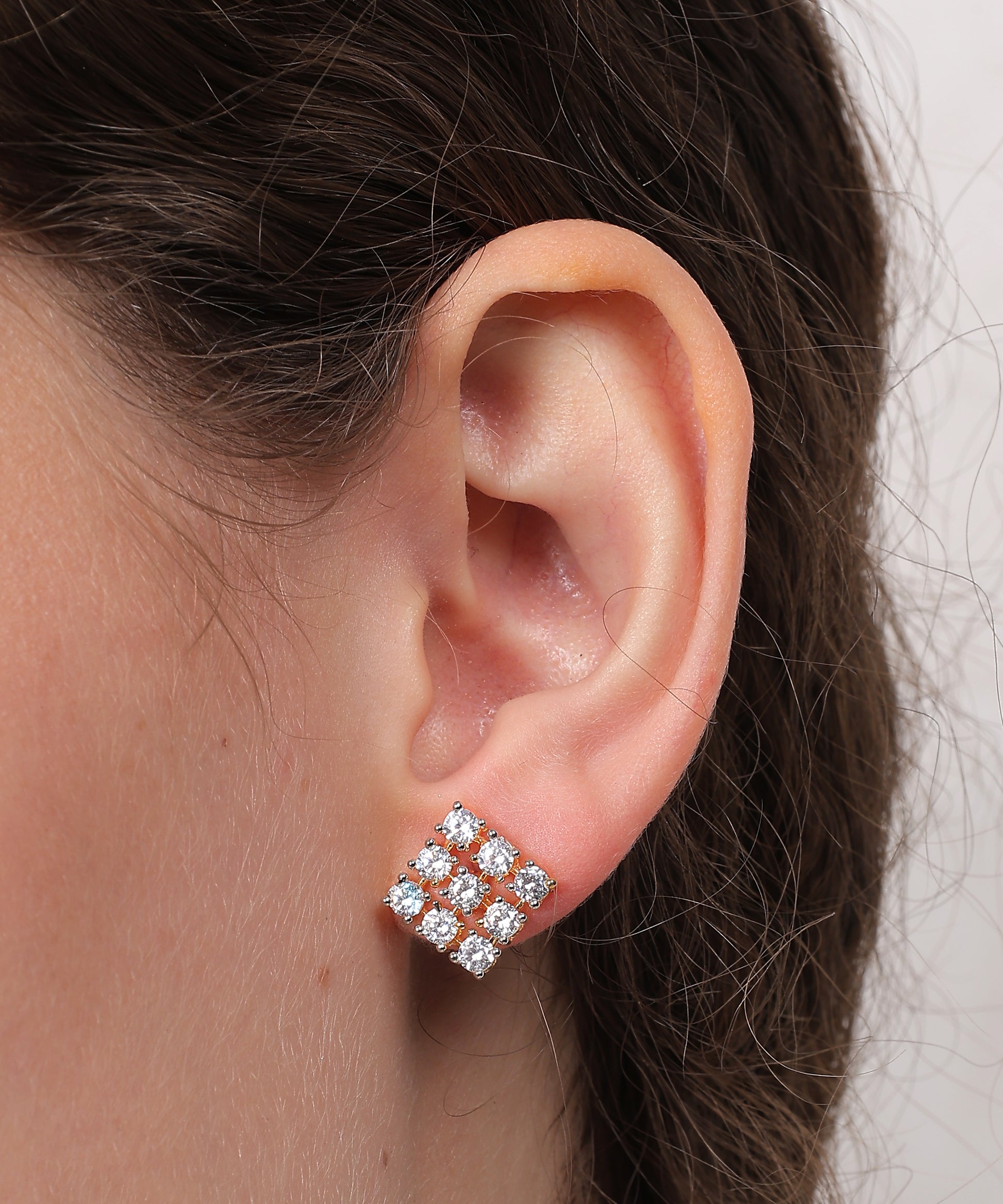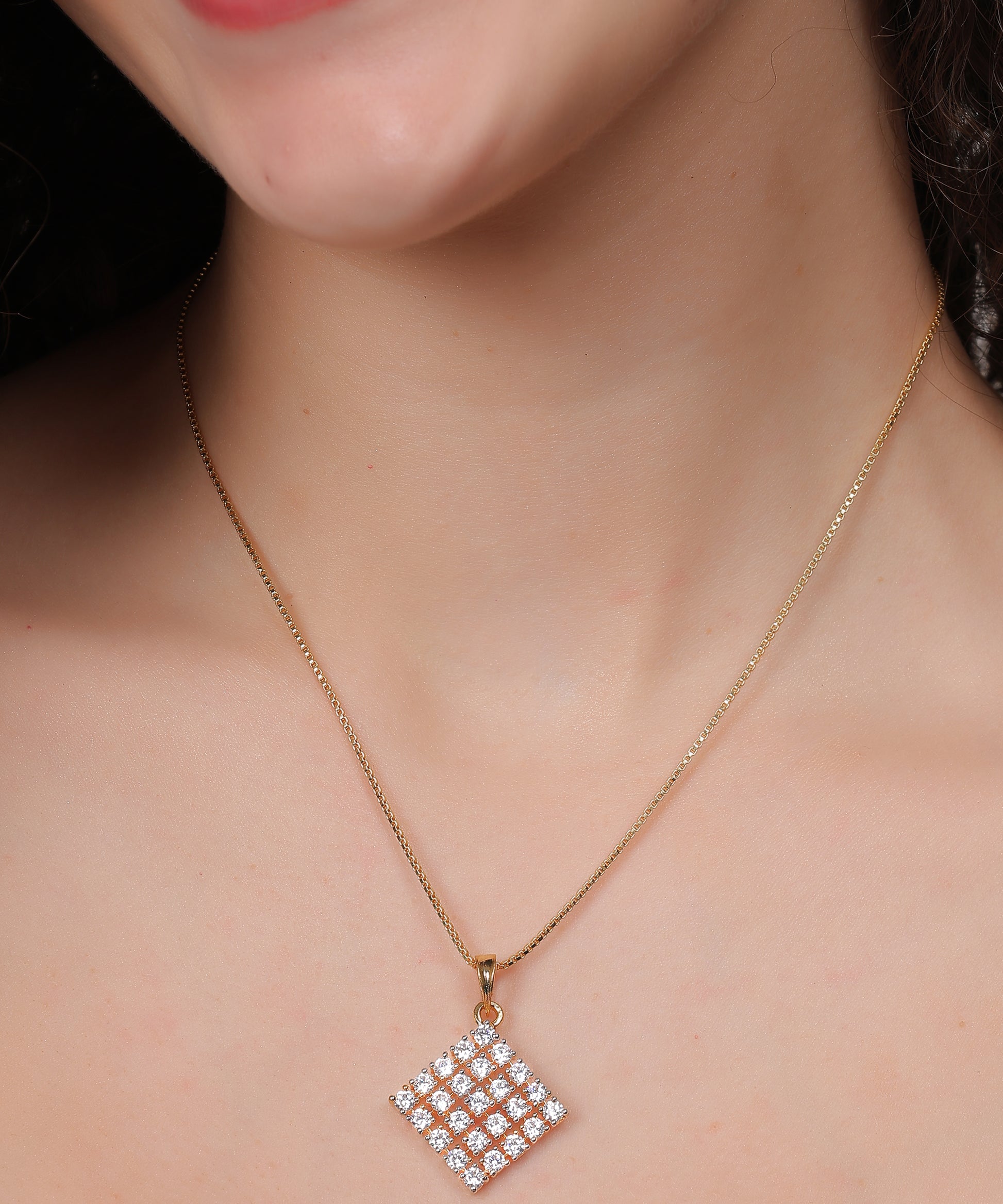 Step into elegance with the contemporary charm of this Dazzle Grid Diamond-Cut Pendant Set. Crafted with precision, this sophisticated set features a striking square-shaped pendant and matching stud earrings, both adorned with a grid of sparkling white stones set in a gold-toned finish.