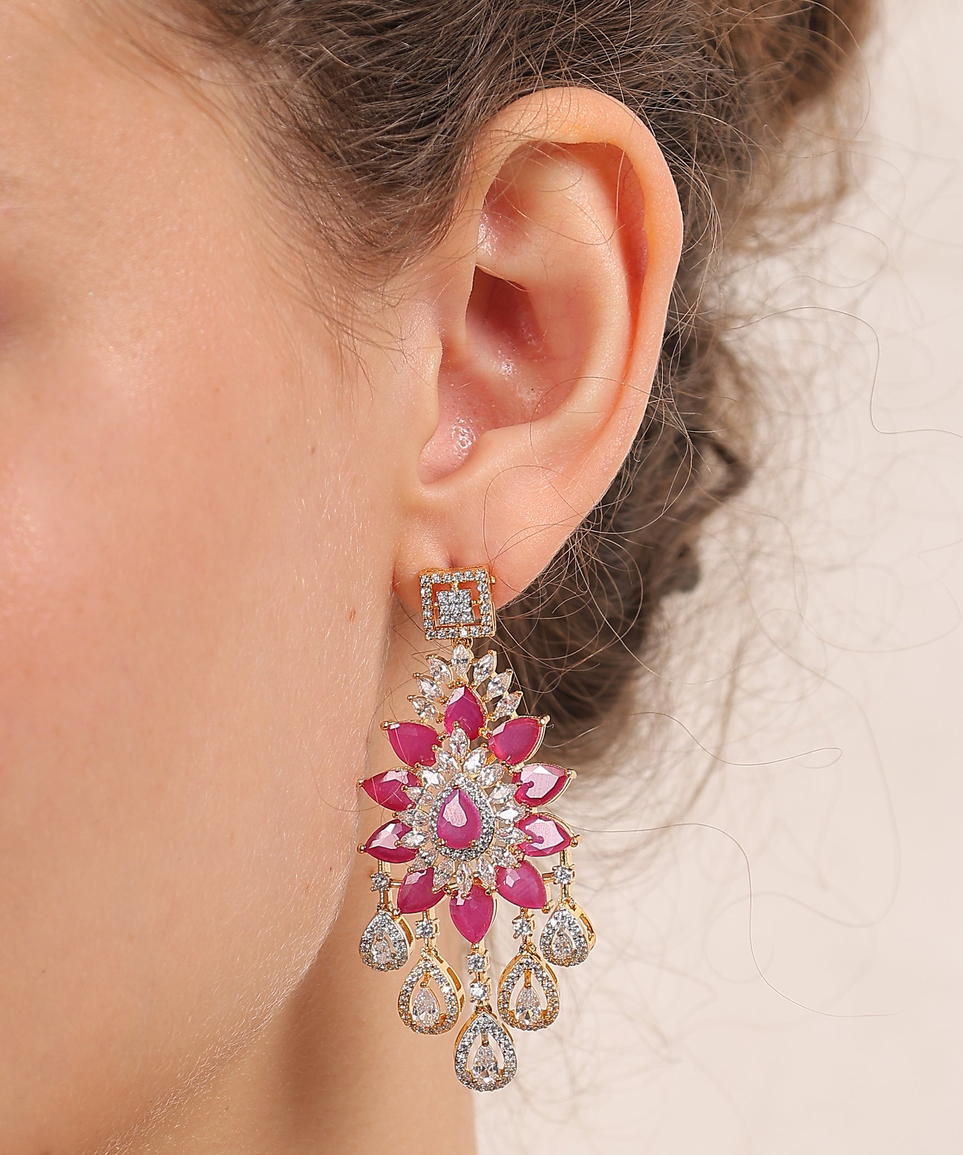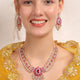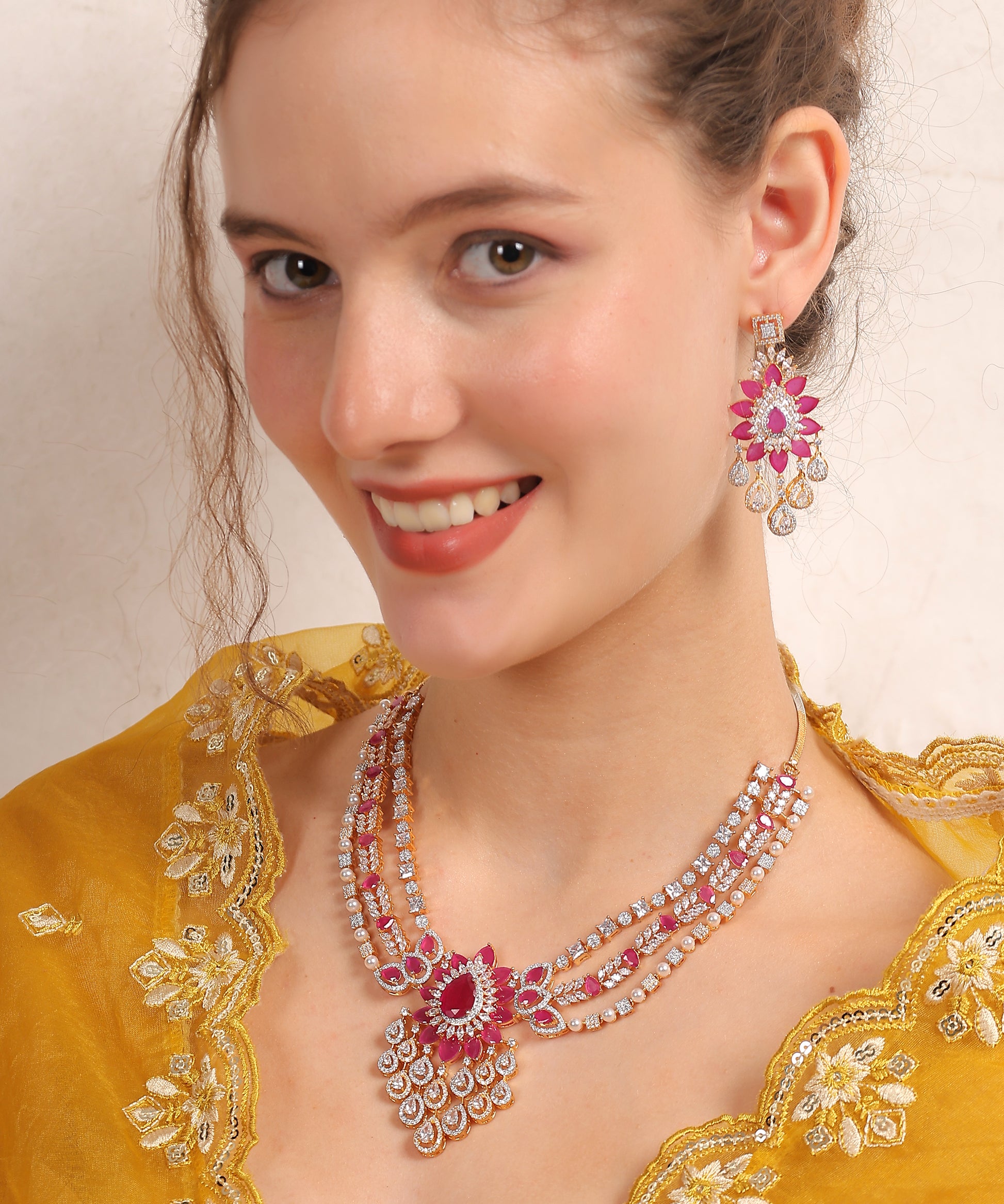 Turn heads at any celebration with the stunning Radiant Ruby Lotus Set. Designed to exude luxury and grace, this intricately crafted necklace and matching earrings feature a beautiful combination of deep ruby pink stones and sparkling white CZ diamonds arranged in an elegant floral lotus motif. The layered chain design adds a regal touch, draping perfectly around the neckline. Perfect for weddings, festive events, or cultural gatherings, this show-stopping set pairs flawlessly with sarees, lehengas, and embellished ethnic ensembles to create a truly royal look.