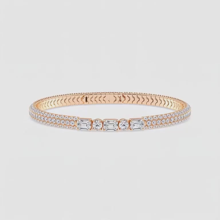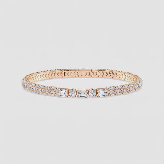 The Radiant Grace Diamond Bangle embodies timeless elegance and modern brilliance. Crafted in luxurious rose gold, it features a striking combination of emerald-cut and round lab-grown diamonds, perfectly aligned at the center to create a captivating focal point. The double rows of pavé-set diamonds along the band add extra sparkle and sophistication, making it a true statement of refinement. Designed for versatility and allure, this bangle shines effortlessly from day to night — a symbol of confidence, beauty, and grace. 🌸