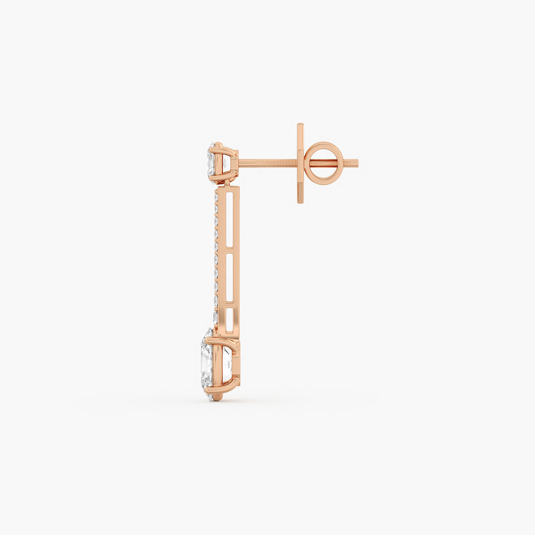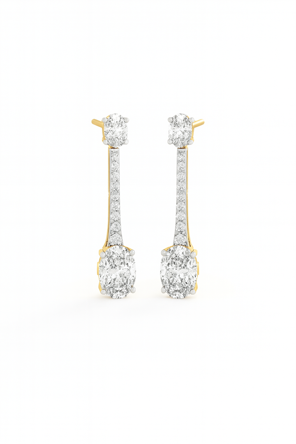 These elegant drop earrings showcase dazzling oval-cut diamonds gracefully suspended from a slender line of pavé-set diamonds, all set in luminous yellow gold. The sleek vertical design elongates the silhouette, adding a touch of modern sophistication and timeless sparkle — perfect for elevating any occasion with refined luxury.