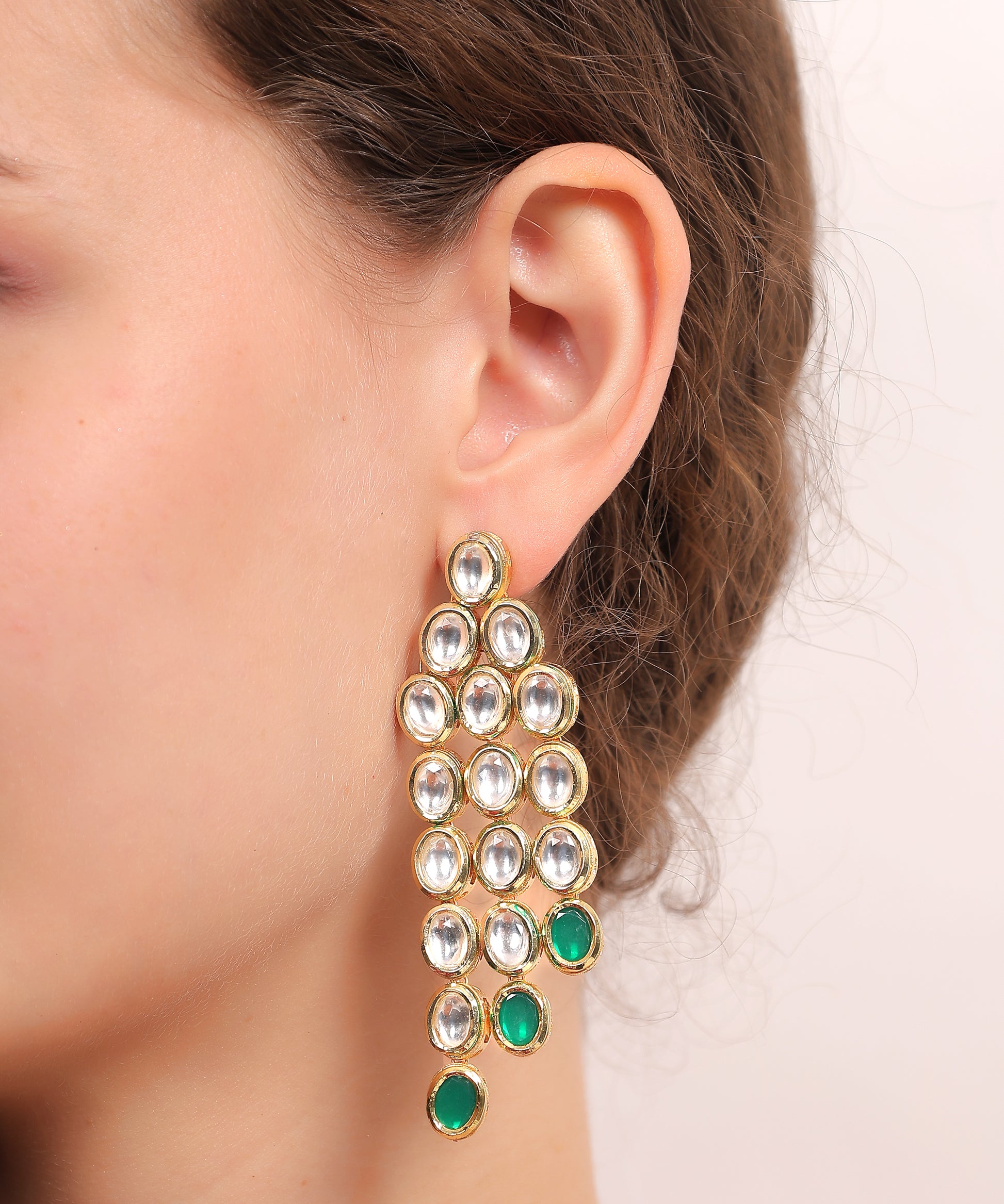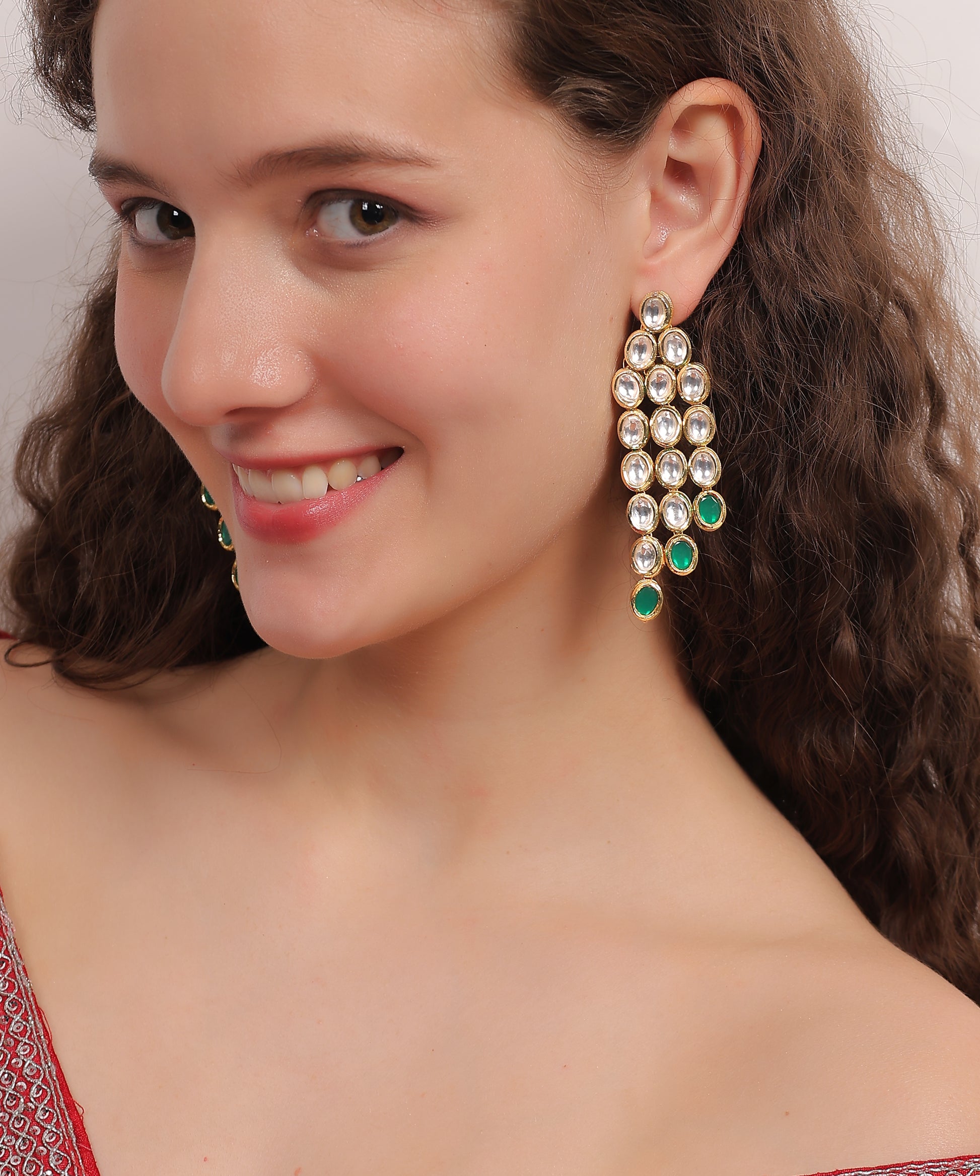 Emerald Kundan Cascade Earrings Dazzling chandelier-style earrings featuring layered kundan stones with elegant emerald green drops. Their cascading silhouette and mirror-like brilliance create a statement of timeless beauty, making them perfect for weddings, festive occasions, or evening soirées.