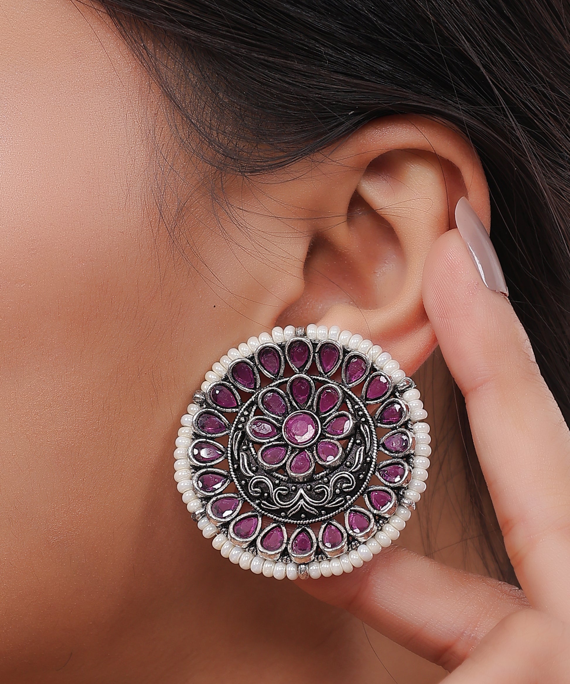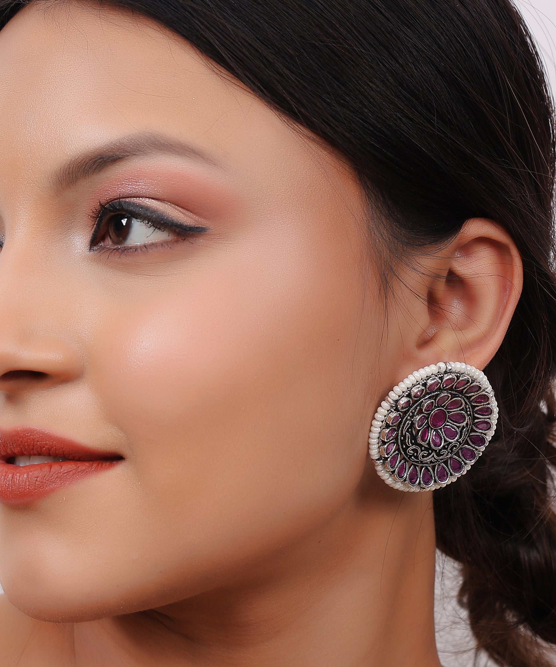 The Kalliski Enchanted Plumage Earrings are a mesmerizing blend of tradition and elegance. Featuring a striking peacock-inspired design, these round oxidized studs are adorned with vibrant ruby-toned gemstones and encircled by delicate pearl accents. The intricate craftsmanship and vintage charm make them a perfect statement piece, adding regal sophistication to any ensemble.