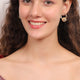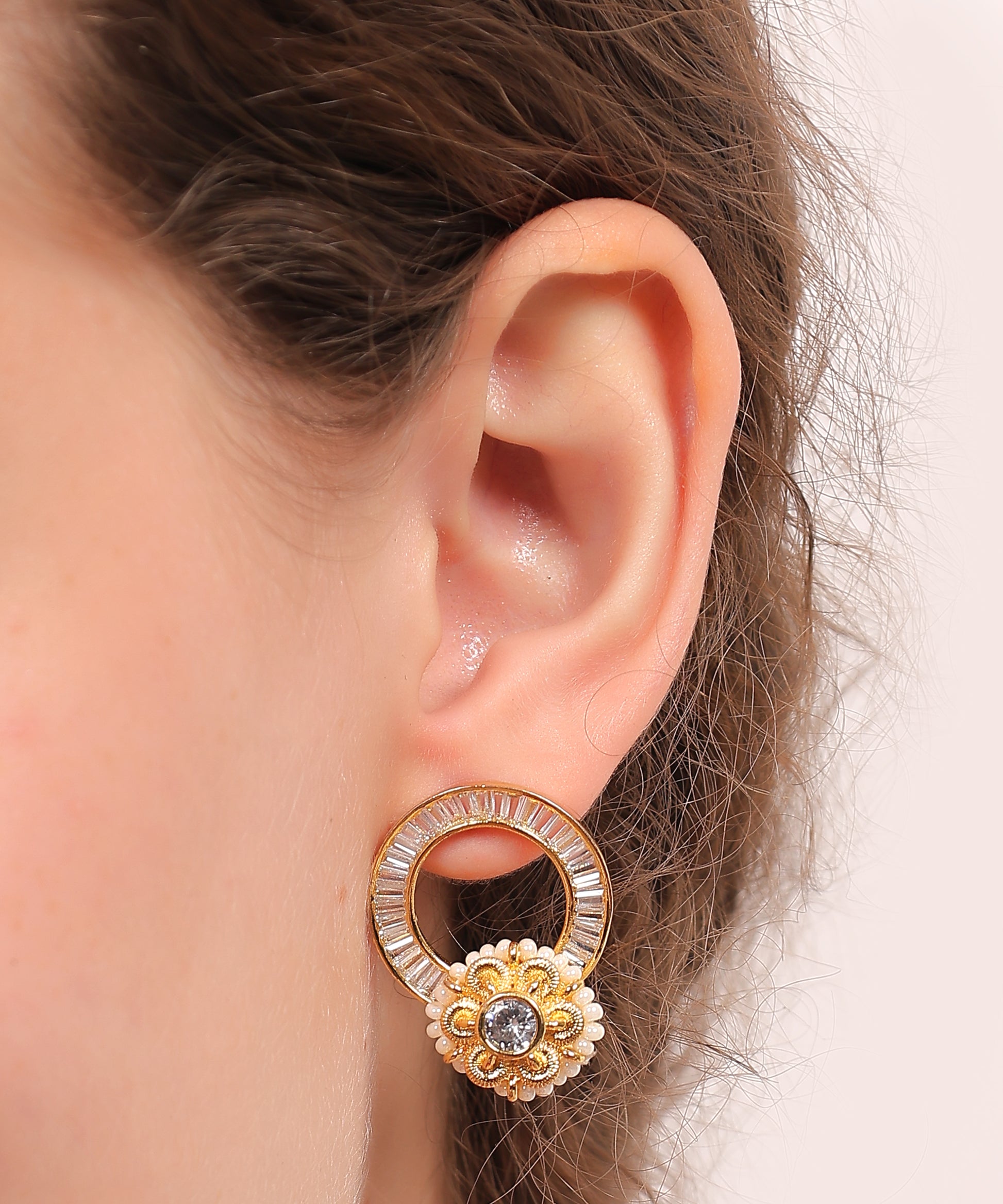 Golden Bloom Crystal Stud Earrings  These elegant circular earrings feature a floral crystal centerpiece framed in a ring of baguette-cut stones, blending classic charm with modern finesse. Compact yet eye-catching, they’re perfect for both festive wear and refined everyday elegance.