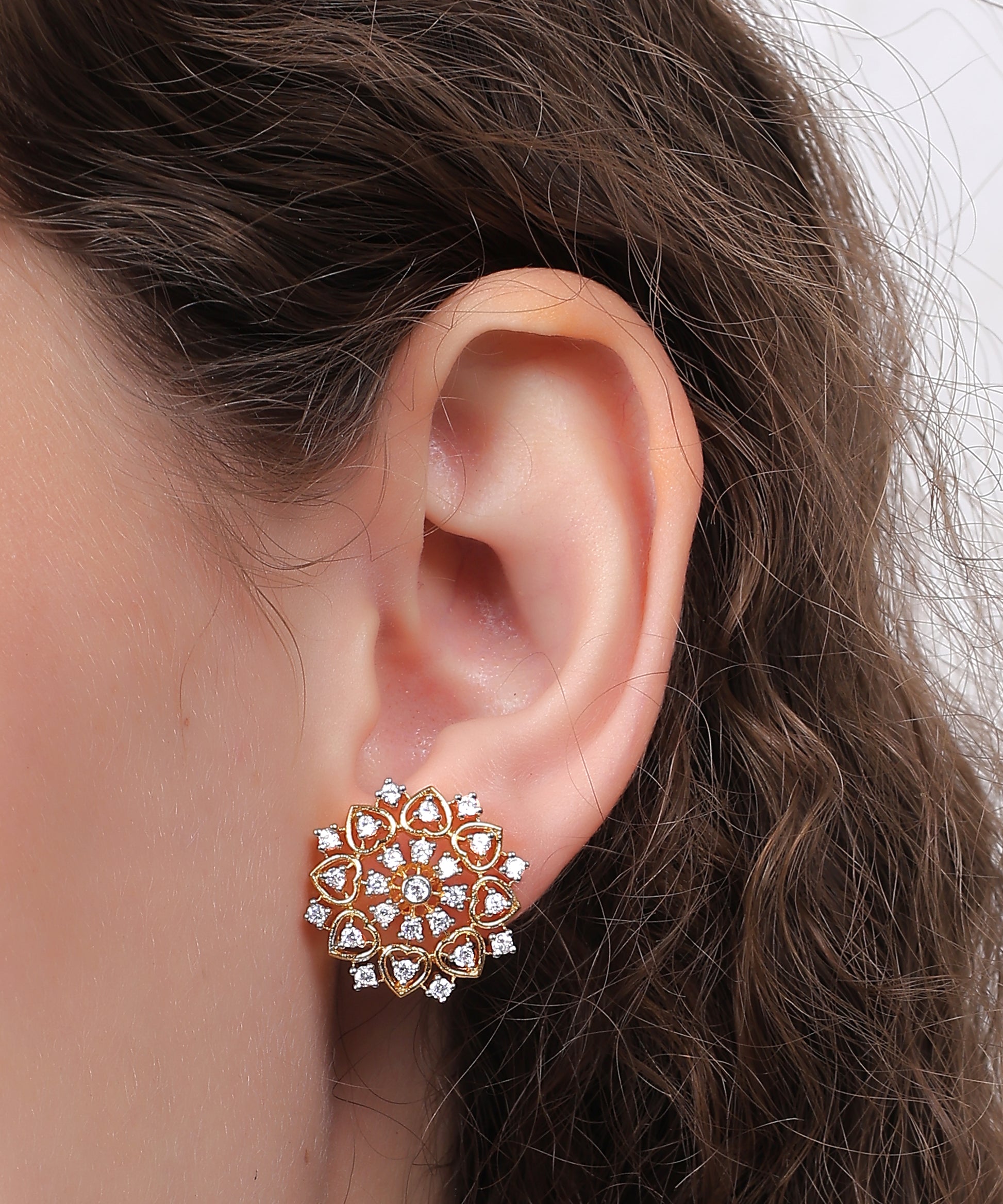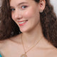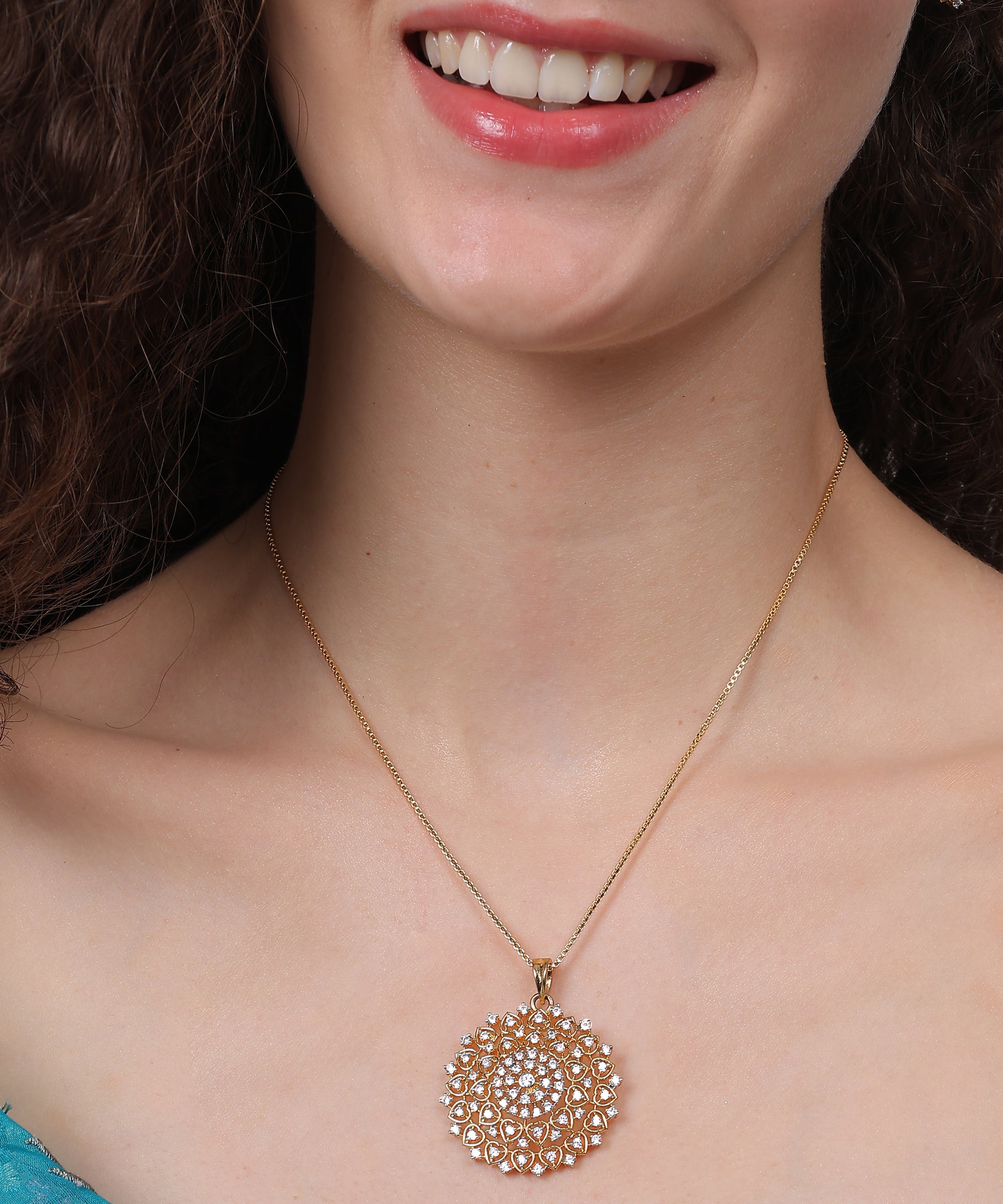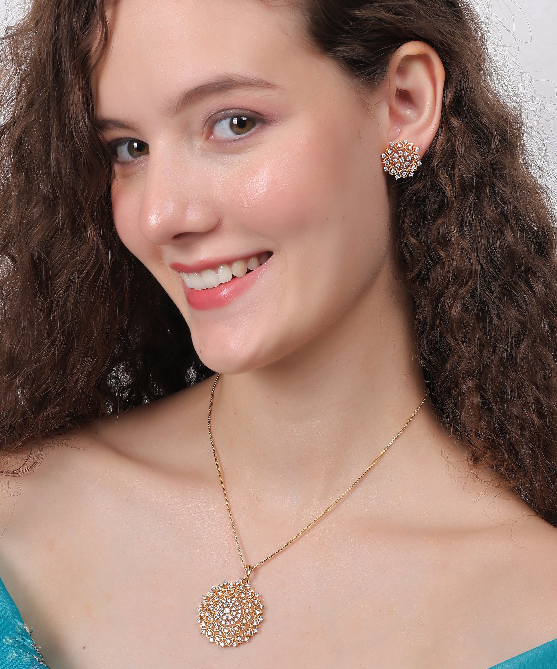 Golden Petal Grace Set – A radiant expression of floral elegance and timeless charm. This exquisite set features a large circular pendant crafted in a delicate petal-inspired design, encrusted with shimmering cubic zirconia that catch the light with every movement. Paired with matching floral stud earrings, the set is finished in a warm golden tone, perfectly blending tradition with a touch of contemporary finesse – ideal for both festive occasions and elegant soirées.