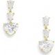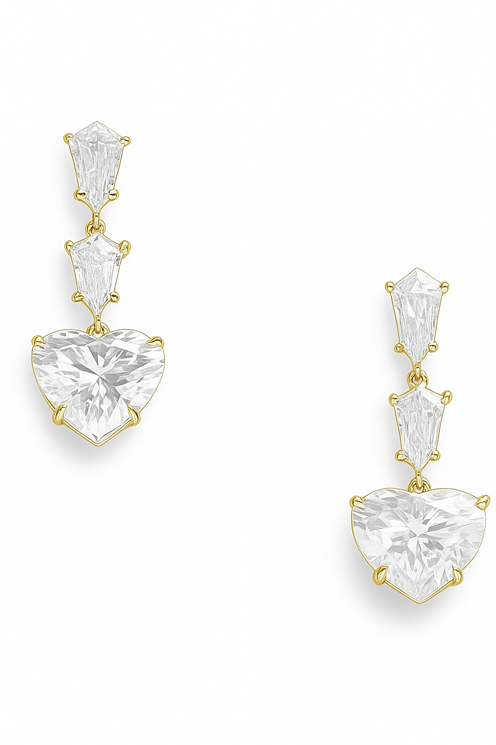 These are lab-grown diamond drop earrings in yellow gold, featuring a striking combination of two geometric step-cut diamonds leading into a dazzling heart-shaped diamond at the base. The design is modern yet deeply romantic, symbolizing strength, elegance, and love