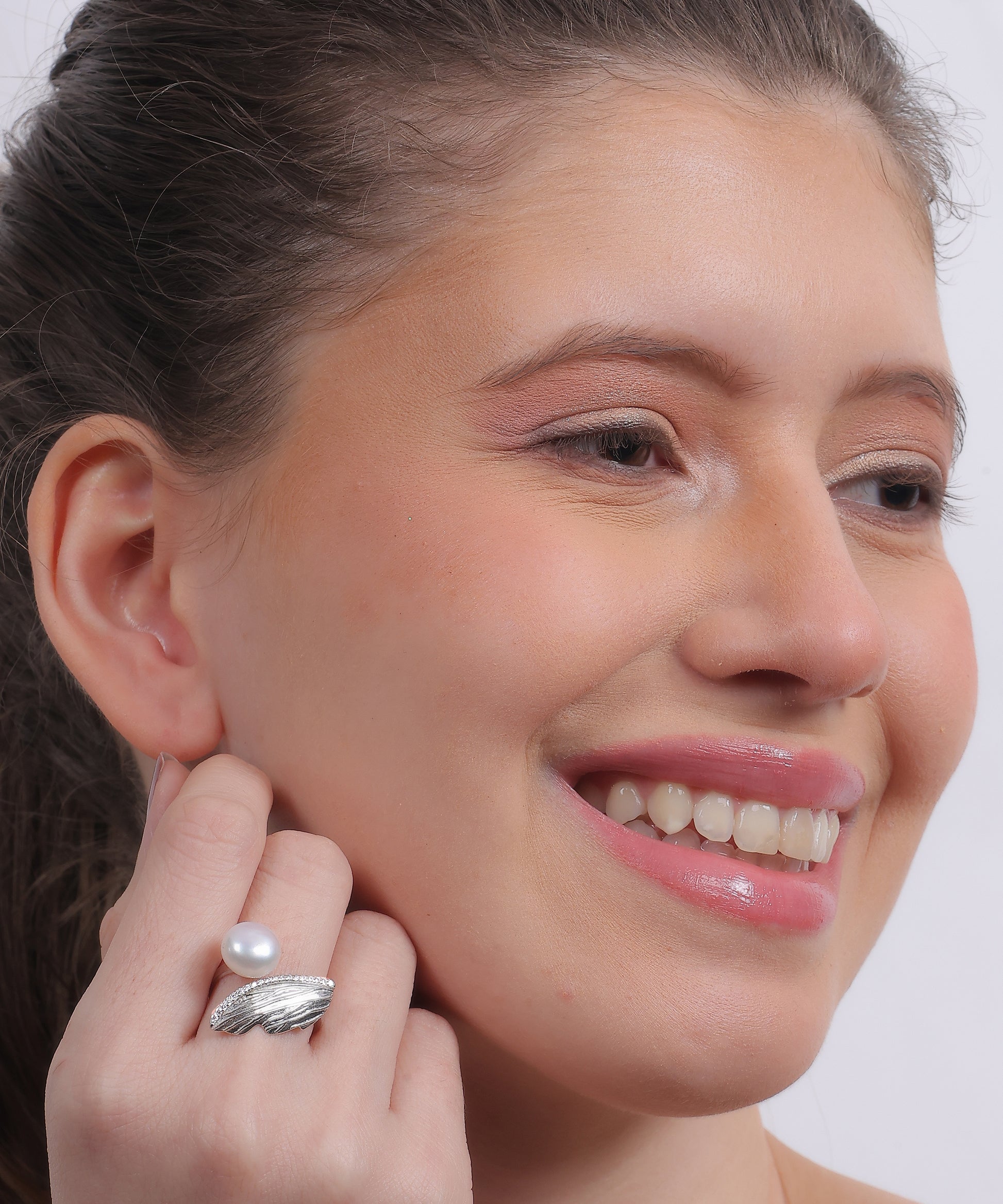 The Kalliski Silver Grace Pearl Ring showcases a lustrous pearl on a textured 925 silver open band with wave-like details. A perfect blend of modern elegance and timeless charm, it’s an ideal statement piece for any occasion.