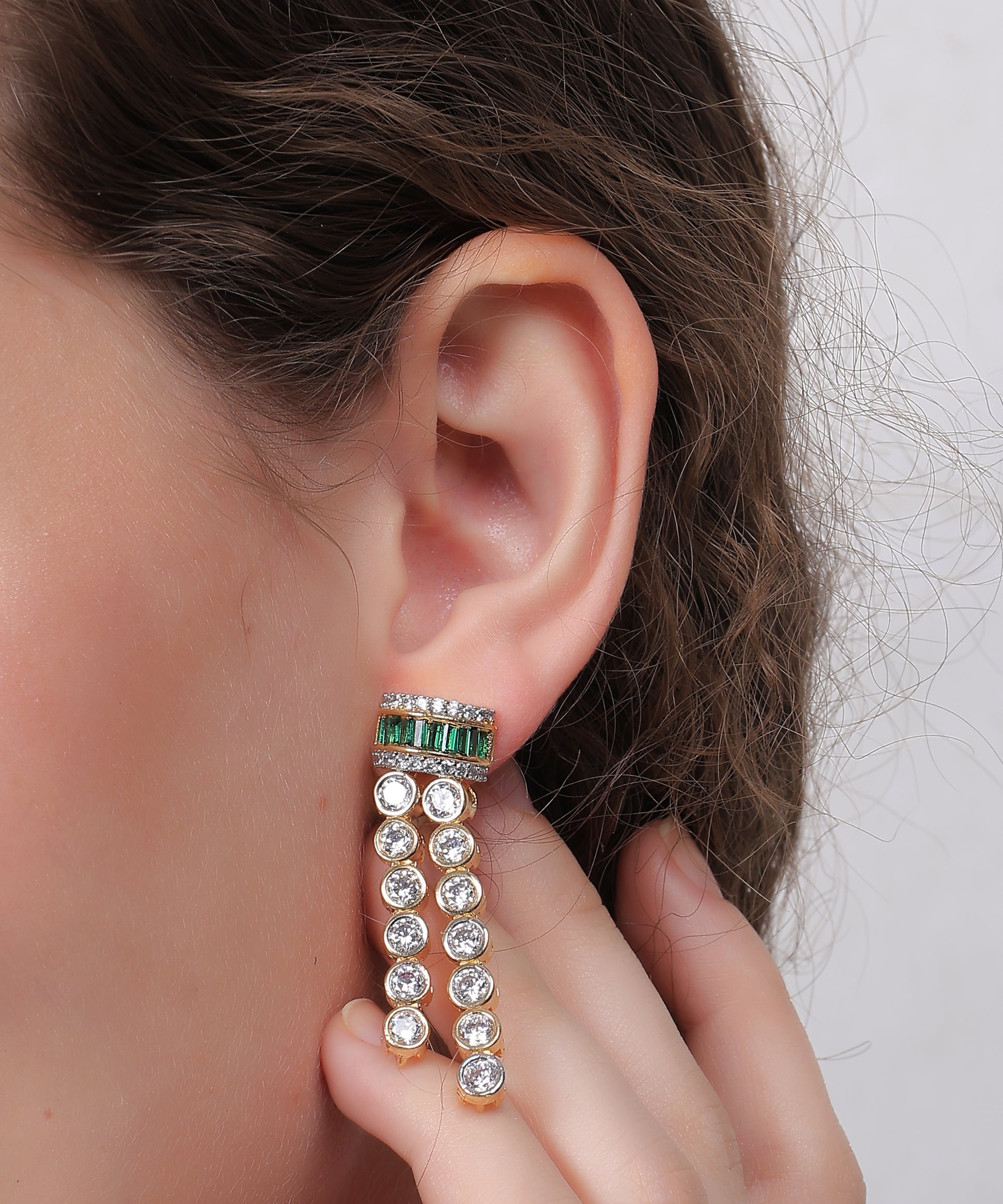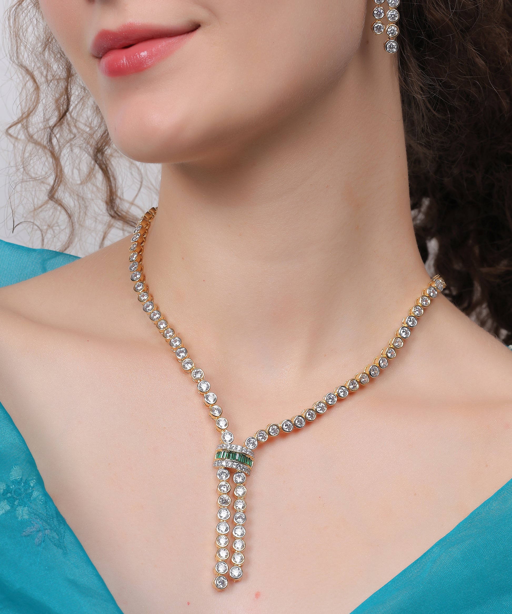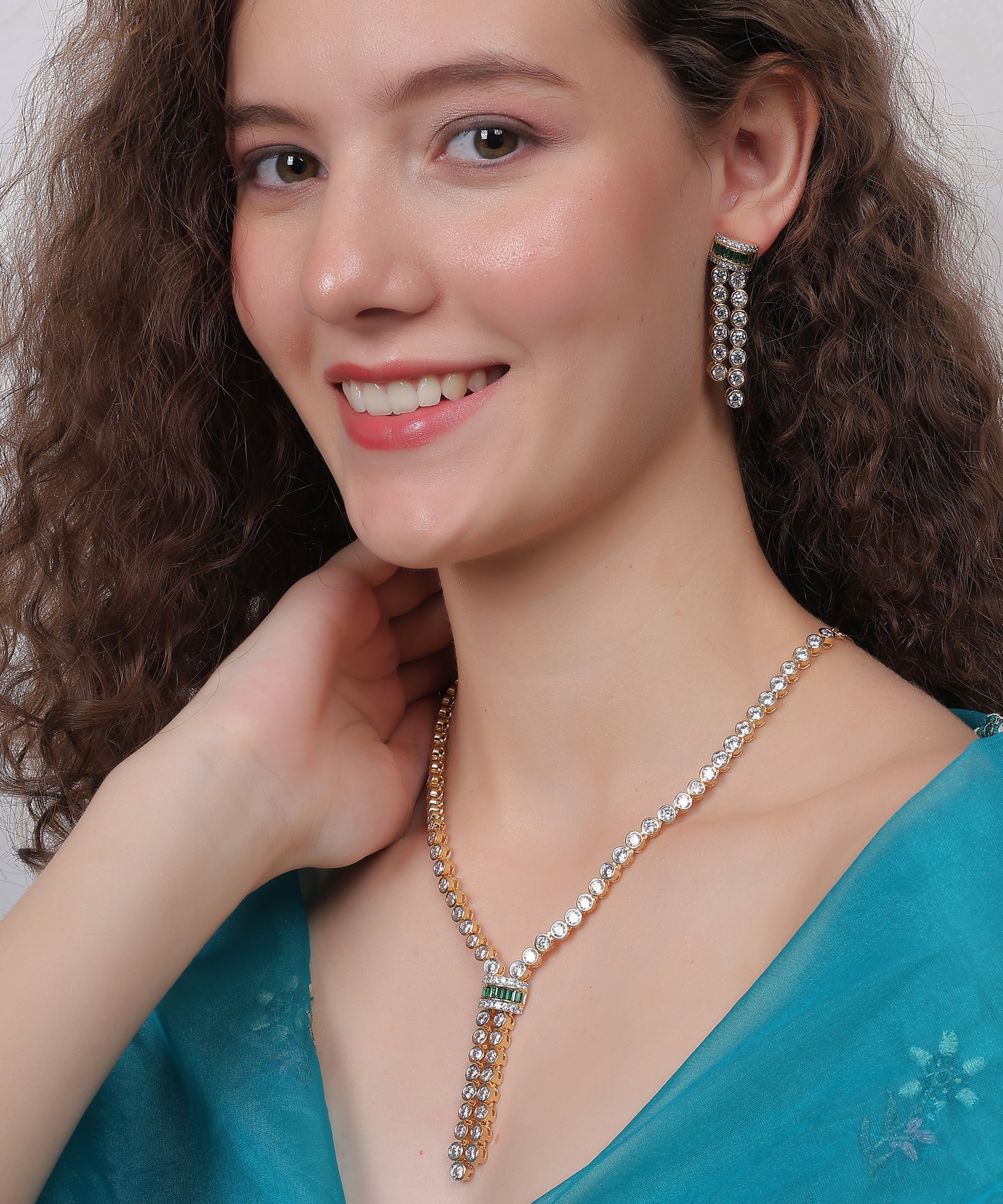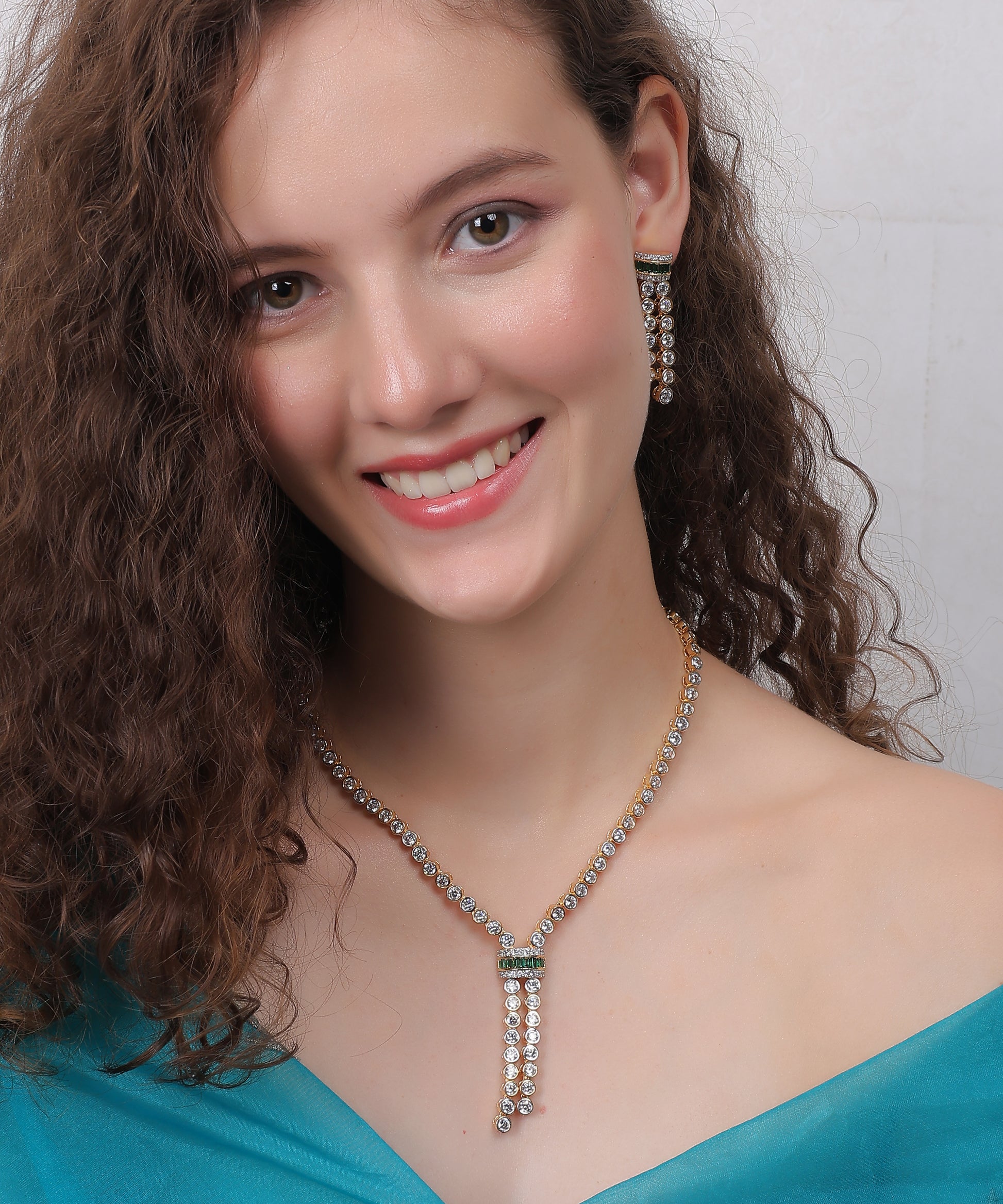 Gracefall Elegance Set – A refined embodiment of sophistication with a modern allure. This set features a radiant V-shaped necklace adorned with a continuous line of sparkling cubic zirconia, seamlessly tapering into a bold, vertical drop of clustered stones. The centerpiece is subtly accented with emerald-green details that lend a rich contrast to the brilliance of the crystals.