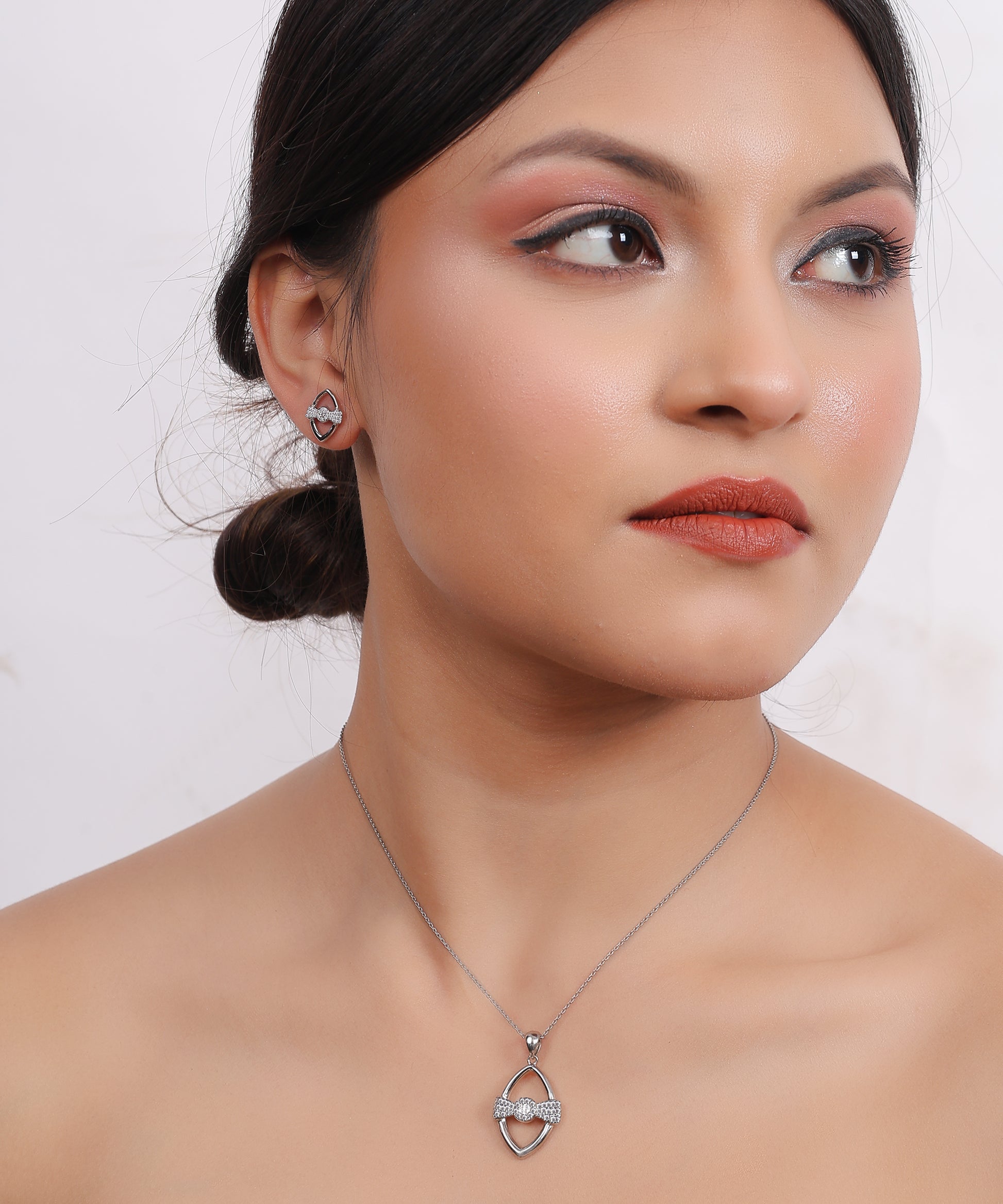 The Kalliski Silver Infinity Bow Set features a delicate pendant and matching earrings adorned with a sparkling bow design. This elegant set adds a touch of grace and charm, making it the perfect accessory for any occasion.