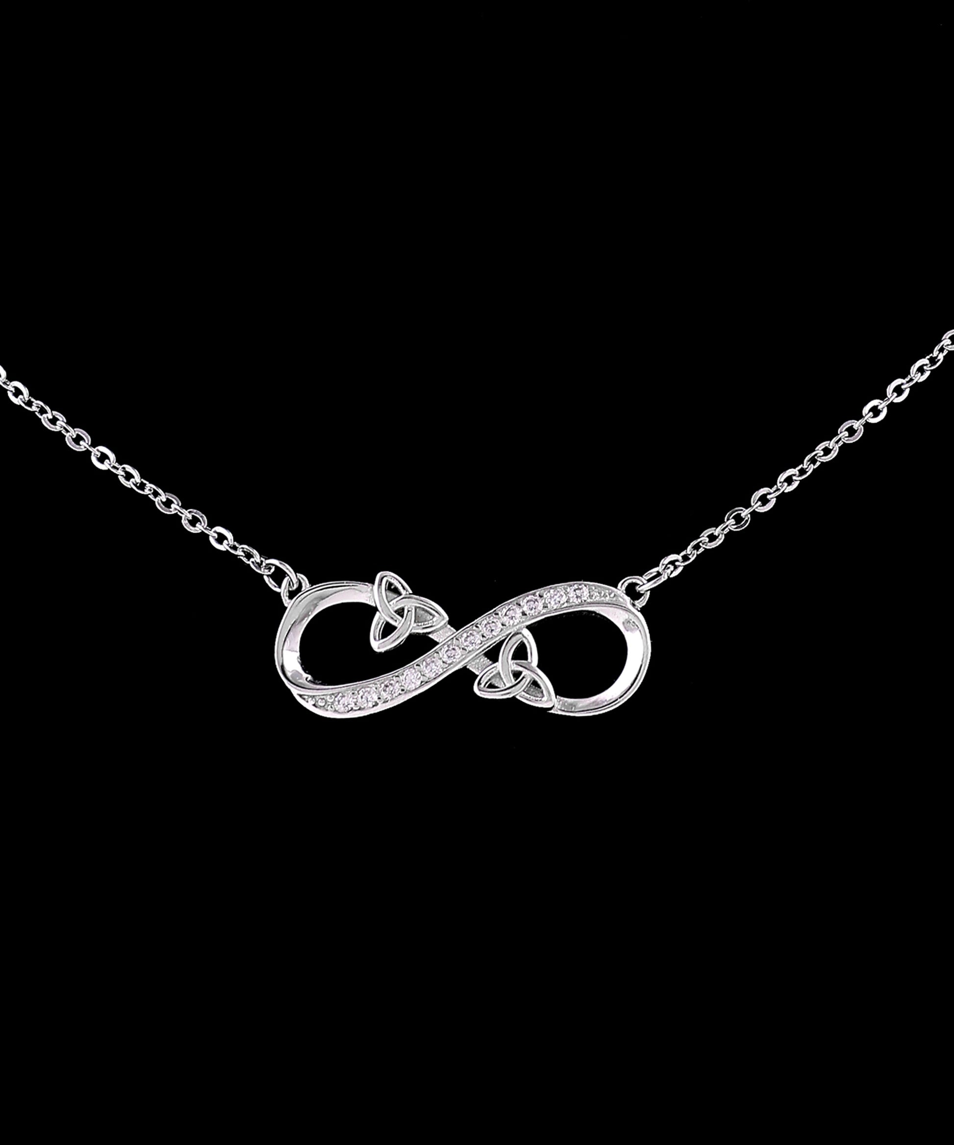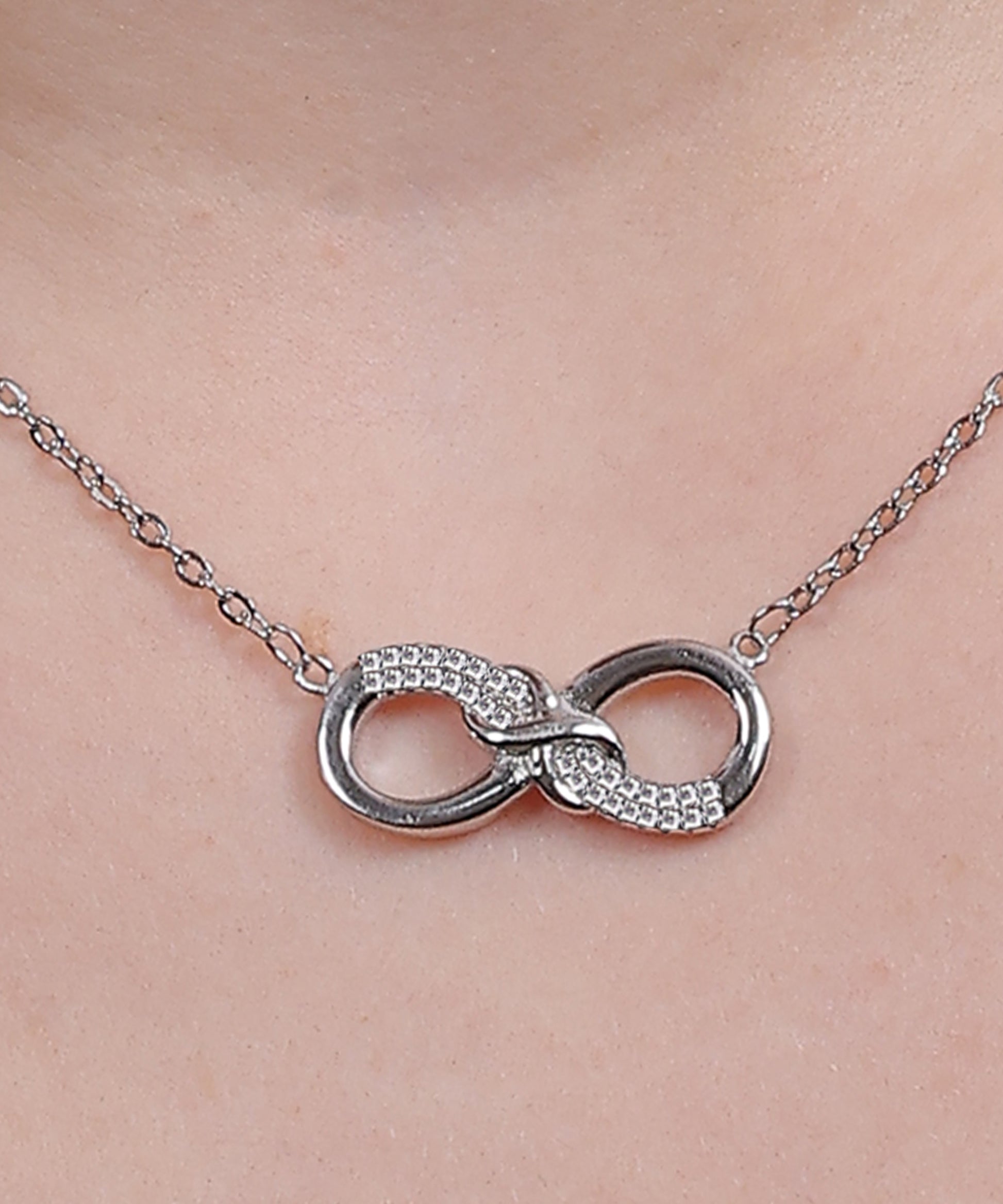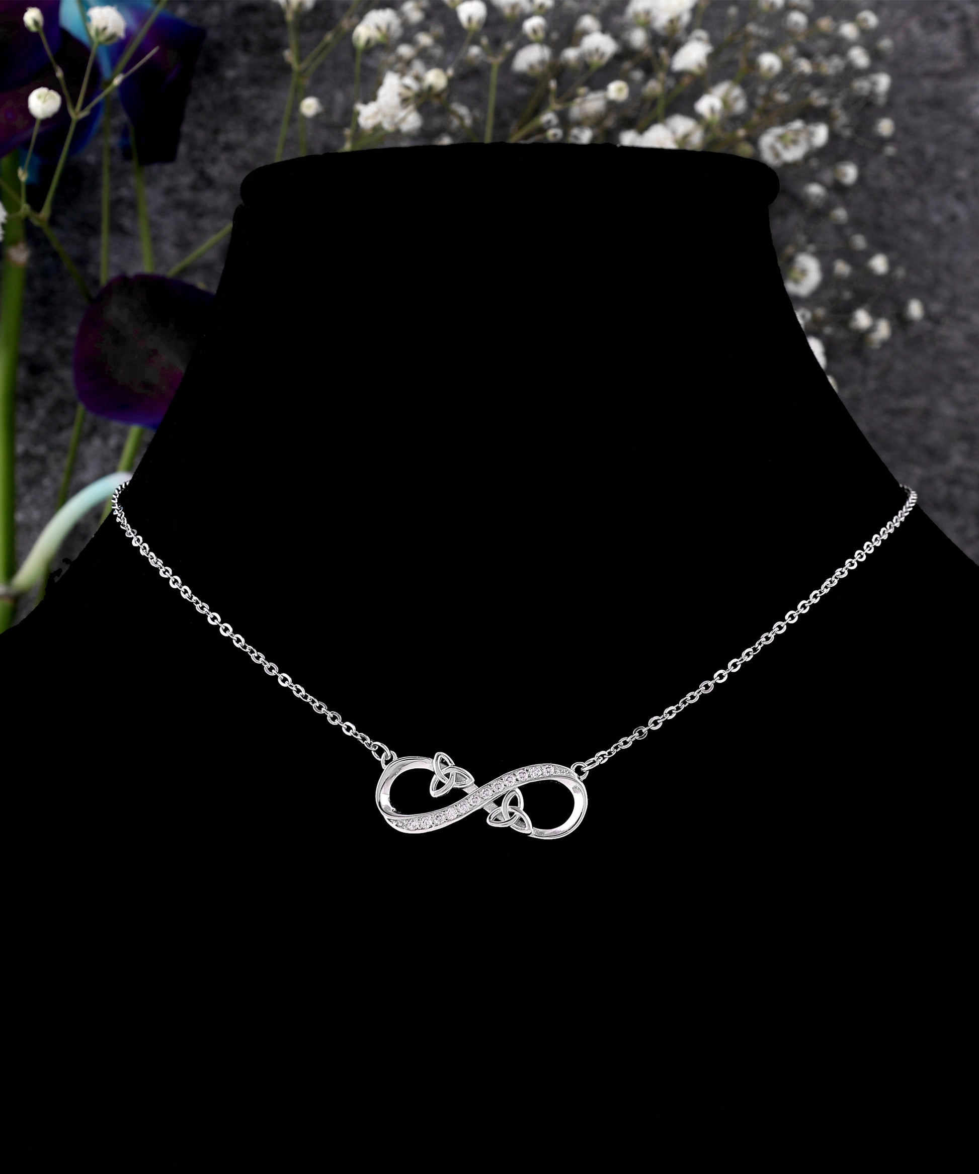 The Kalliski Silver Infinity Knot Pendant is a symbolic and elegant piece, featuring an intertwined infinity design adorned with shimmering stones along the knot. Its sleek and modern design represents eternal love and connection, making it the perfect accessory to add a touch of sophistication and meaning to any outfit.