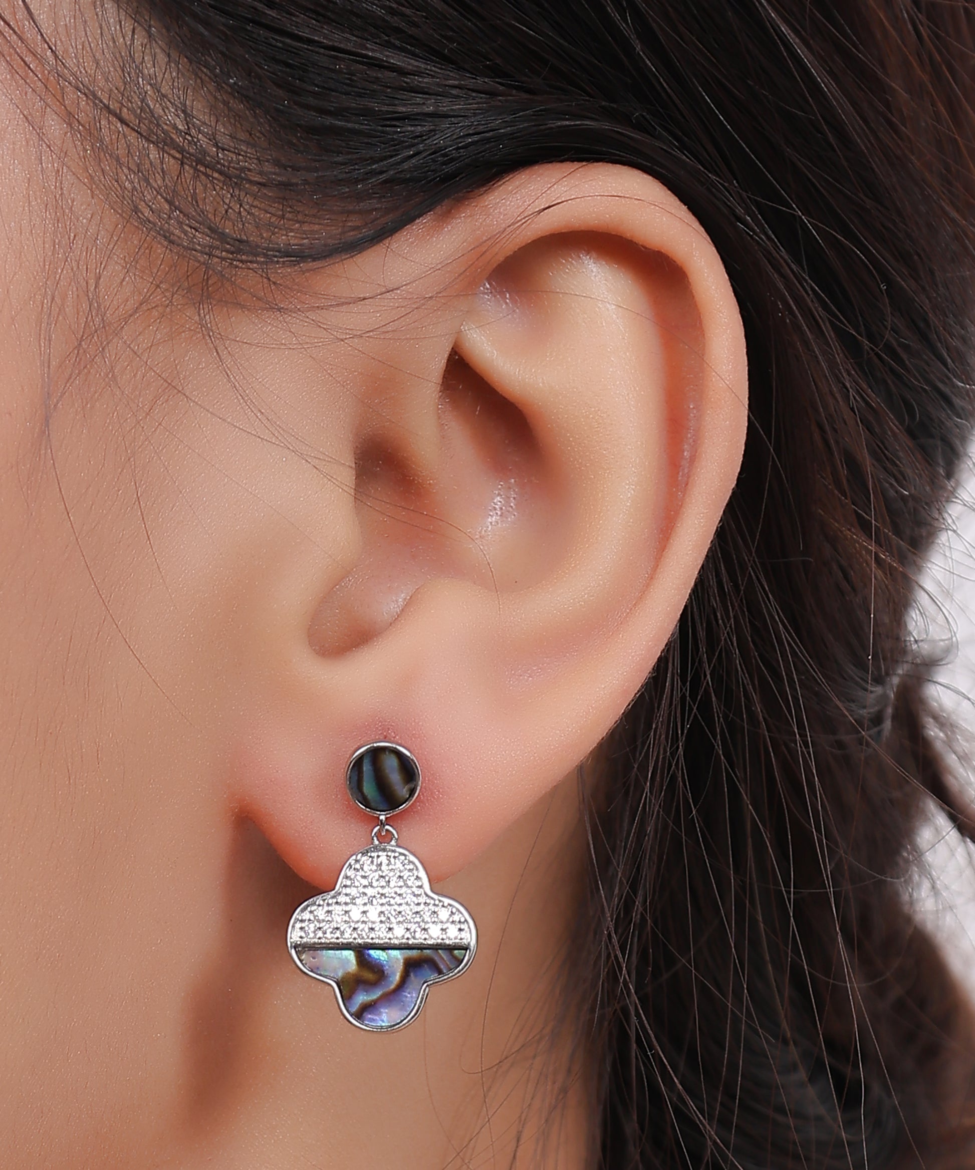 The Kalliski Silver Iridescent Bloom Earrings is a sophisticated and timeless piece, featuring a clover-shaped design with dazzling abalone shell inlays and sparkling accents. Set in elegant silver tones, these earrings add a touch of natural beauty and refined elegance to any outfit.