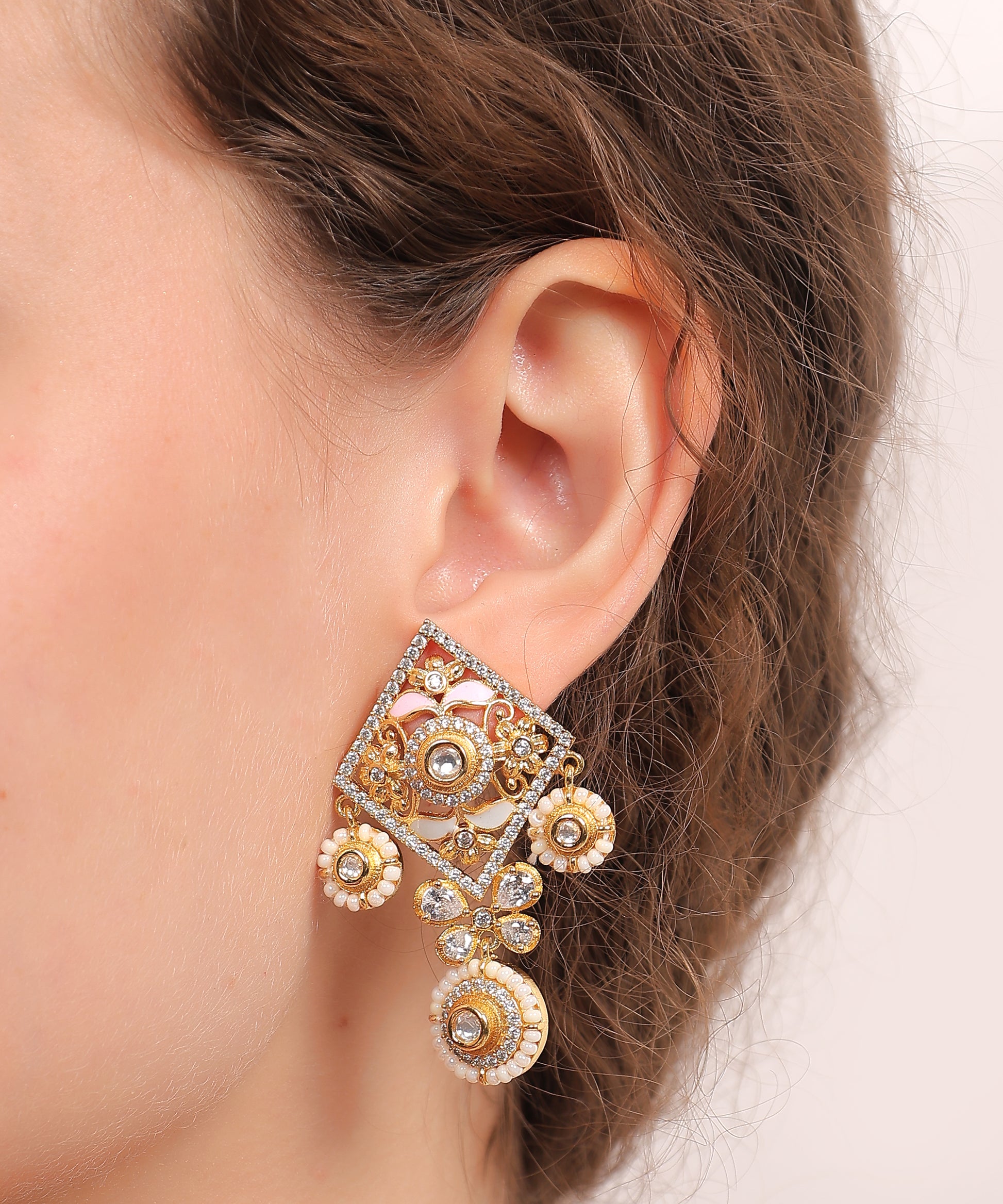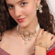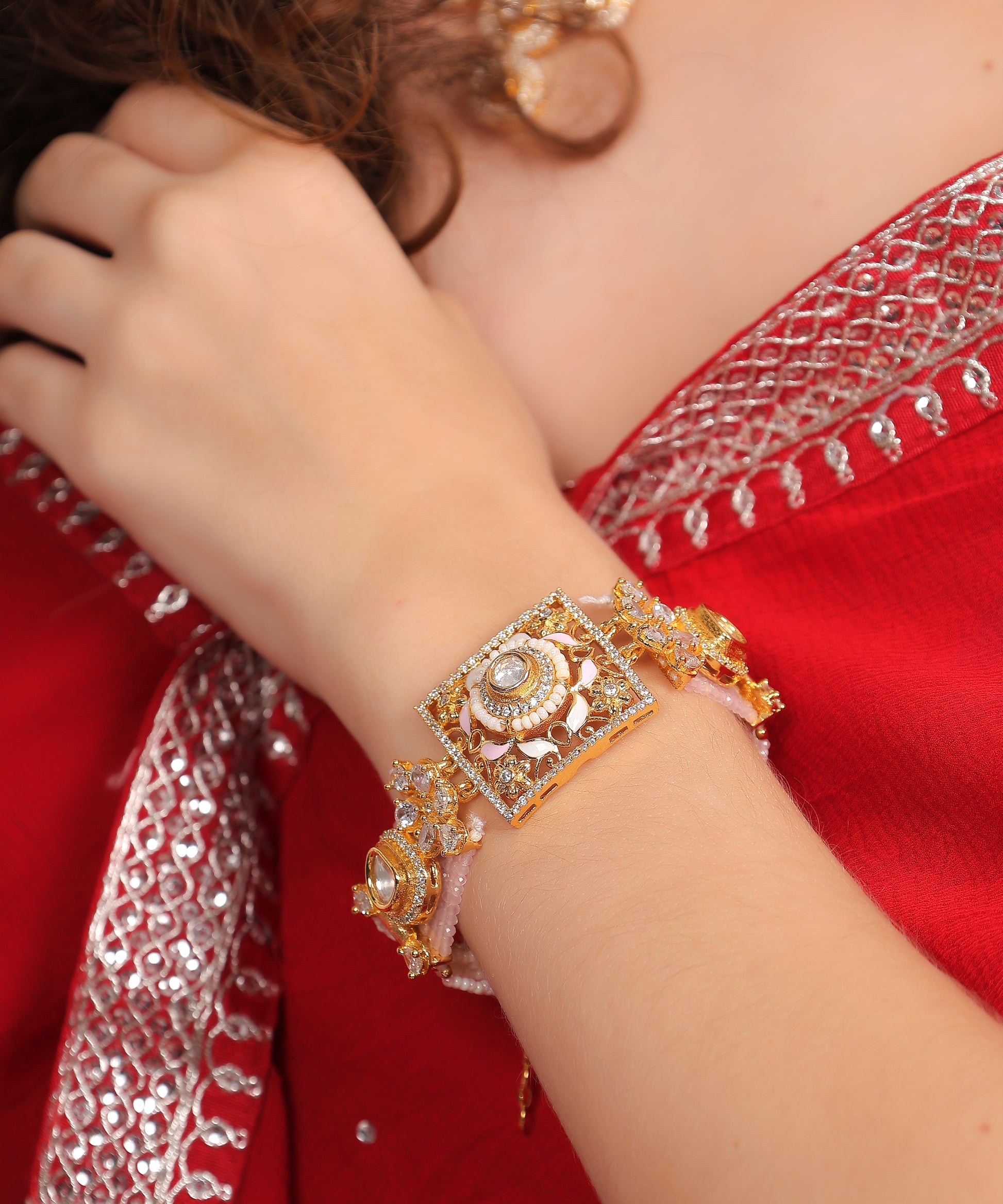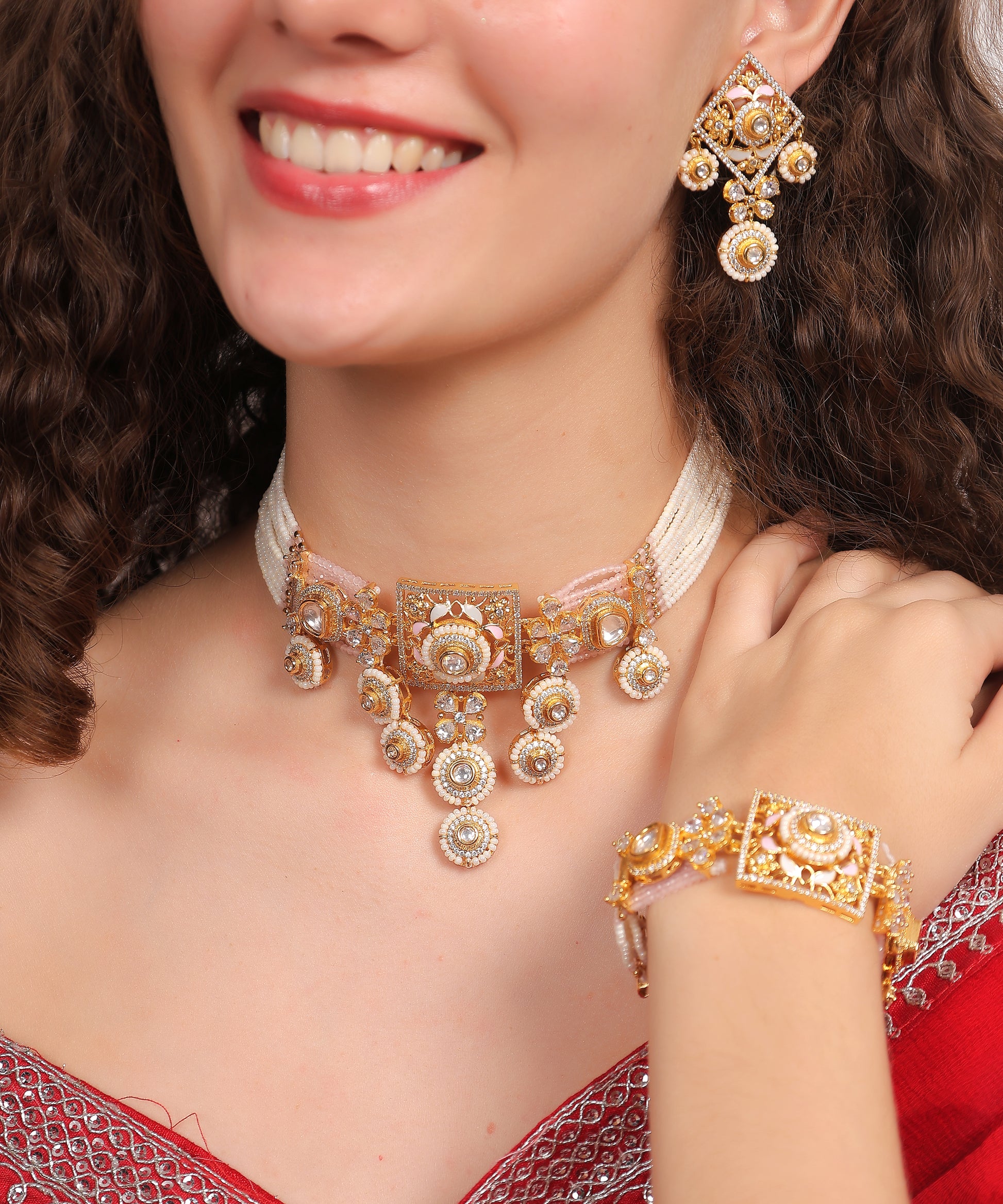 Kalliski Moti Rajwada Set an elegant fusion of regal design and pearl artistry, this set features a square motif choker adorned with kundan, moissanite stones, and delicate pearl strands. Paired with matching earrings and a coordinated bracelet, it radiates royal charm—perfect for weddings and grand celebrations. A timeless treasure of tradition and grace.