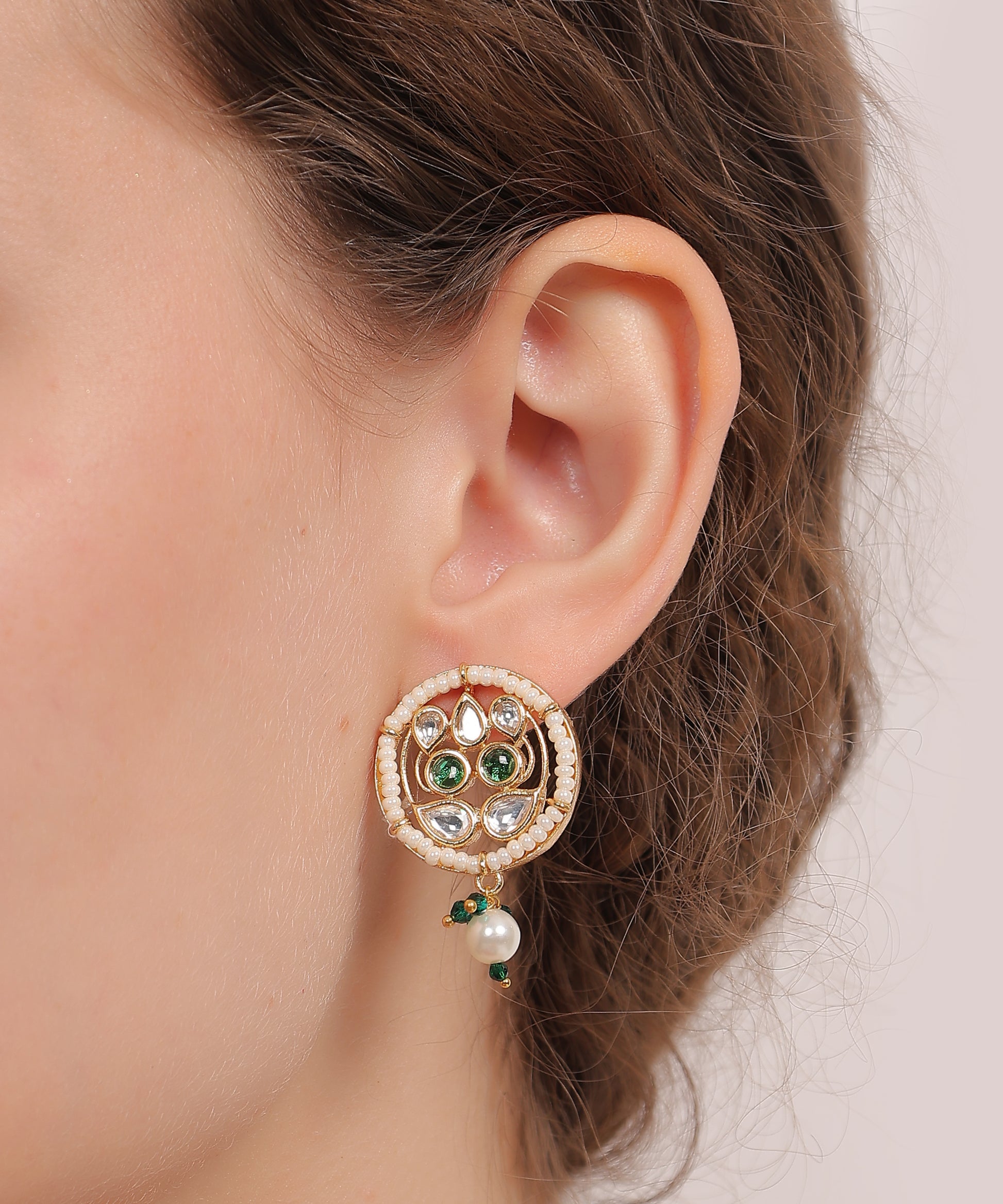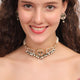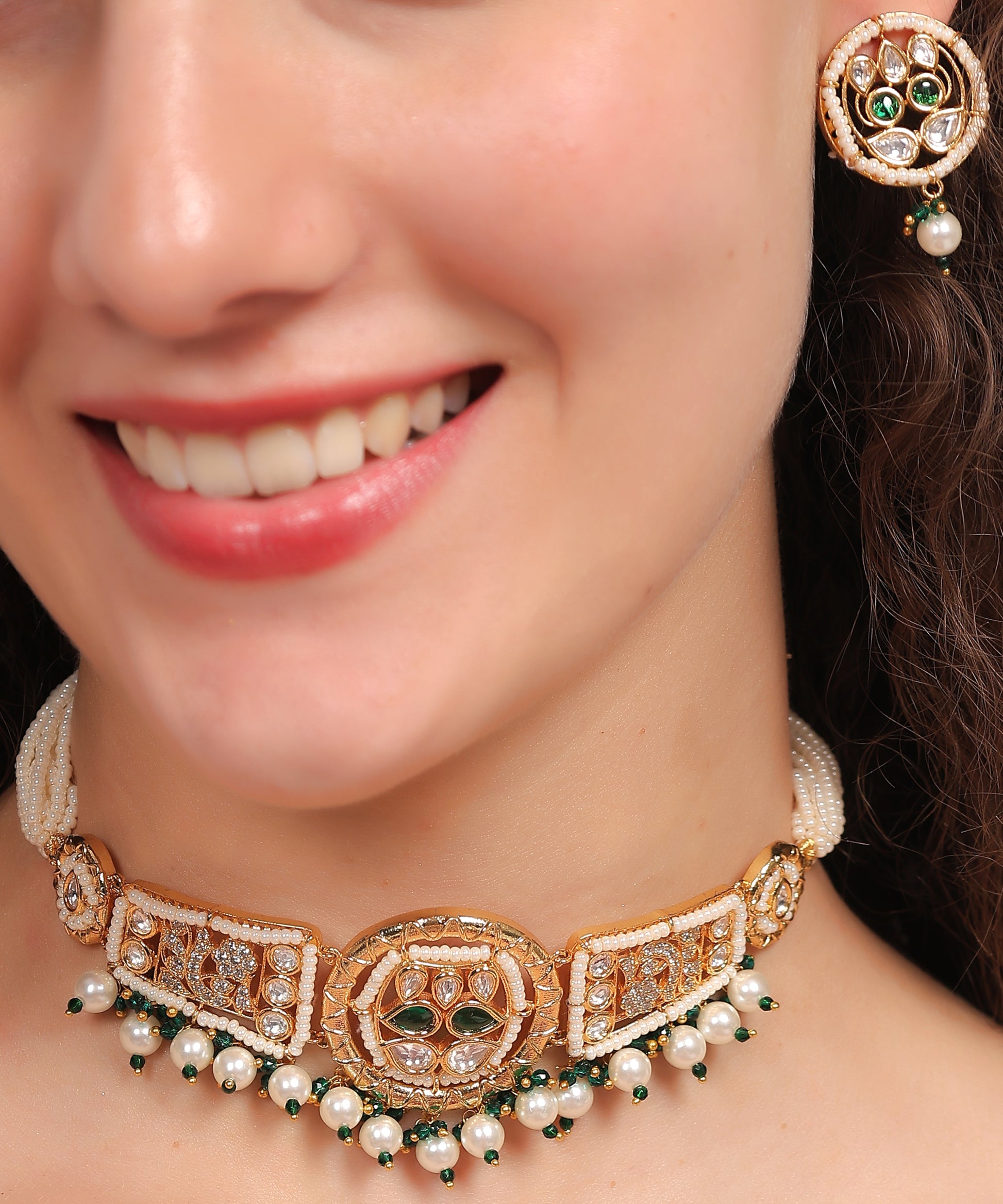 Kundan Pearl Heritage Set – A stunning round-motif choker adorned with intricate kundan work, green accents, and cascading pearls. Paired with elegant matching earrings, this set embodies regal charm and traditional finesse—perfect for festive occasions and grand celebrations.