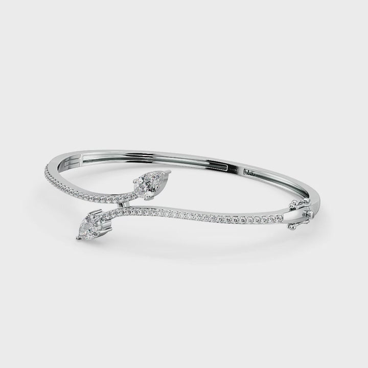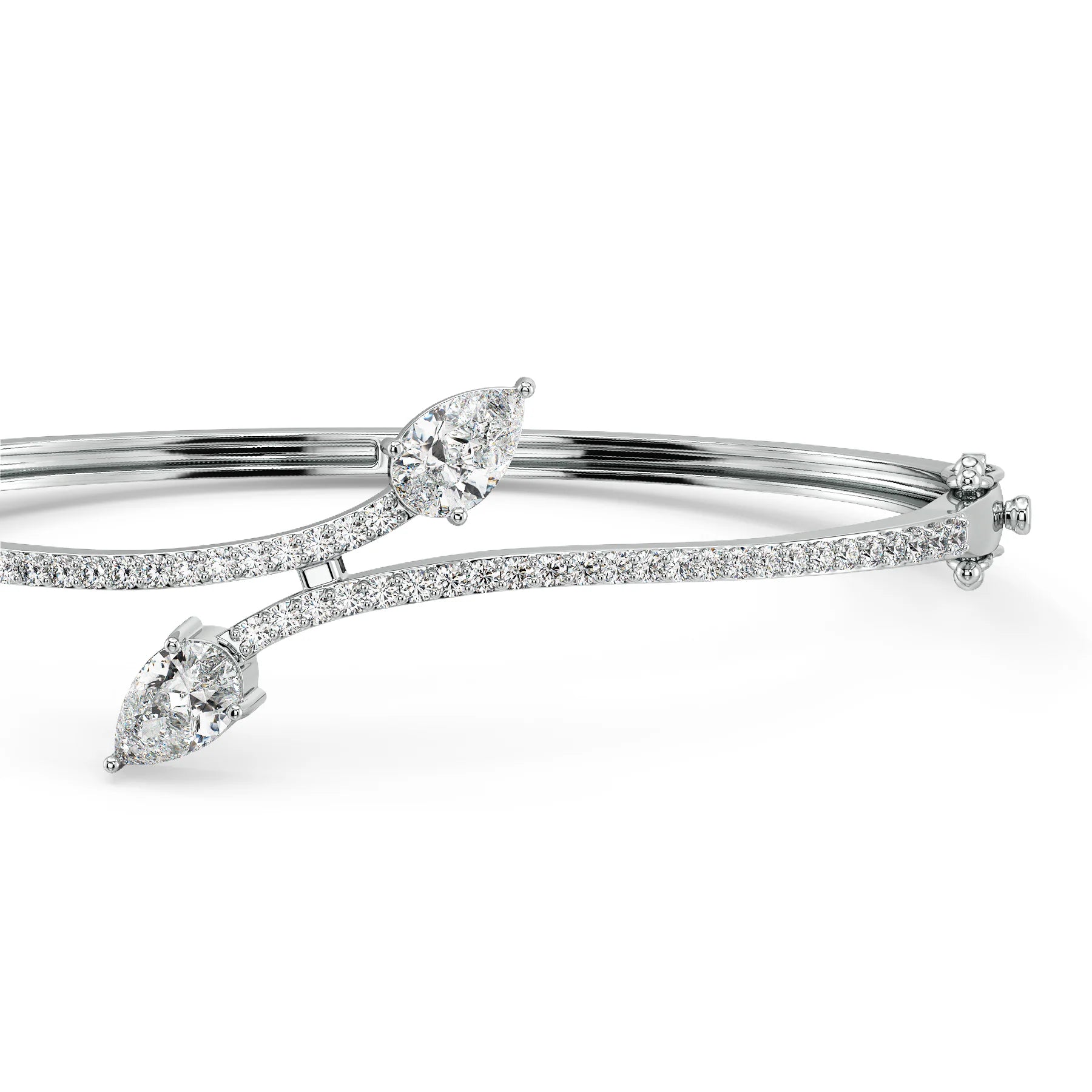 The Marguerite Elegant Studded Bangle embodies timeless sophistication with a modern twist. Crafted in radiant rose gold, this exquisite design features two dazzling pear-shaped lab-grown diamonds that meet in a graceful, open-ended embrace. The slender band is meticulously studded with a line of brilliant round diamonds, adding a touch of sparkle and refinement. A perfect statement of grace and glamour — ideal for elevating any occasion with effortless elegance. ✨💎