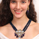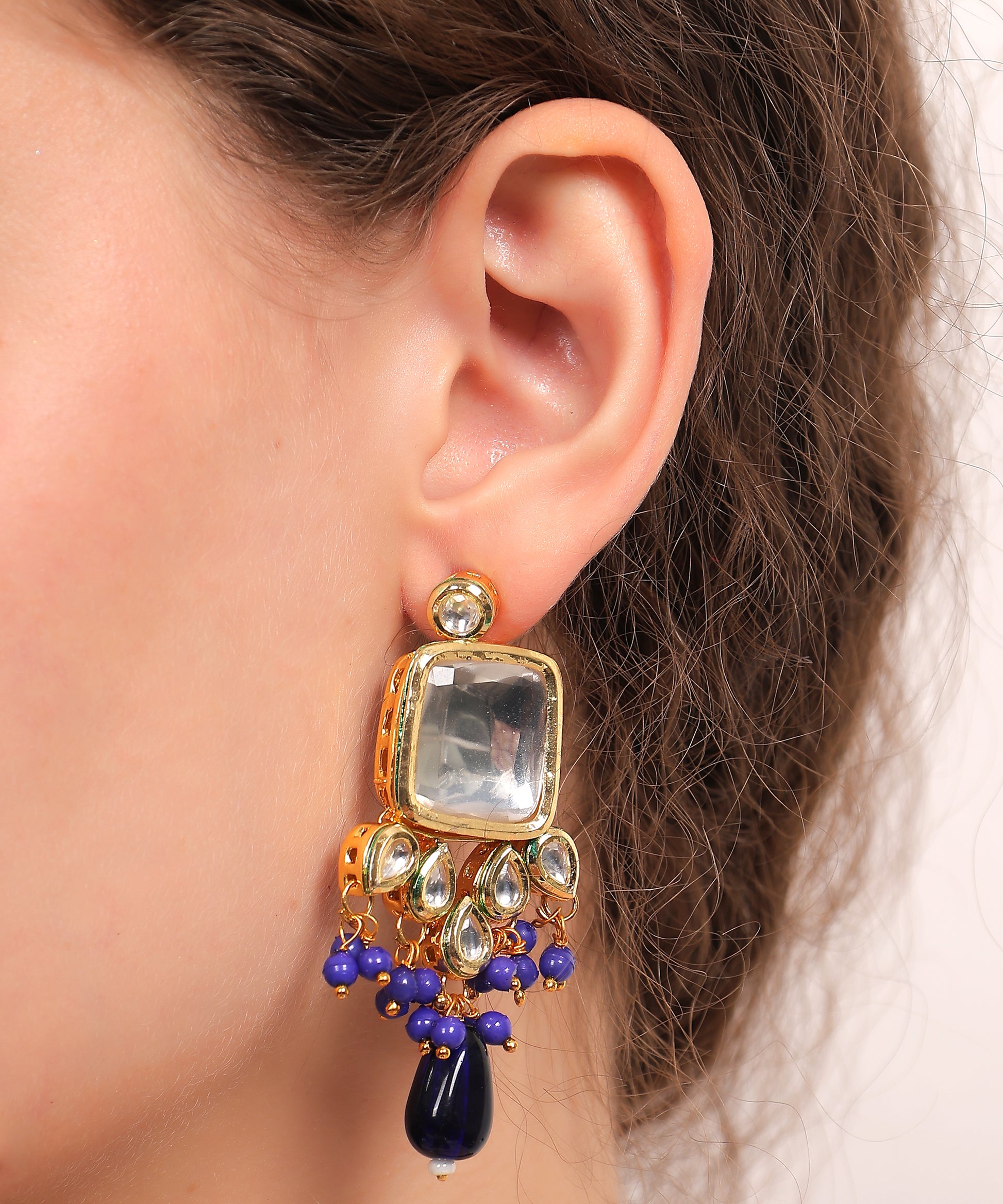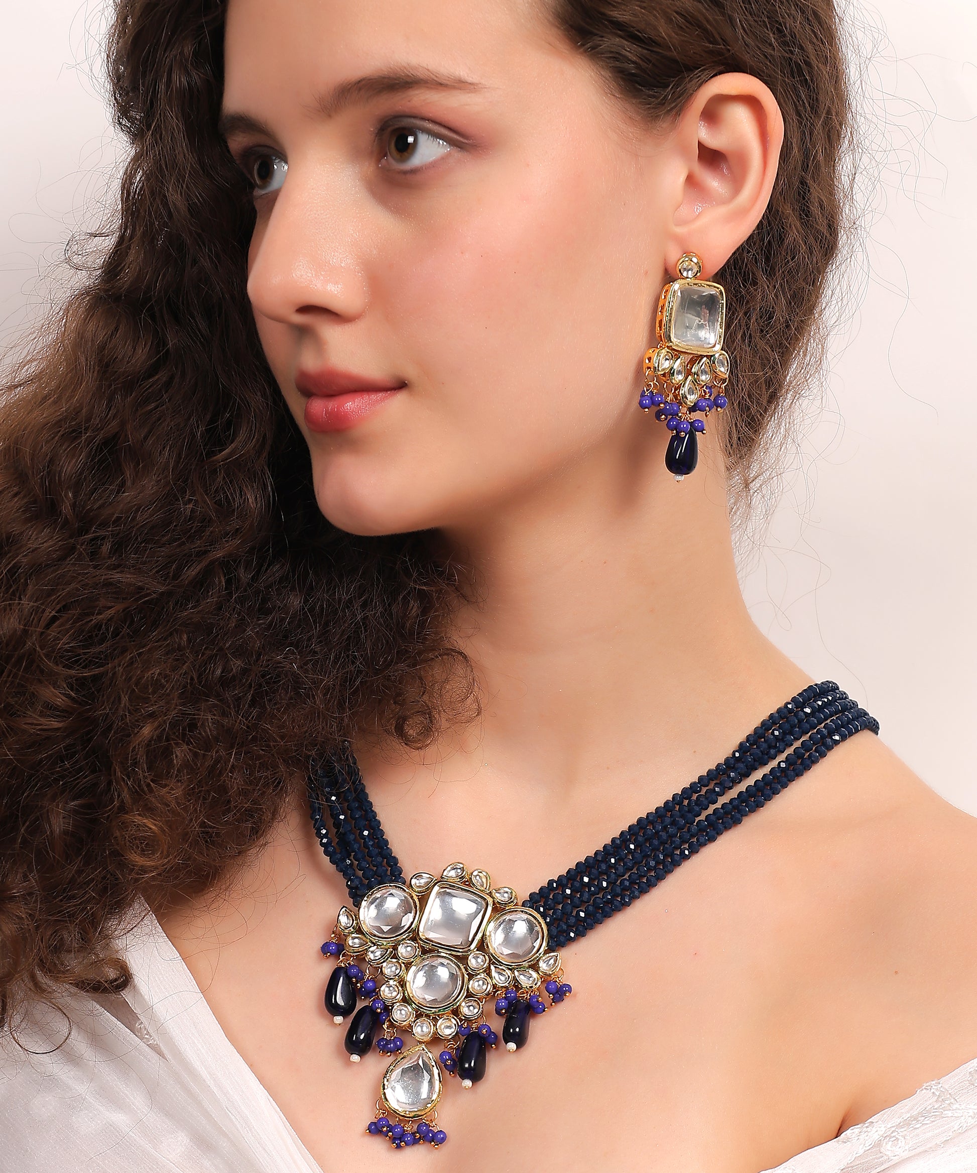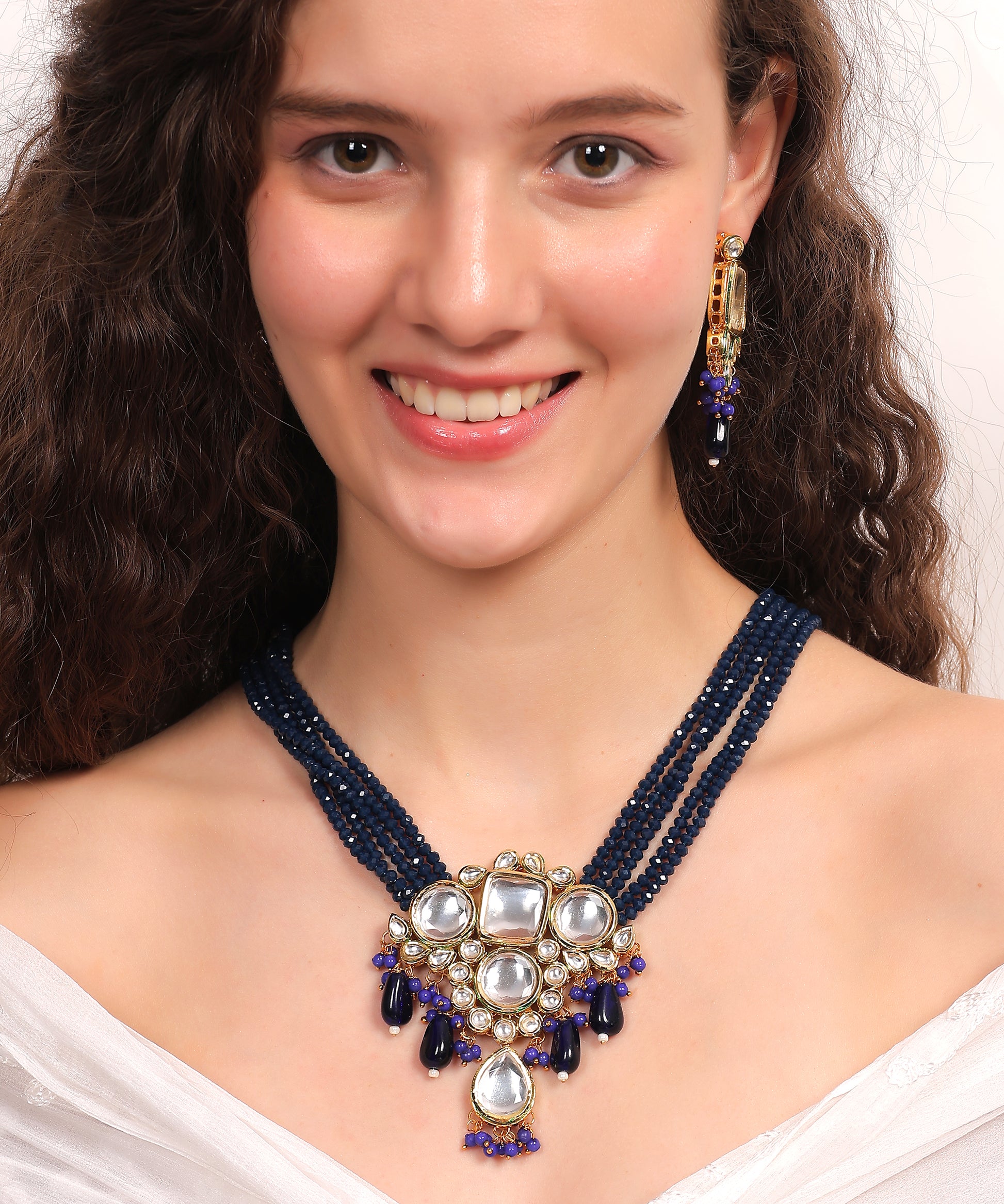 The Moissanite Kundan Set is a majestic piece that captures the essence of regal elegance. Featuring a stunning arrangement of brilliant Moissanite stones set in traditional Kundan craftsmanship, this necklace is paired with deep navy blue beads and royal blue accents. The intricate pendant design, adorned with pearl and bead embellishments, exudes timeless charm and grandeur. Perfect for special occasions, this set adds a bold and luxurious statement to any ensemble.