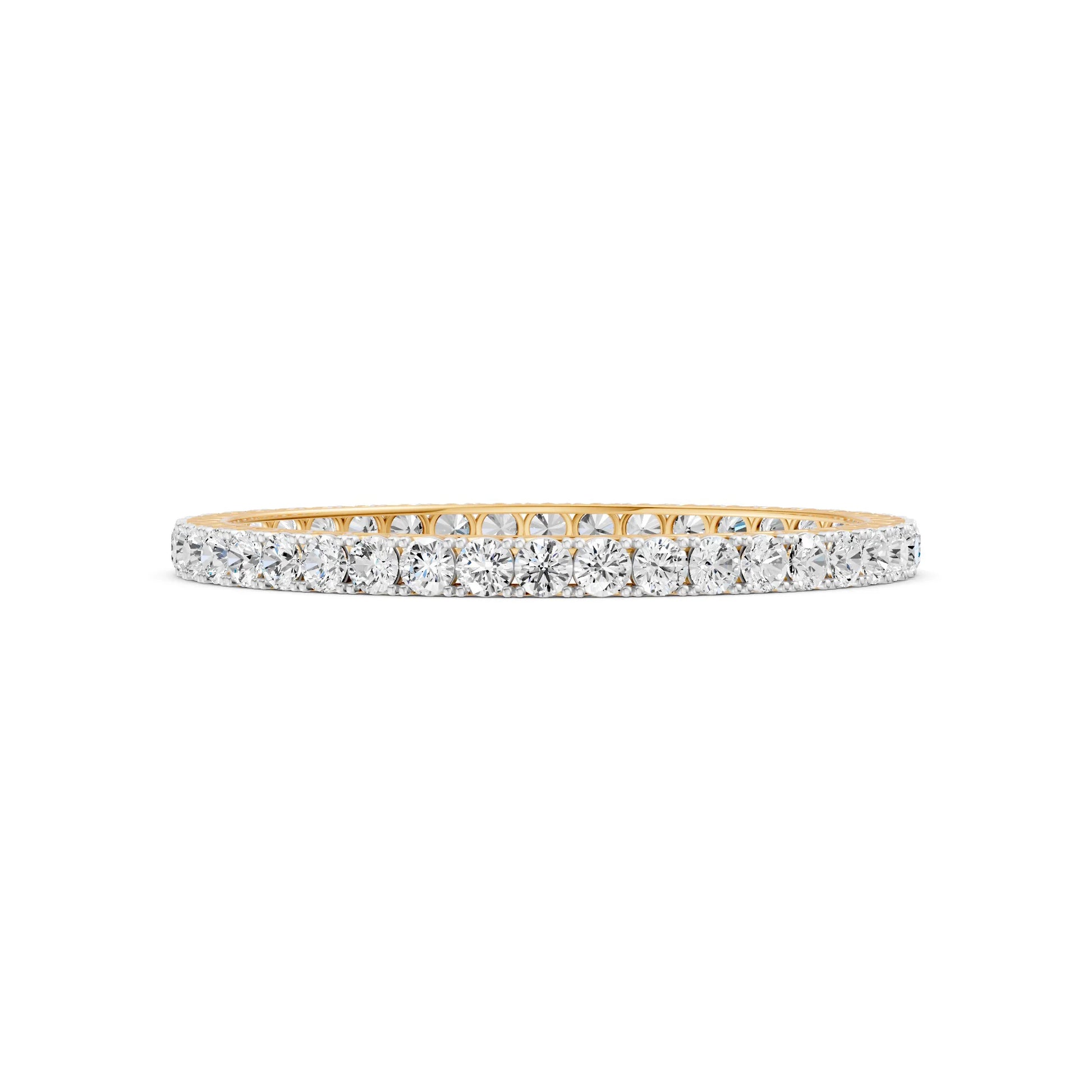 Grace and brilliance come together in this exquisite eternity bangle. Crafted in rich yellow gold, it features a seamless row of round-cut lab-grown diamonds that encircle the wrist in continuous sparkle. The intricate lattice detailing on the inner band adds a touch of artistry and refinement. Perfect for both daily elegance and special occasions, this bangle symbolizes endless beauty and everlasting charm.