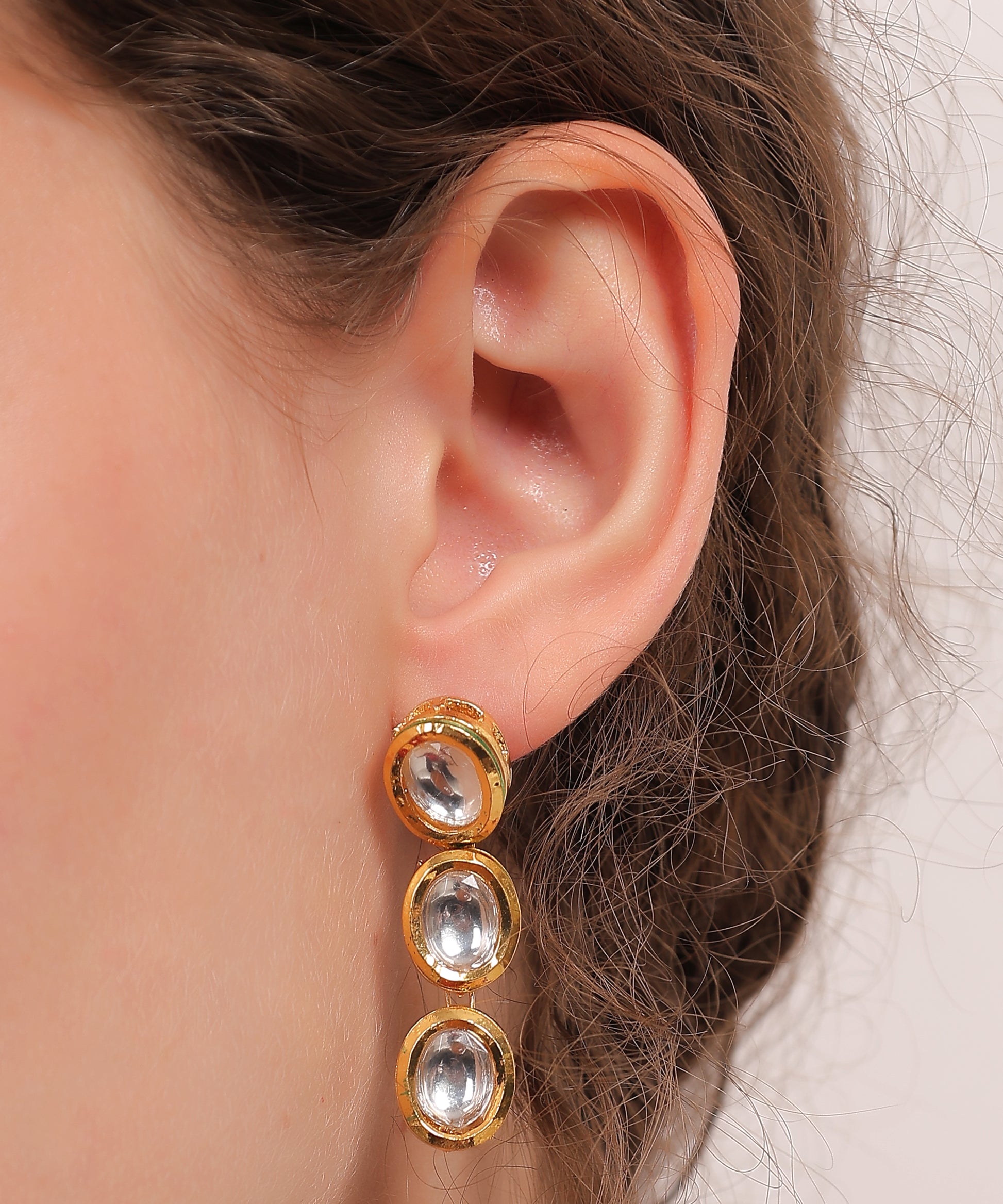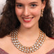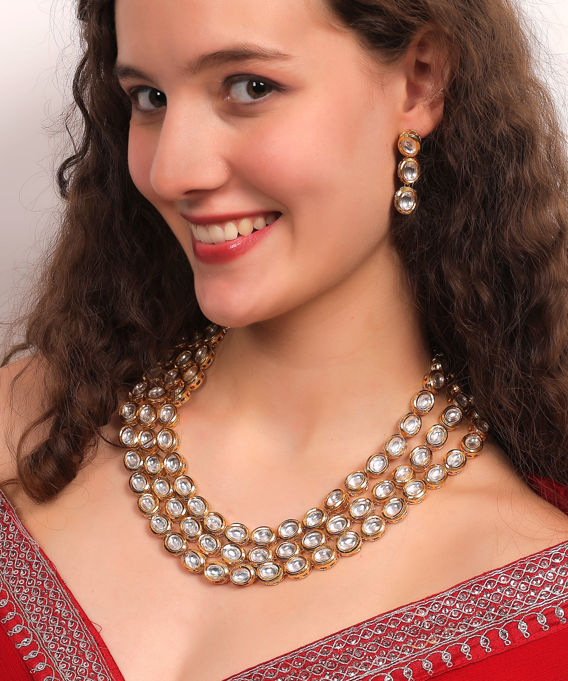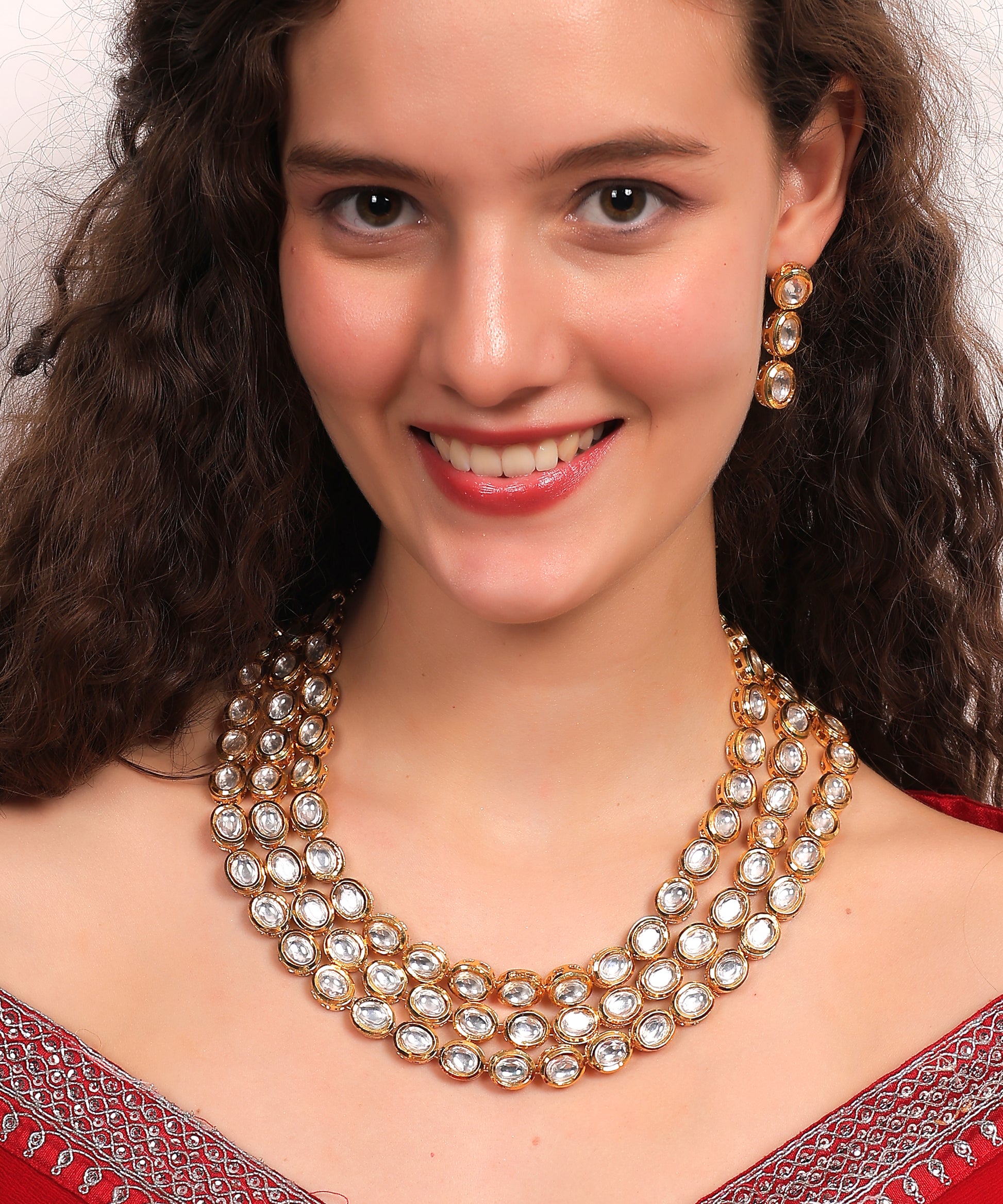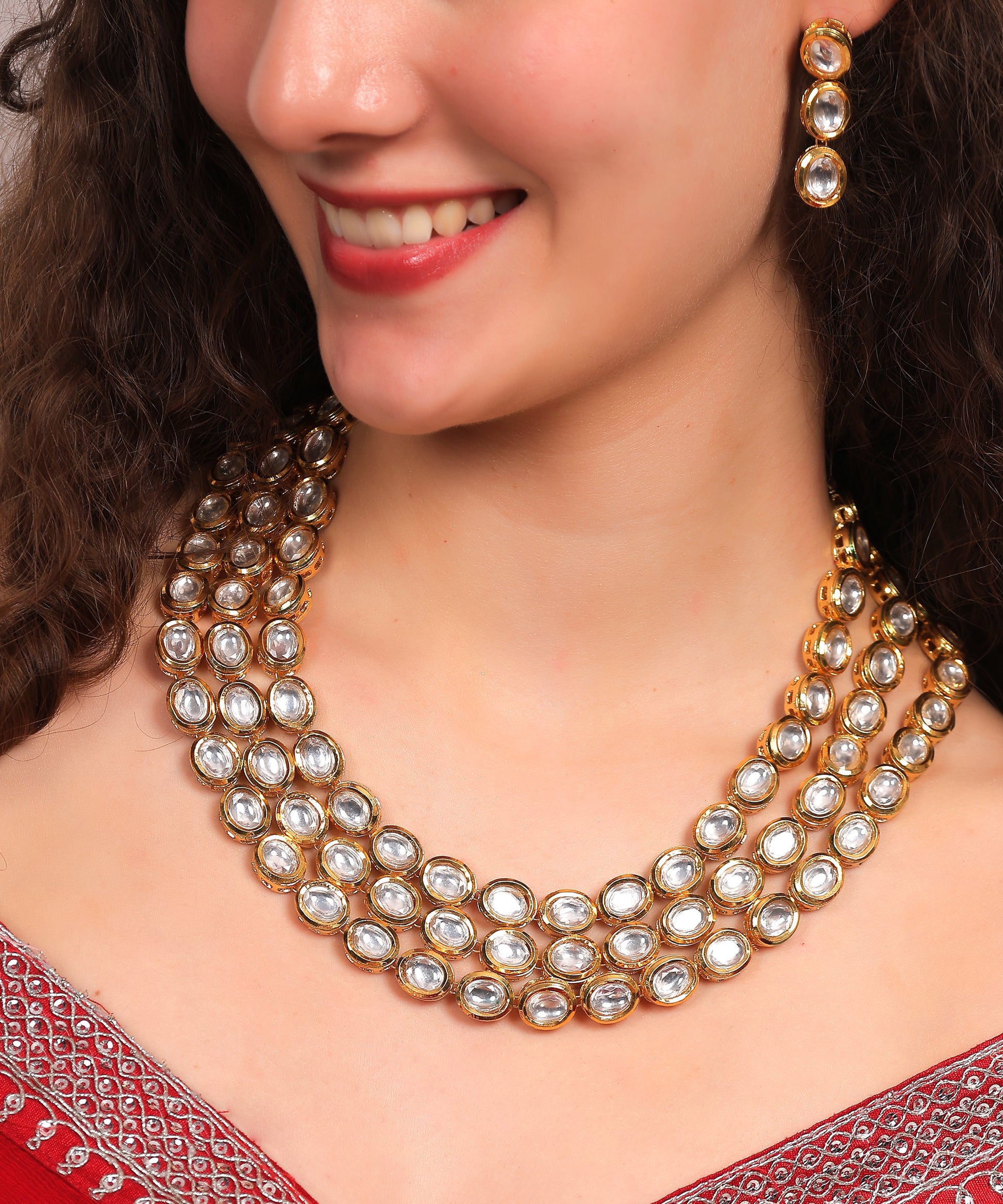 Noor Kundan Set  a radiant expression of traditional elegance, this stunning necklace set features three layers of handcrafted Kundan work, embellished with high-shine Moissanite stones. The uniform oval settings in a gold finish exude regal charm, while the matching drop earrings complete the look with timeless grace. Perfect for weddings, festive occasions, or statement moments.