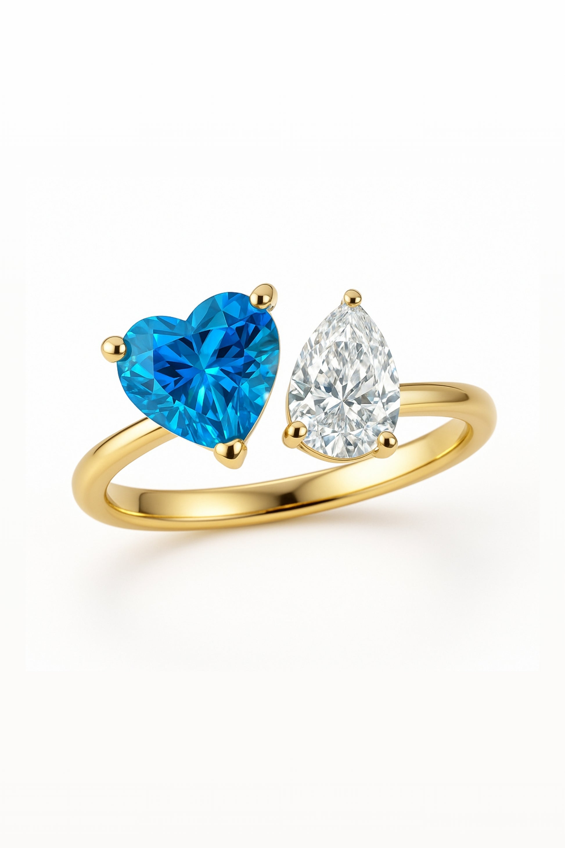 The Ocean Heart Ring is a modern symbol of love and harmony. Featuring a striking heart-cut blue gemstone paired with a pear-cut diamond, it represents the perfect union of passion and purity. The stones are set on a sleek open gold band, creating a balance of elegance and contemporary charm. A radiant piece that captures both the depth of the ocean and the brilliance of everlasting love.
