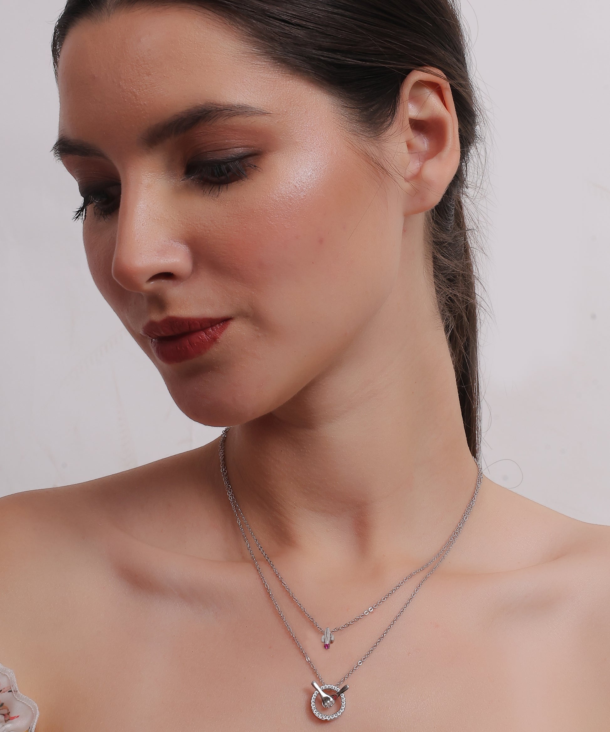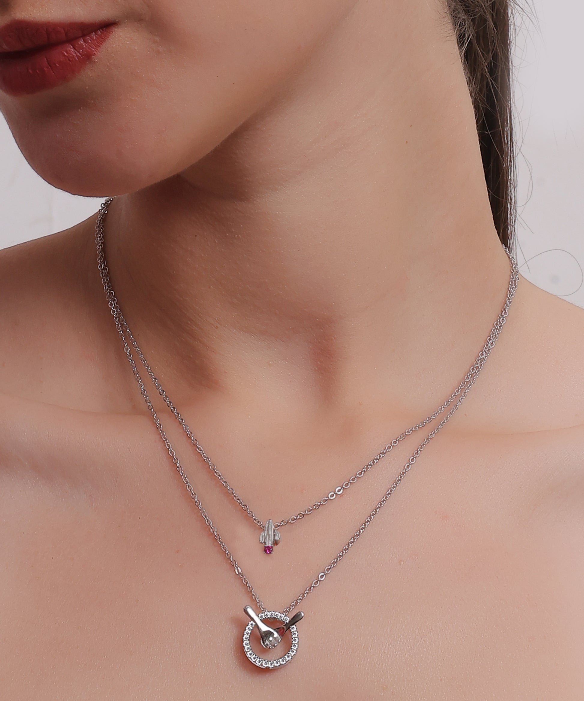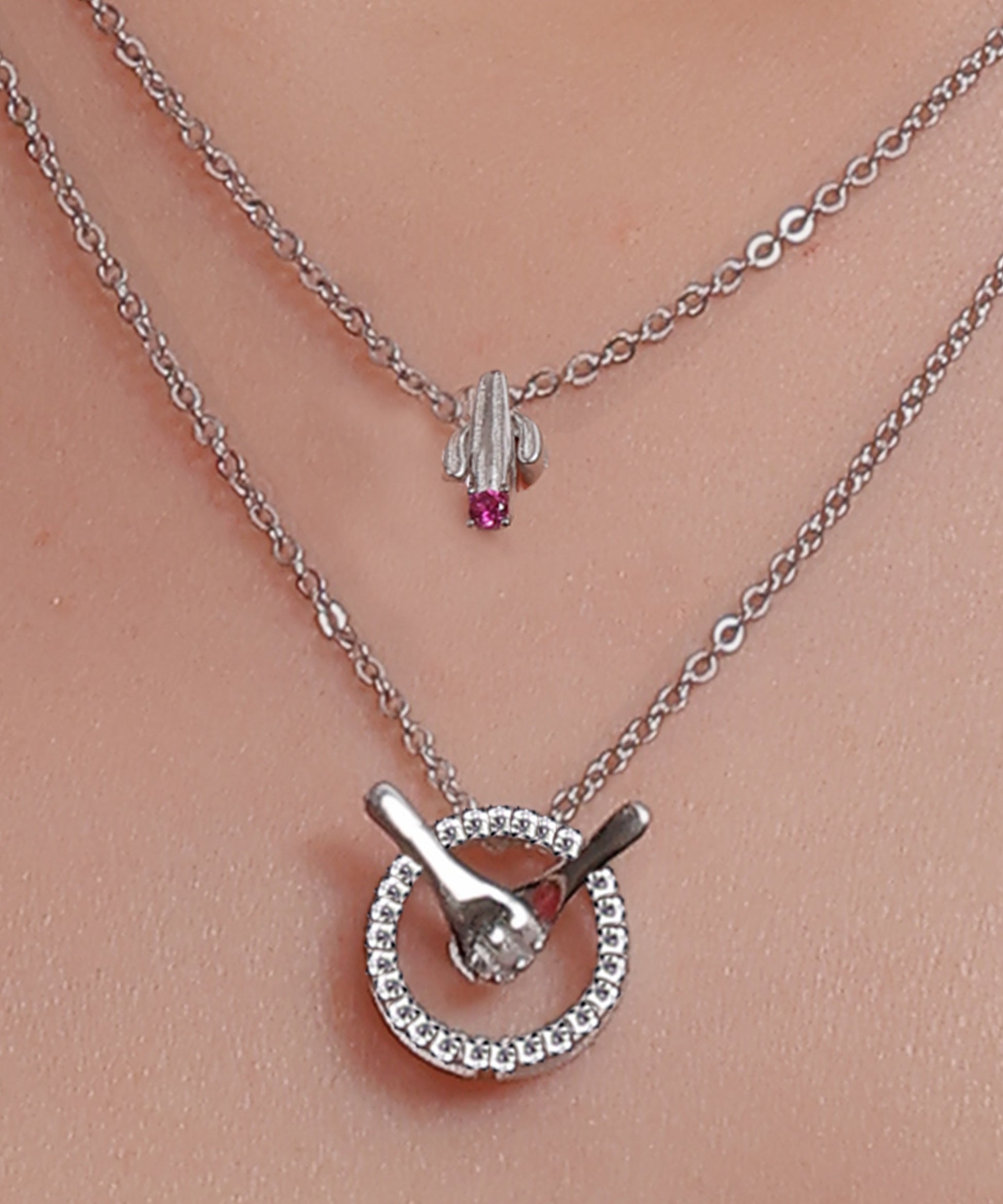The Kalliski Silver Orbit of Togetherness Necklace features a rocket charm with a pink gemstone and a sparkling orbit pendant. This layered silver piece symbolizes unity and adds timeless elegance to any outfit.