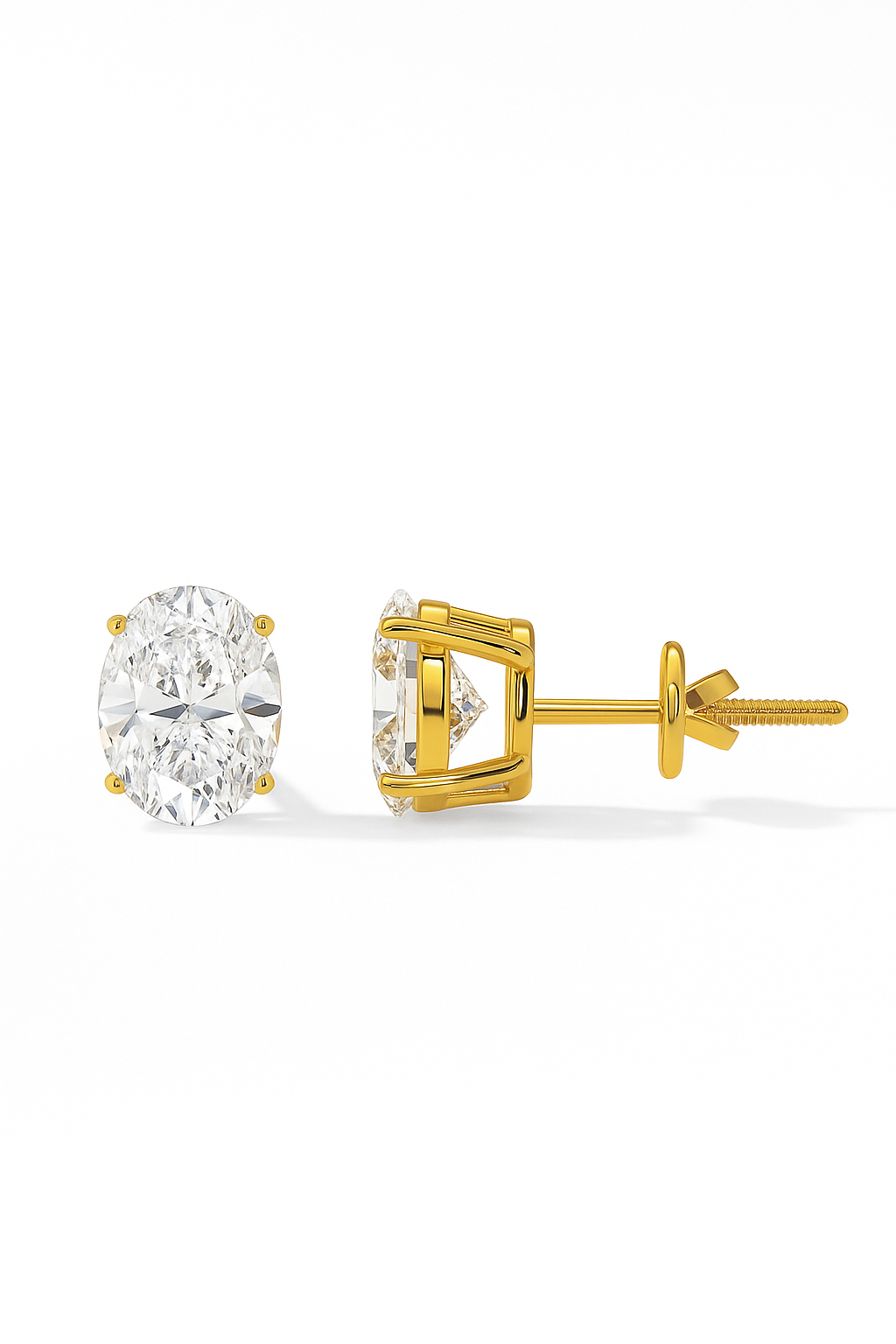 These are oval-cut lab-grown diamond solitaire stud earrings in a yellow gold four-prong setting with screw-back closures. A timeless and elegant design, they highlight the brilliance and elongated beauty of the oval cut, making them a versatile luxury essential.