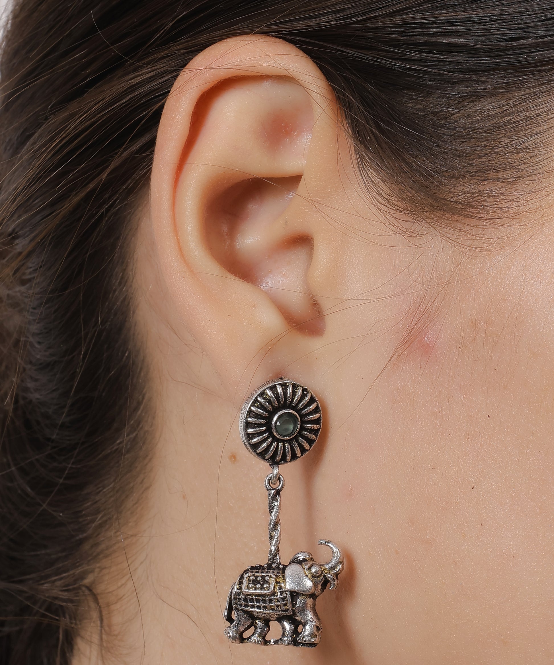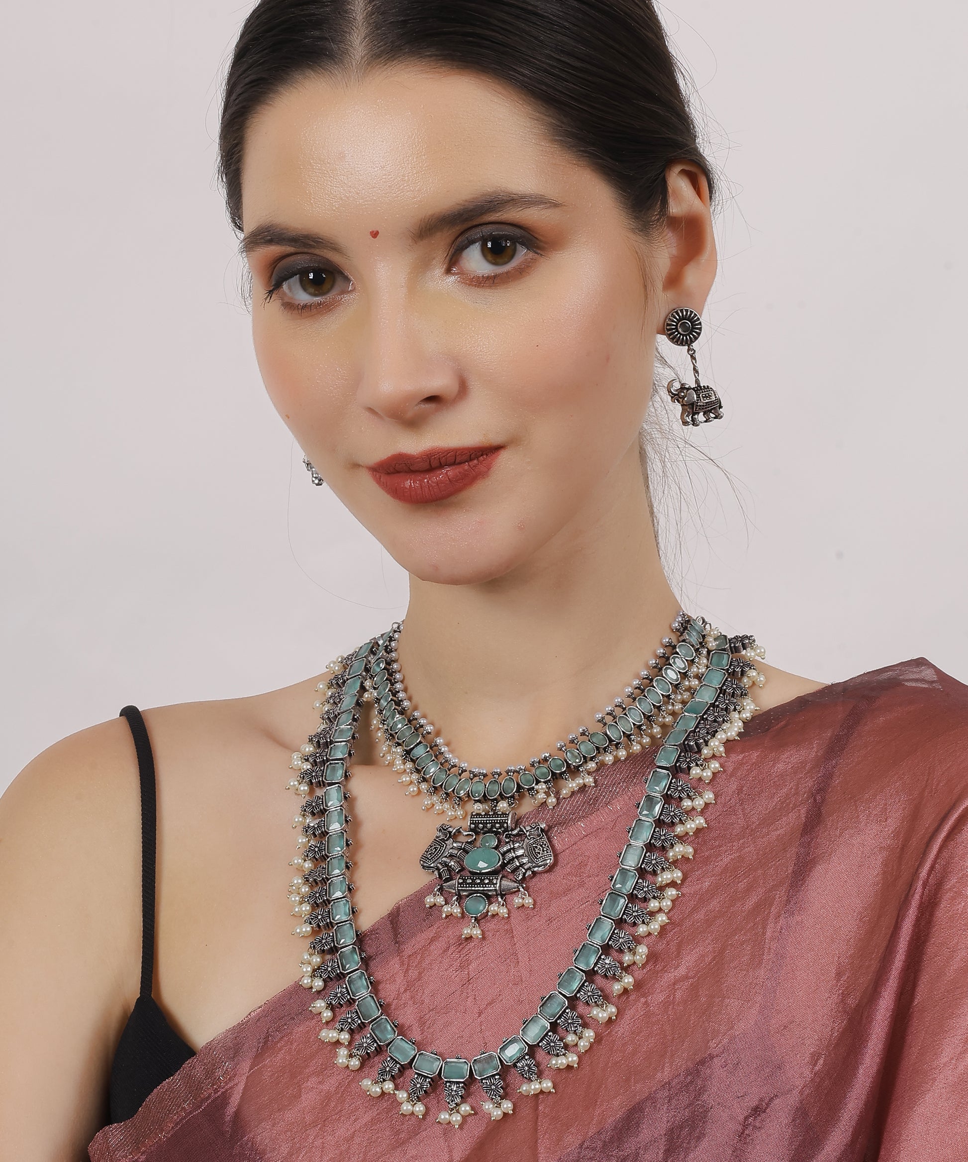 The Kalliski Oxidized Vintage Layered Grace Set is an extraordinary statement of elegance and allure. At its heart lies a stunning arrangement of mint-green stones, beautifully complemented by delicate pearl accents, exuding a sense of timeless charm.