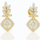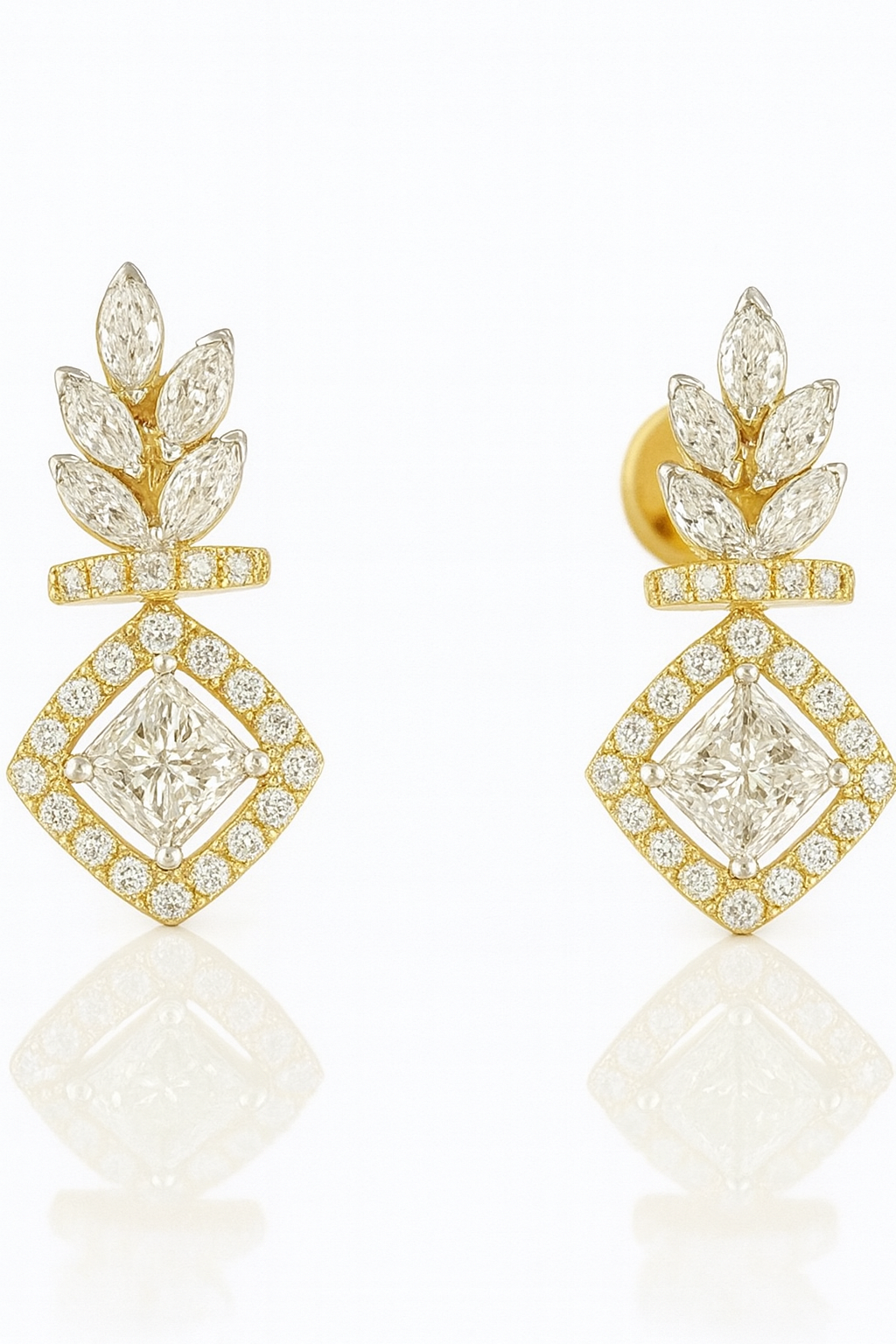 These are princess-cut lab-grown diamond earrings in yellow gold, featuring a halo of pavé-set round diamonds around the center stone and topped with a leaf-like cluster of marquise-cut diamonds. The design is nature-inspired yet regal, combining geometric precision with organic flow.