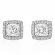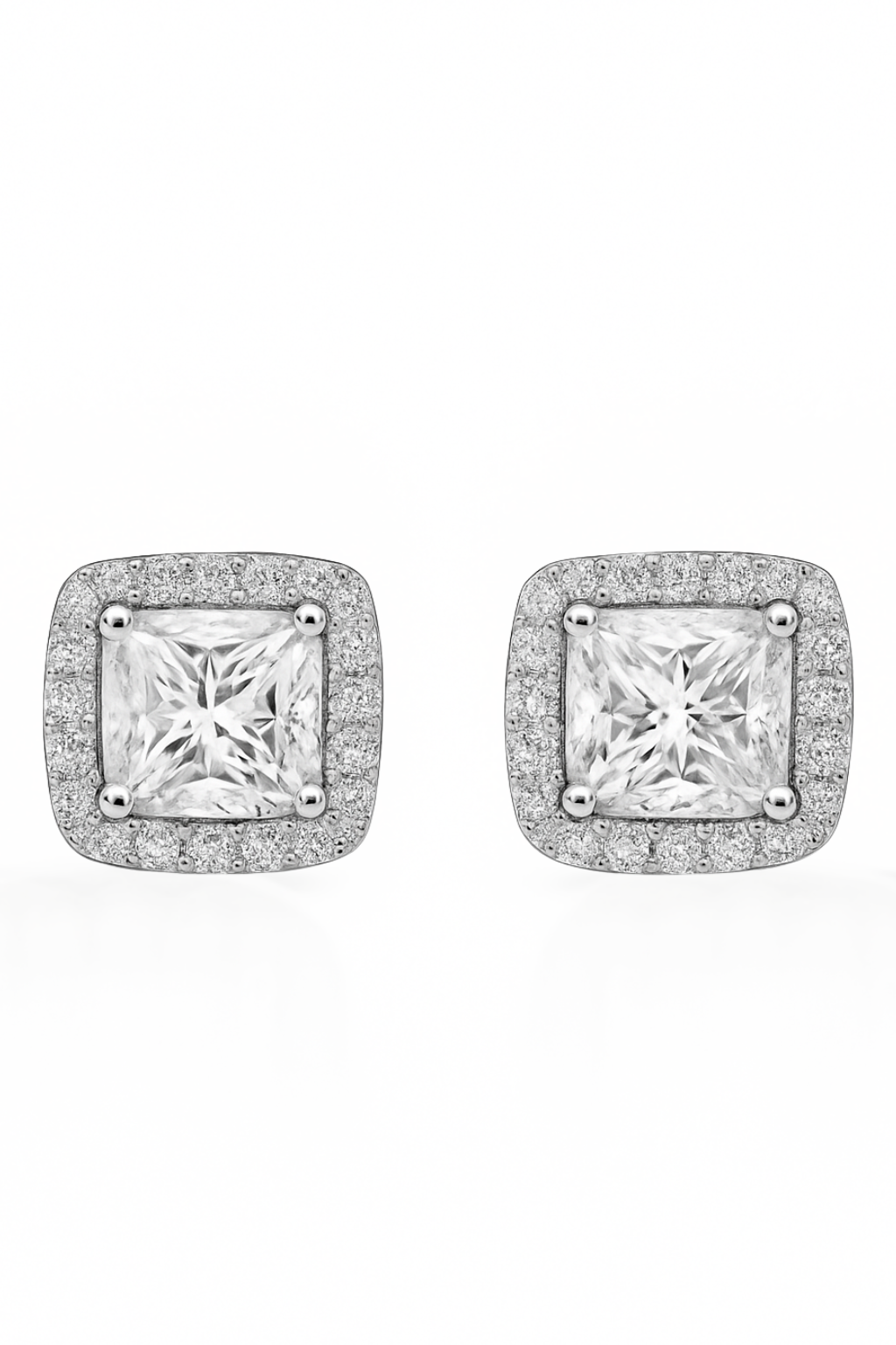 These are elegant princess-cut diamond halo stud earrings set in white gold/platinum, featuring a center lab-grown diamond surrounded by a halo of pavé-set diamonds. ✨