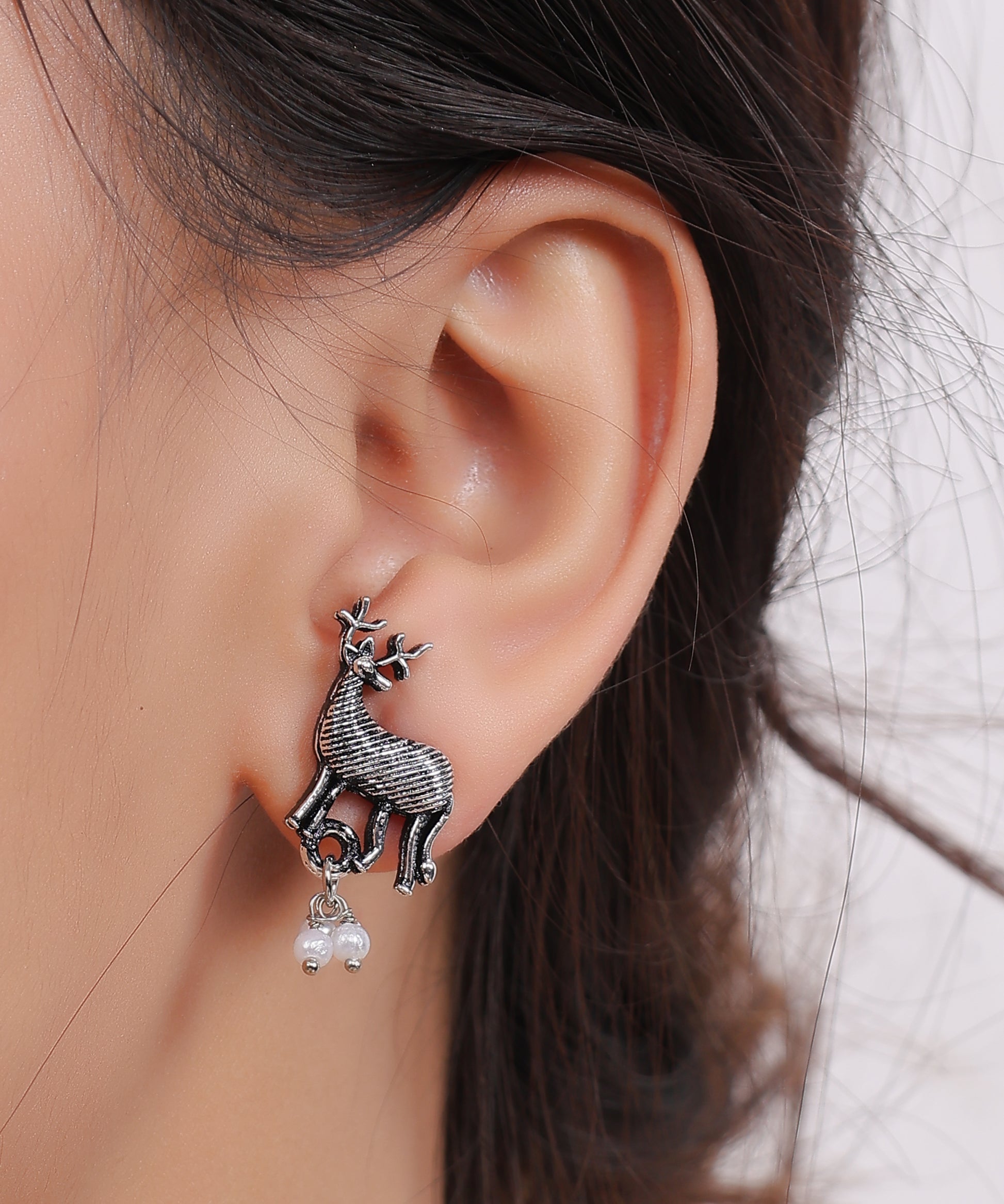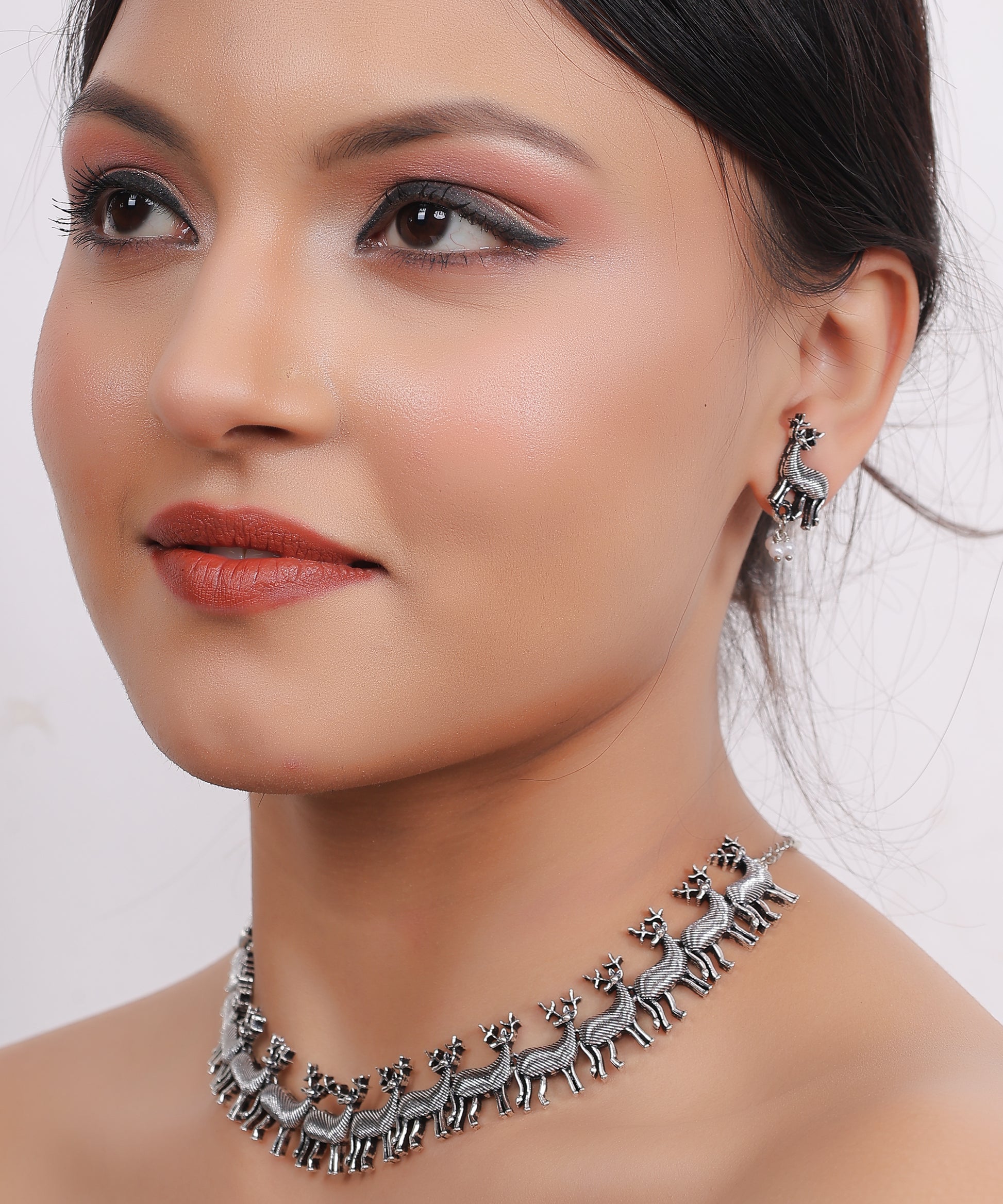 The Kalliski Oxidized Regal Reindeer Choker is a bold statement piece, featuring an exquisite row of intricately crafted oxidized silver deer motifs. Each finely detailed reindeer embodies grace and strength, creating a striking fusion of nature-inspired charm and timeless elegance.