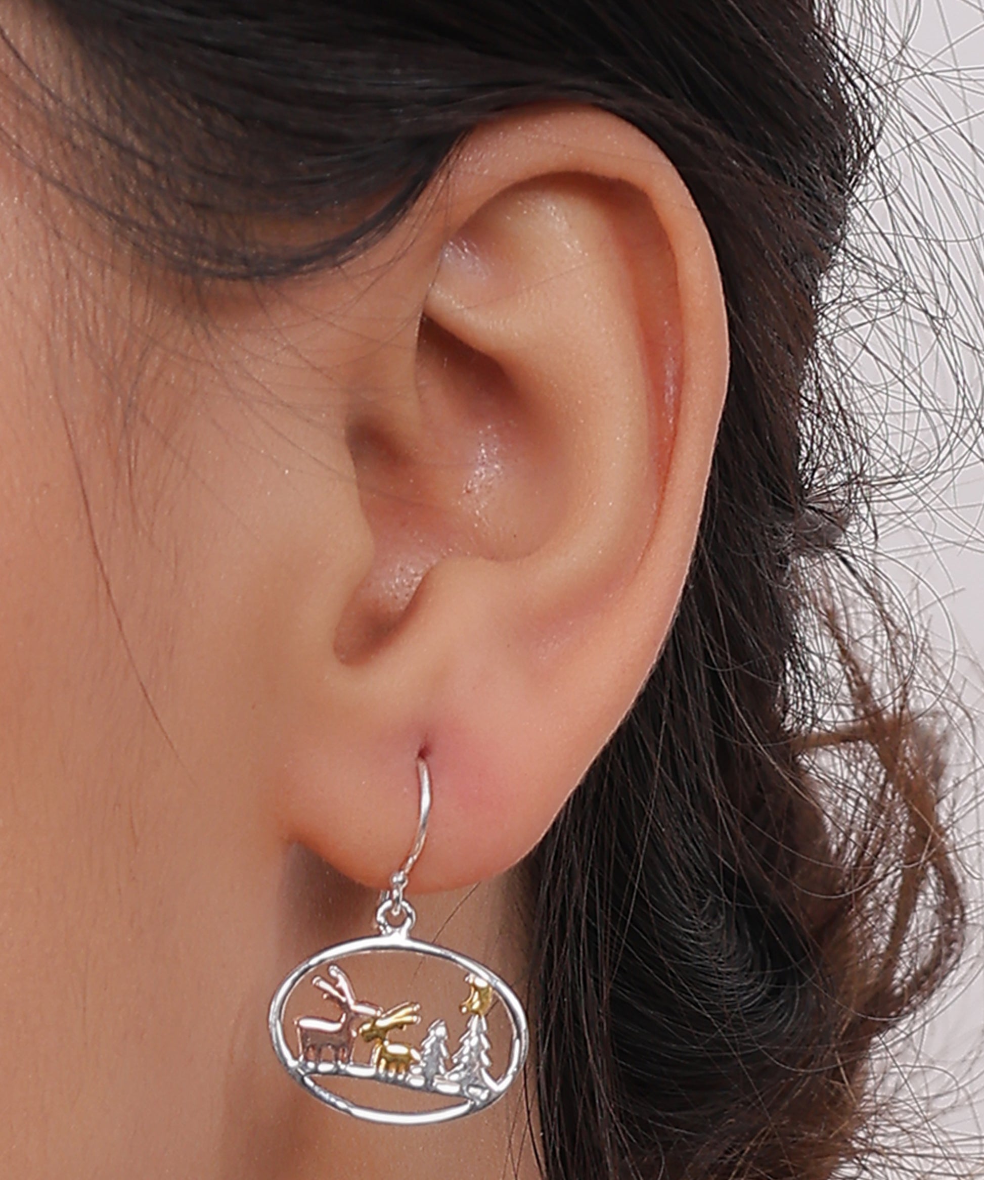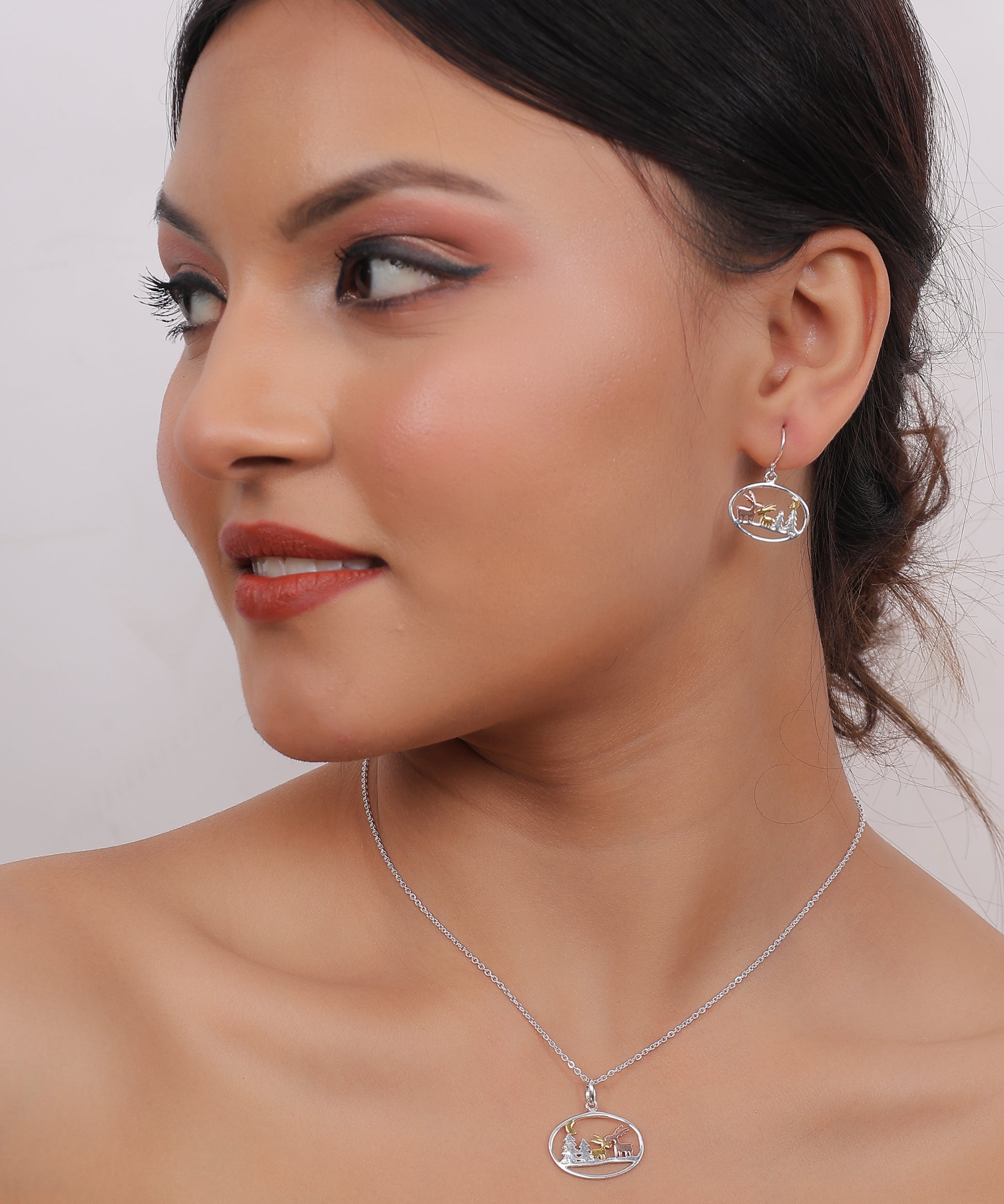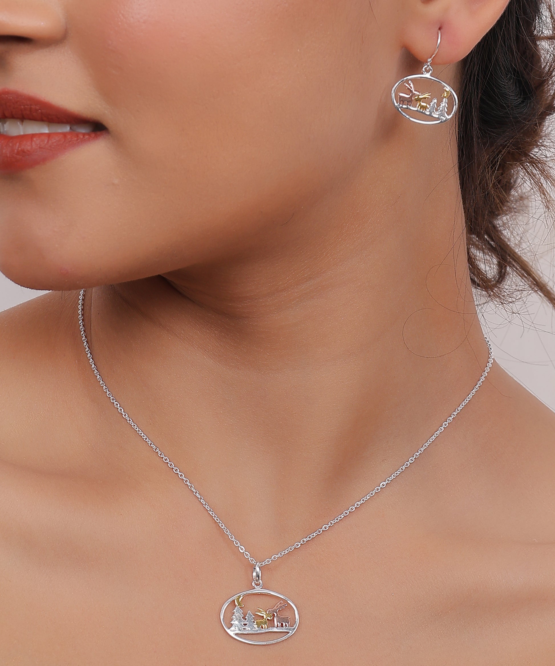The Kalliski Silver Reindeer and Pine Forest Jewelry Set is a charming and nature-inspired piece, featuring a delicately crafted oval pendant and matching earrings adorned with intricate designs of reindeer and pine trees. This elegant set captures the beauty of the outdoors, making it a perfect accessory to add a touch of whimsy and sophistication to any outfit.