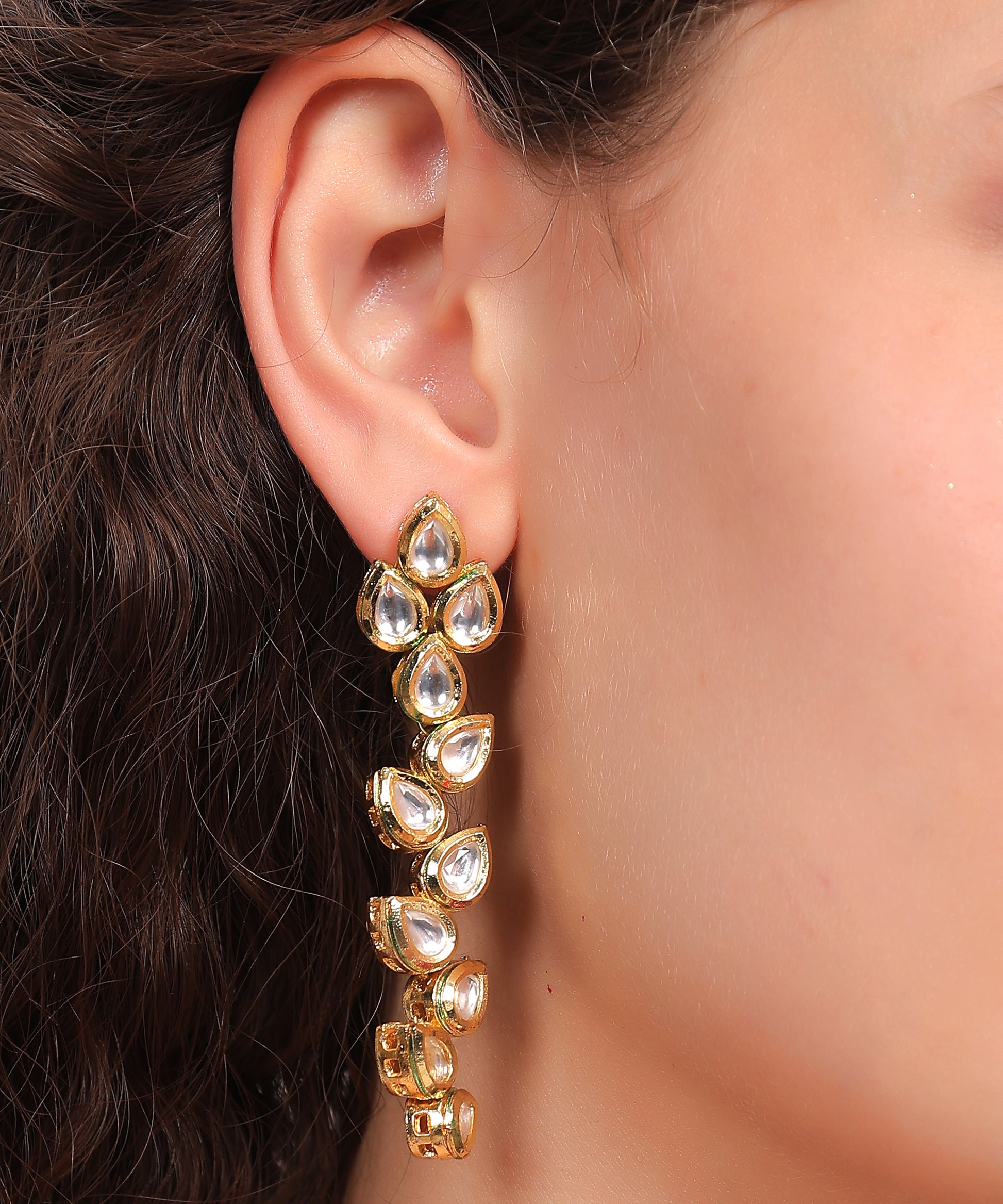 Royal Dewfall Drop Earrings a timeless beauty, these cascading earrings feature tear-shaped uncut stones in a delicate gold setting. The fluid, falling design evokes the elegance of raindrops, making them ideal for weddings, sangeet nights, or festive soirées.