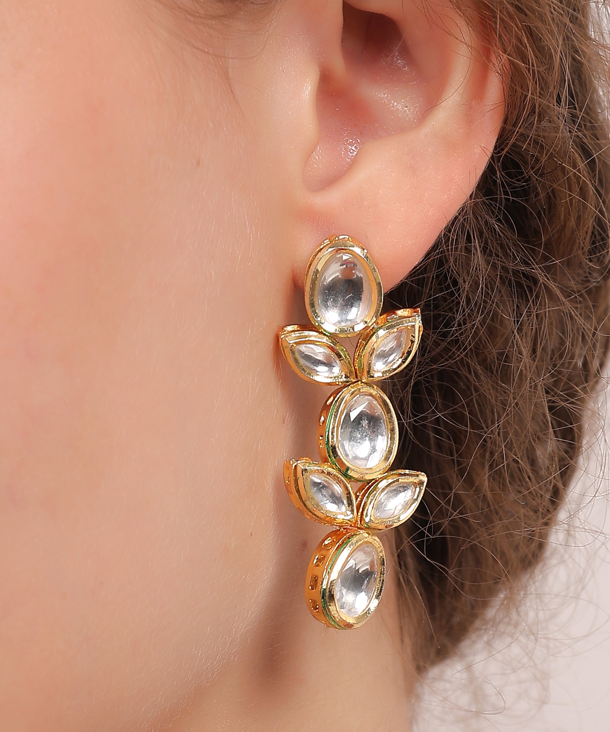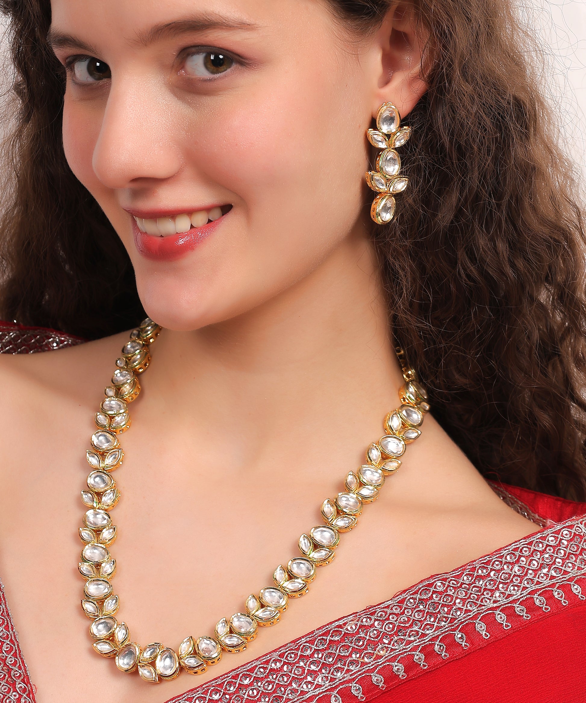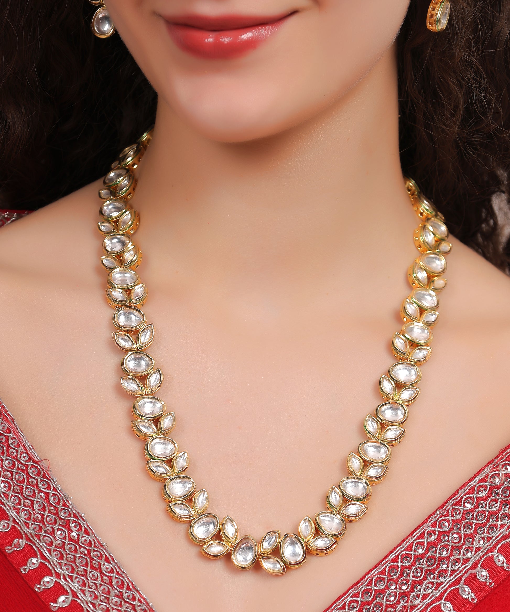 Elevate your traditional ensemble with this exquisiteRoyal Kundan Polki Necklace Set. Handcrafted with precision, this elegant set features high-quality Kundan stones arranged in a timeless floral and oval pattern. The necklace gracefully contours the neckline, while the matching drop earrings complete the regal look. Ideal for weddings, festive occasions, or cultural celebrations, this set pairs beautifully with sarees, lehengas, and ethnic gowns.