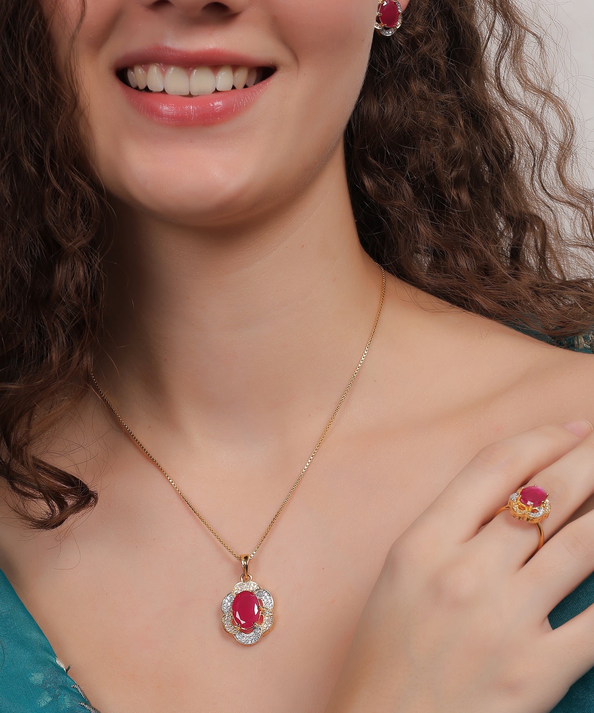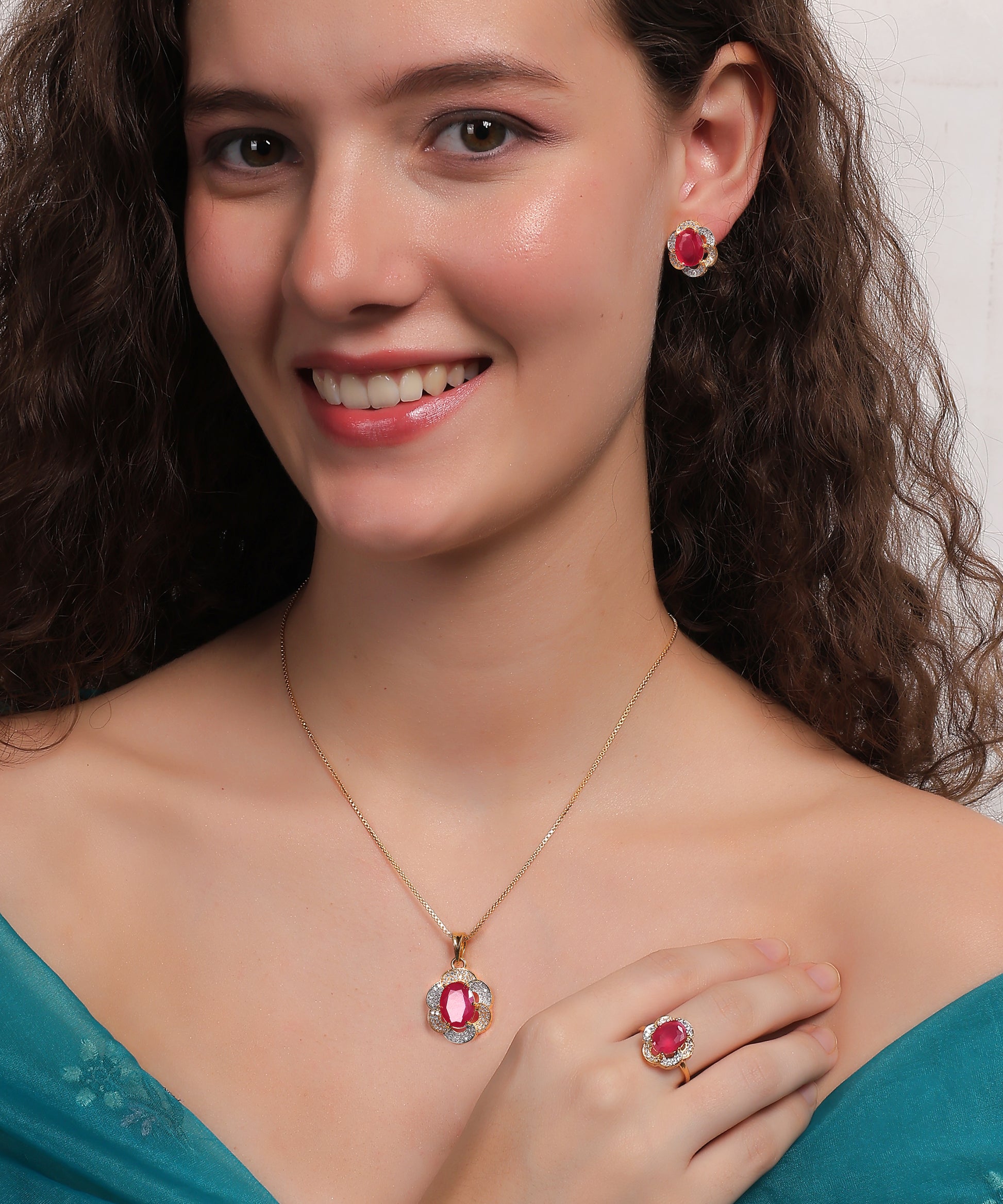 Enhance your ethnic elegance with the captivating Ruby Blossom trio Set. This beautifully coordinated set features a floral-inspired pendant, matching stud earrings, and a striking statement ring — all adorned with rich emerald green stones. Framed by sparkling diamond-cut accents, each piece reflects refined craftsmanship and timeless charm. Perfect for festive occasions, weddings, or evening celebrations, this set pairs effortlessly with sarees, lehengas, and ethnic gowns, adding a touch of regal sophistication to any ensemble.