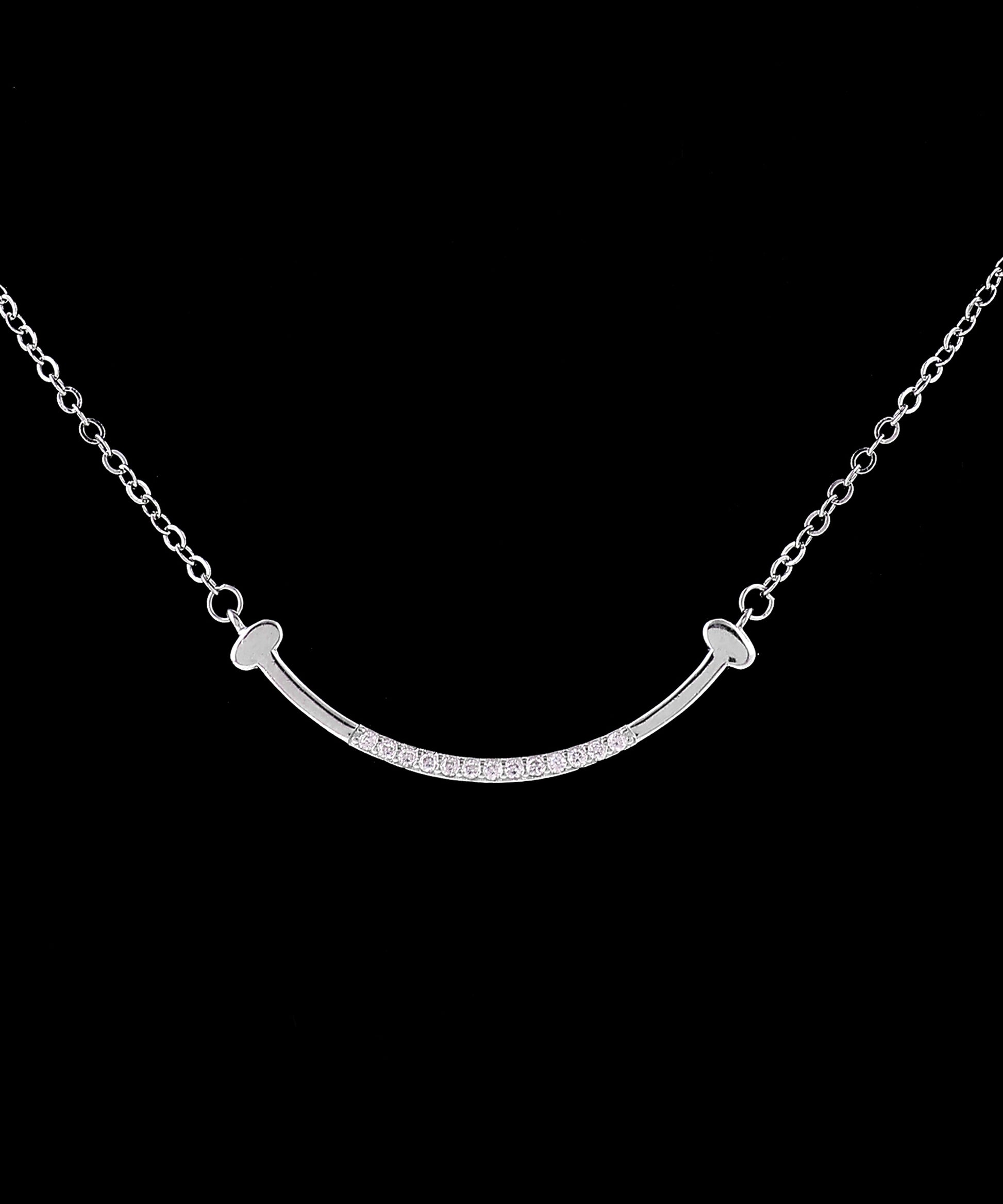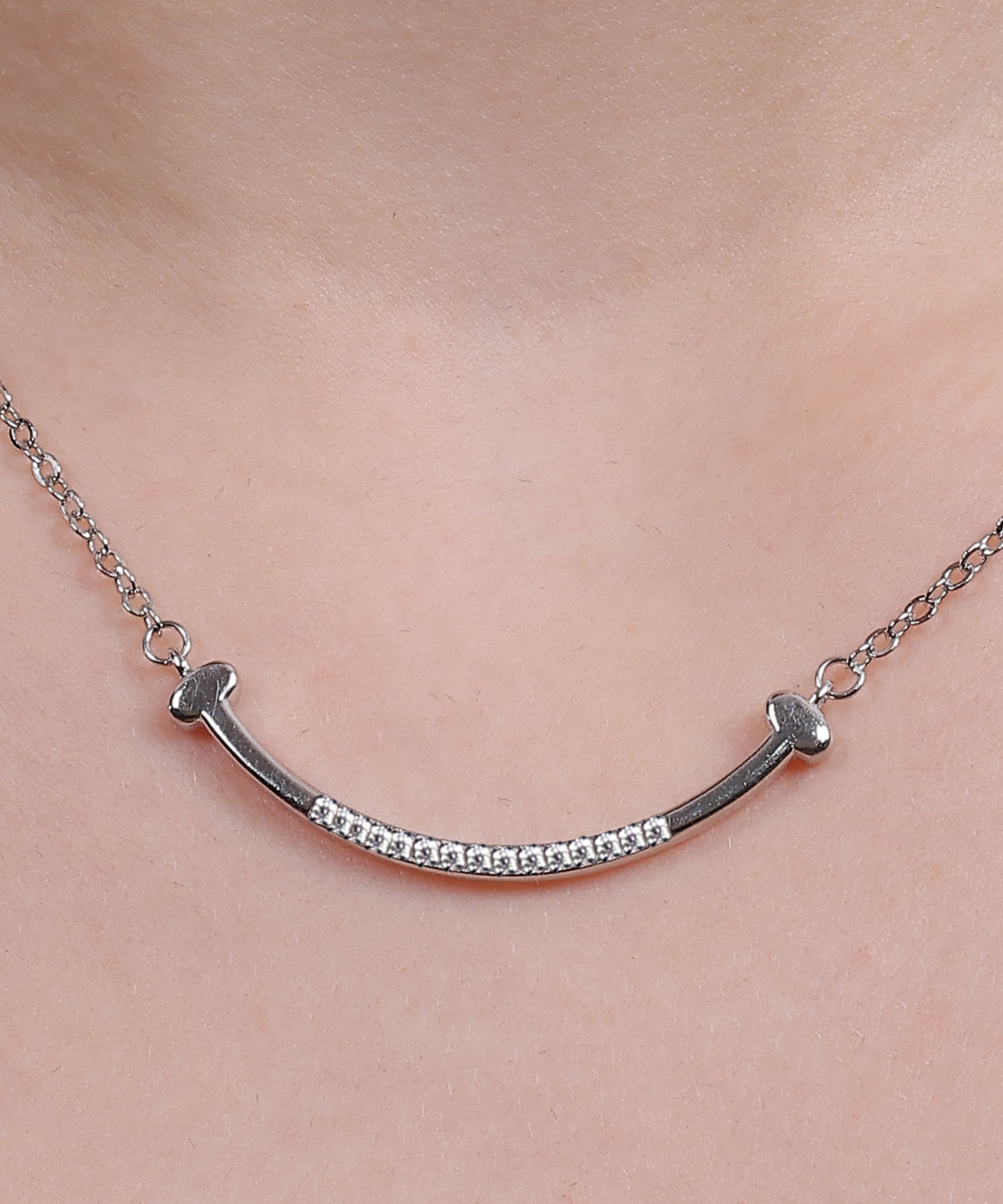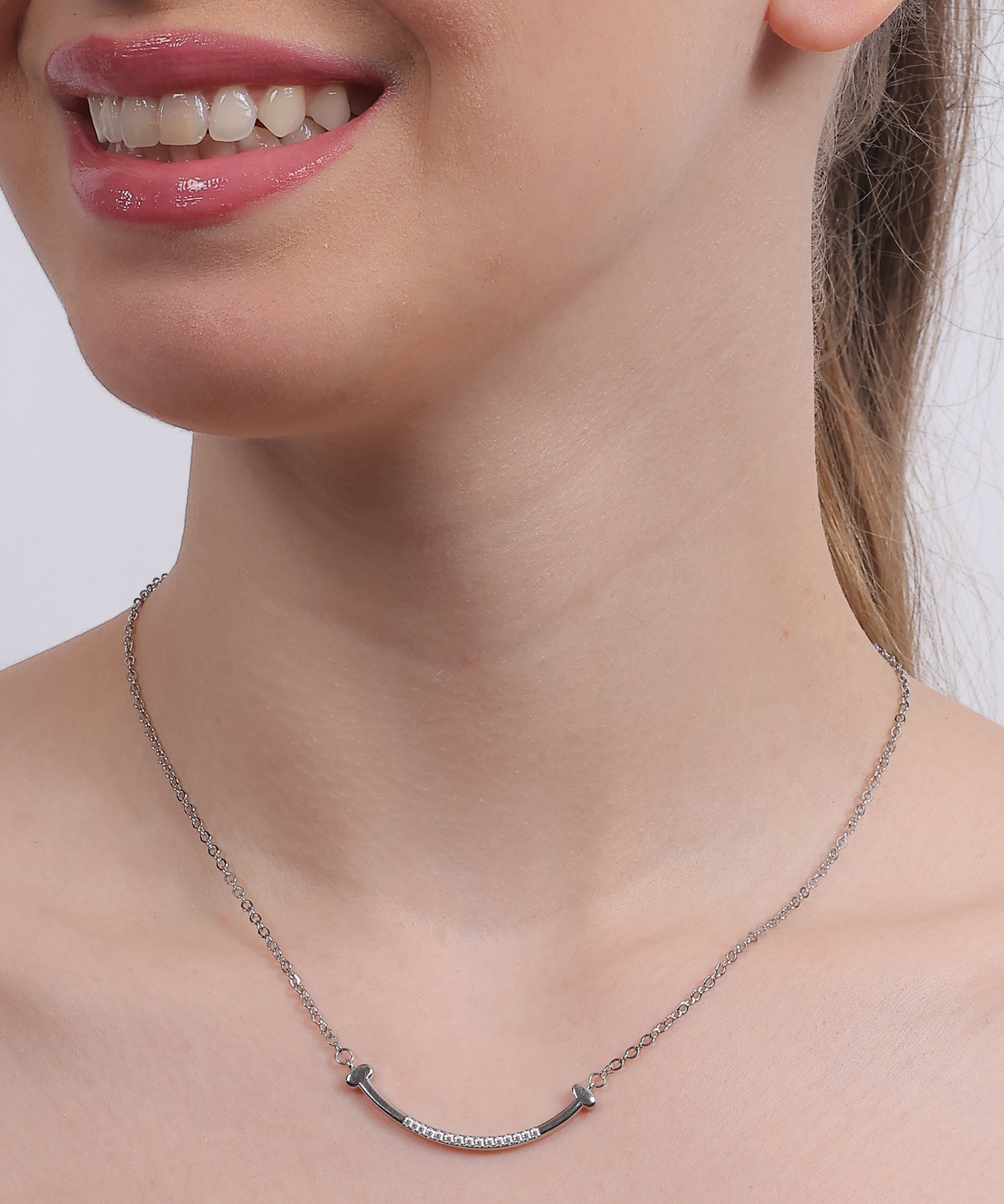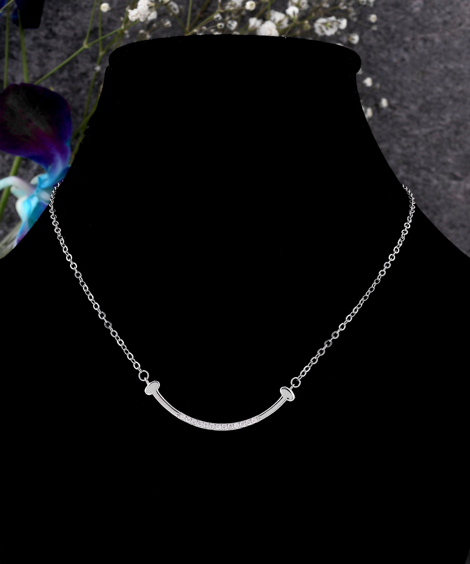 The Kalliski Silver Serenity Curve Pendant is a sleek and elegant piece, featuring a graceful curved bar adorned with shimmering stones. Its minimalist design and timeless appeal make it the perfect accessory to add a touch of sophistication and sparkle to any outfit.