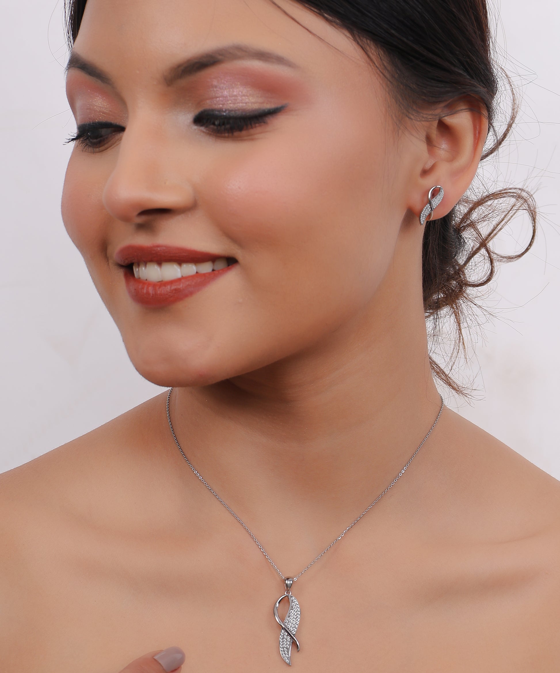 The Kalliski Silver Serenity Curve Set is a modern and elegant jewelry set, featuring a sleek, ribbon-inspired design adorned with shimmering crystals. The pendant and matching earrings exude timeless sophistication, making this set the perfect accessory to add a touch of sparkle and grace to any outfit.