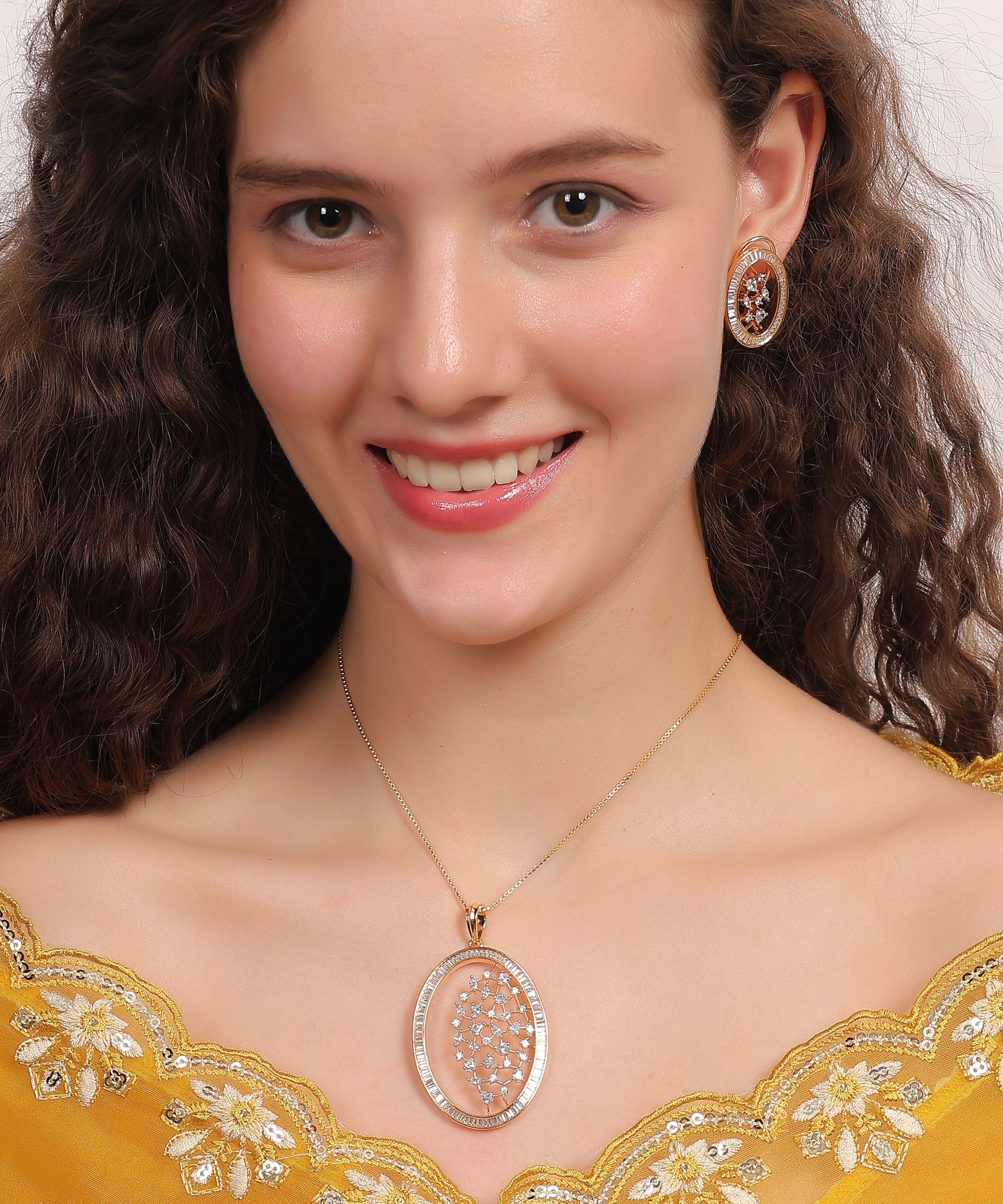 Starlit Harmony Oval Set features a delicate gold-toned chain paired with a statement oval pendant, intricately embellished with a constellation of sparkling white stones arranged in a radiant starburst pattern. The sleek oval frame adds a touch of modern elegance while capturing timeless charm. The matching earrings echo the pendant’s celestial motif, completing the look with refined sophistication and balanced symmetry.