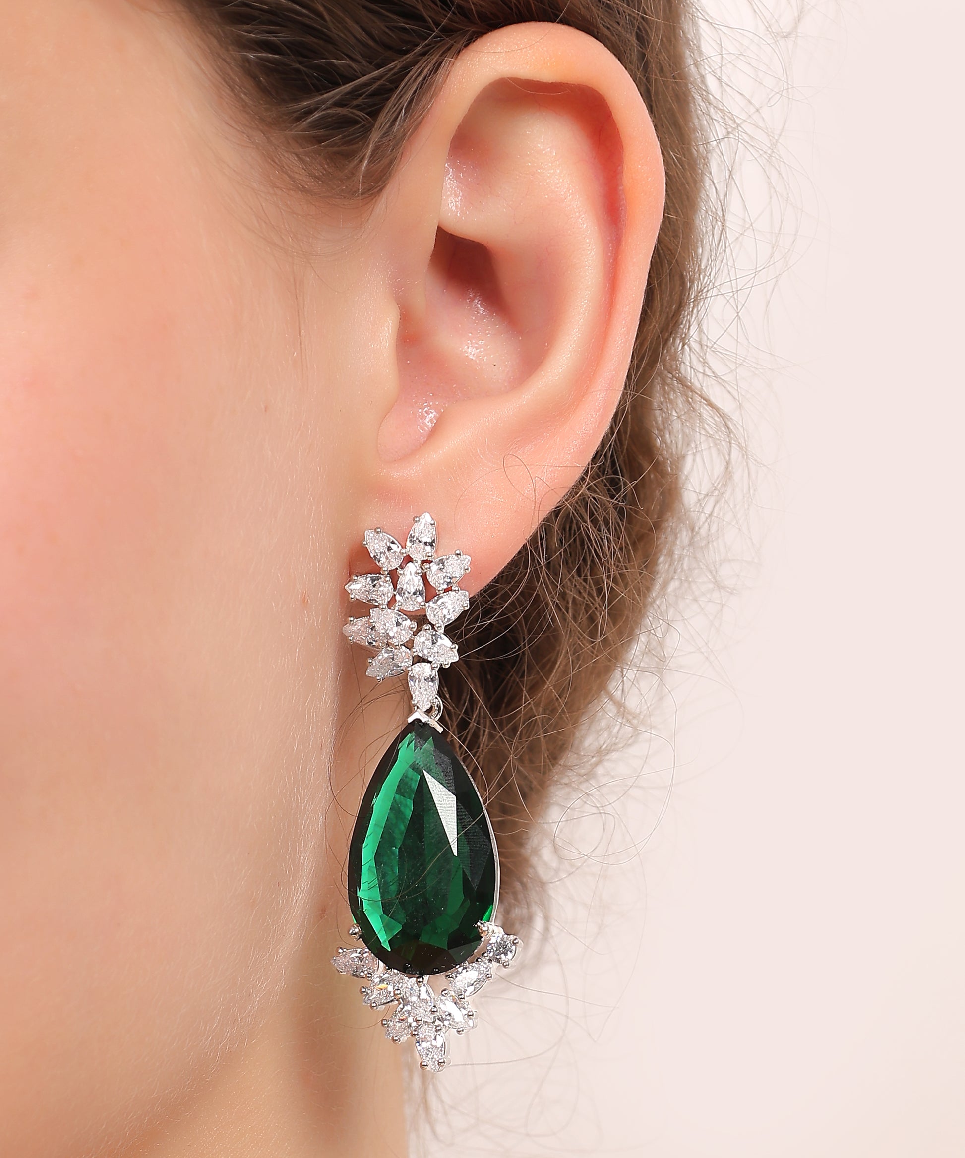 The Emerald Duchess Earrings, a luxurious pair that exudes timeless glamour. These silver-toned statement earrings feature a dazzling arrangement of marquise-cut white stones in a floral cluster, cascading into a bold teardrop-shaped green gemstone centerpiece. Finished with a delicate spray of crystal embellishments at the base, this design captures elegance with a hint of royal charm. Perfect for evening wear, special occasions, or when you simply want to stand out.