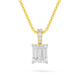 This refined pendant showcases a striking emerald-cut diamond, celebrated for its clean lines and mirror-like facets. The centerpiece is securely set in a classic four-prong design, while the bail sparkles with pavé-set diamonds for added brilliance. Suspended from a delicate yellow gold chain, this pendant blends modern elegance with timeless sophistication.