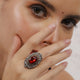 The Kalliski Oxidized Victorian Charm Ring is a captivating masterpiece, featuring a striking deep red gemstone that radiates passion and elegance. Encased in an ornate oxidized silver setting with intricate vintage-inspired detailing, this ring exudes timeless charm and regal sophistication. A bold statement piece, perfect for those who appreciate classic beauty with a touch of old-world grandeur.