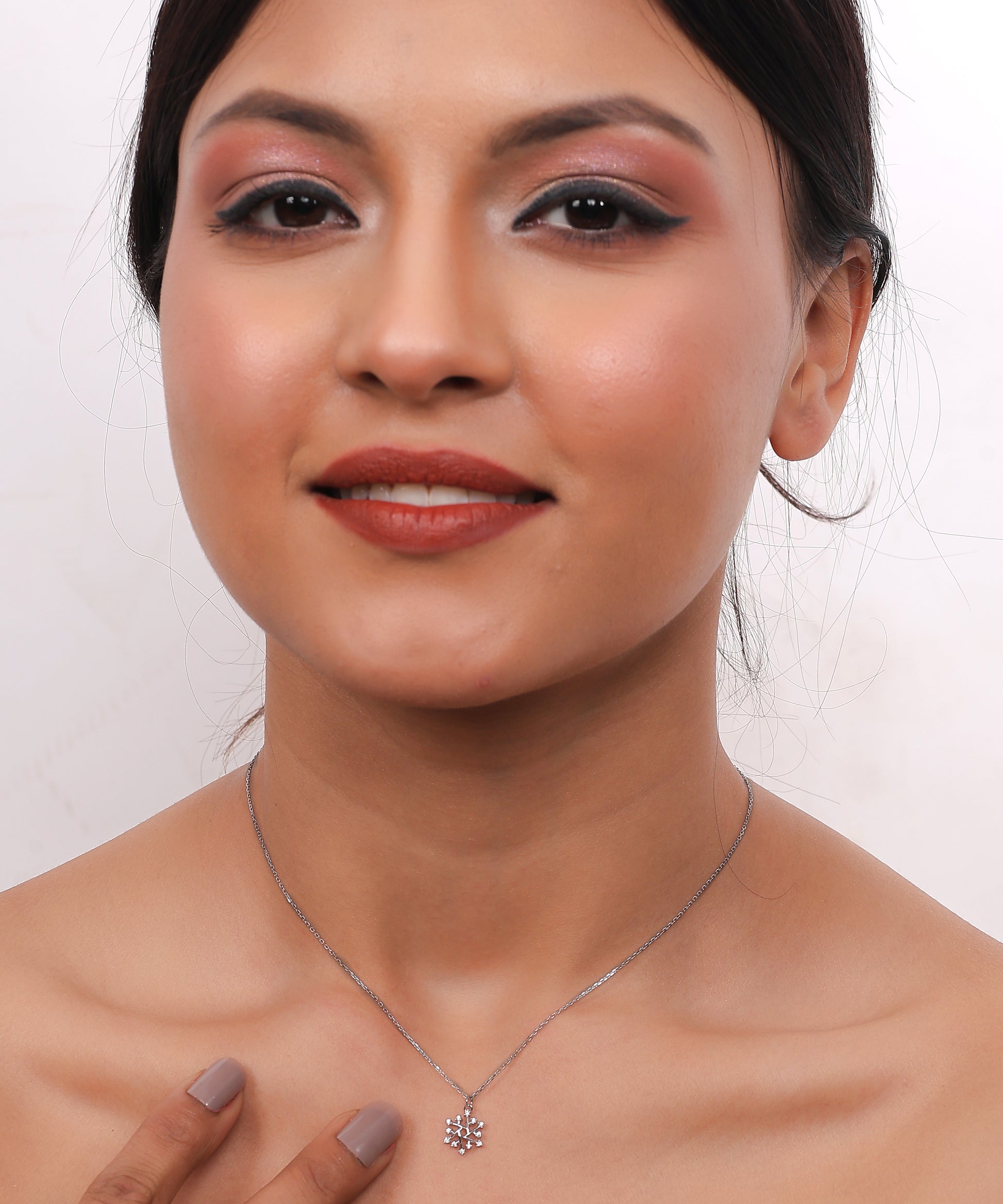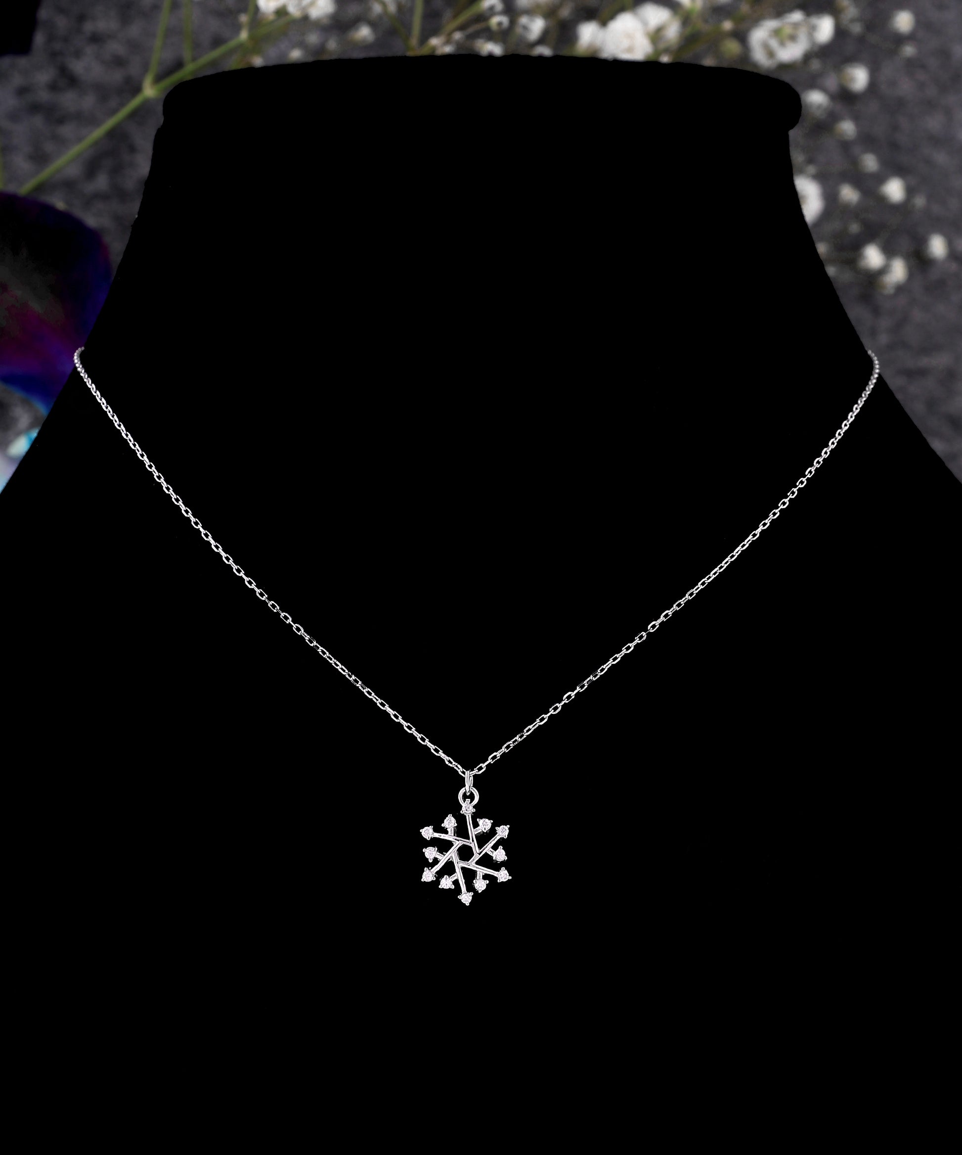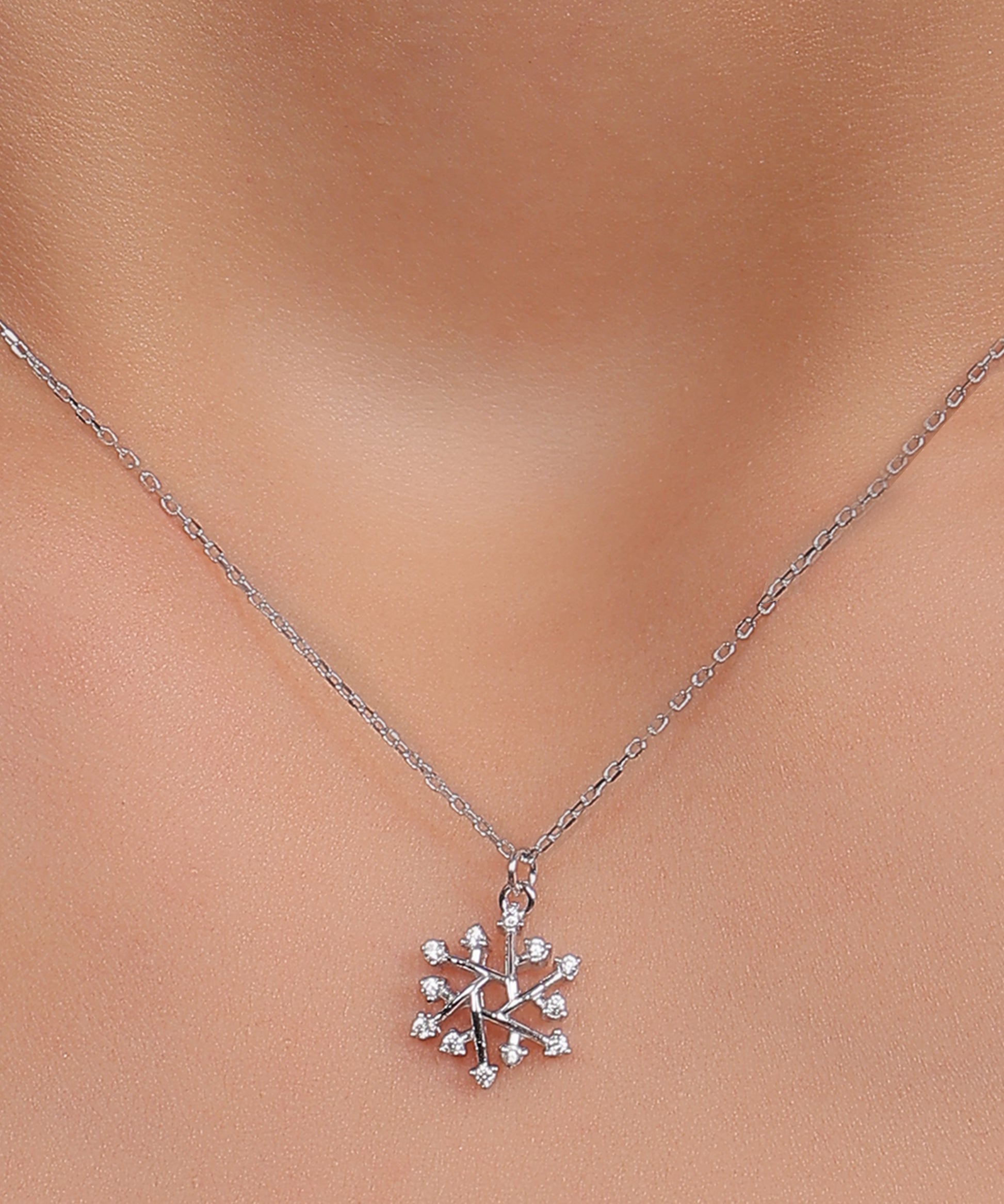The Kalliski Silver Winter Sparkle Pendant is a delicate and elegant piece, featuring a beautifully crafted snowflake design adorned with shimmering crystals. The intricate details and radiant silver finish capture the essence of winter's charm, making it a timeless accessory to add a touch of sparkle and sophistication to any outfit.